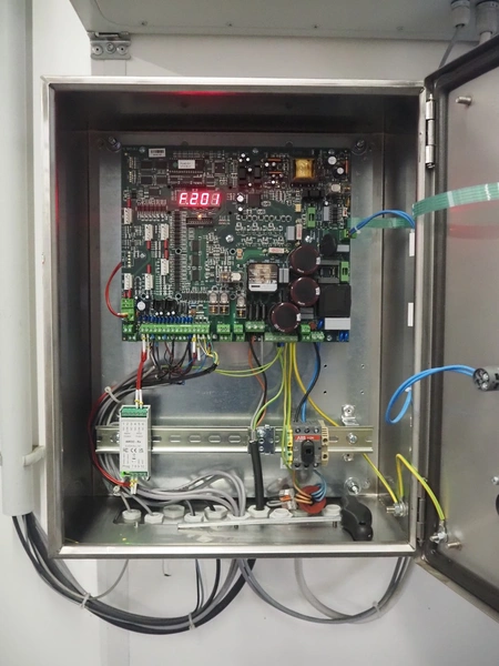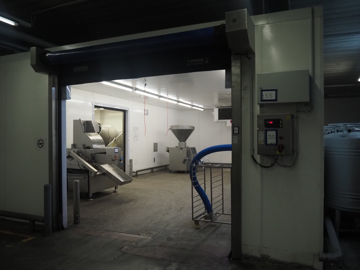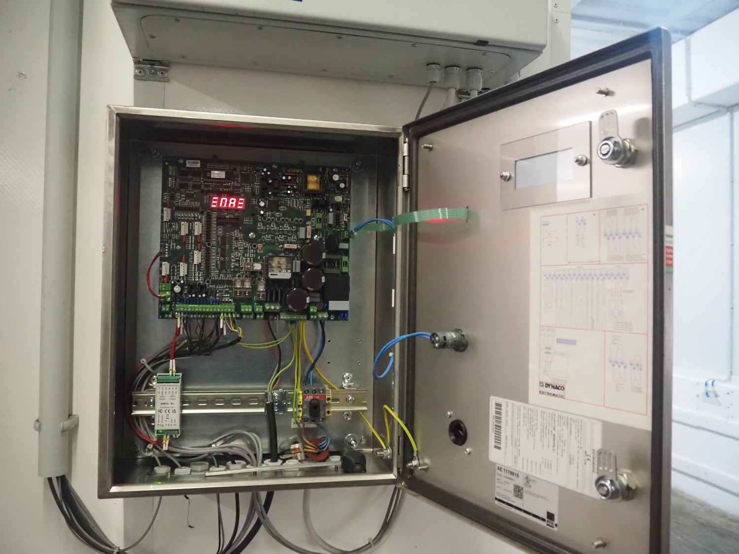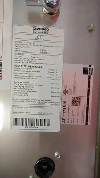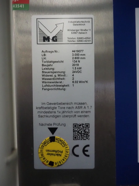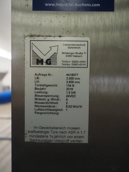 Dynaco electric high speed shutter door, door type: Power M2, serial number: NL60666, year of construction: 07-2019, dimensions door: 3000 mm x 2680 mm, dimensions switch cabinet: 400 mm x 230 mm x 500 mm and 600 mm x 200 mm x 380 mm.