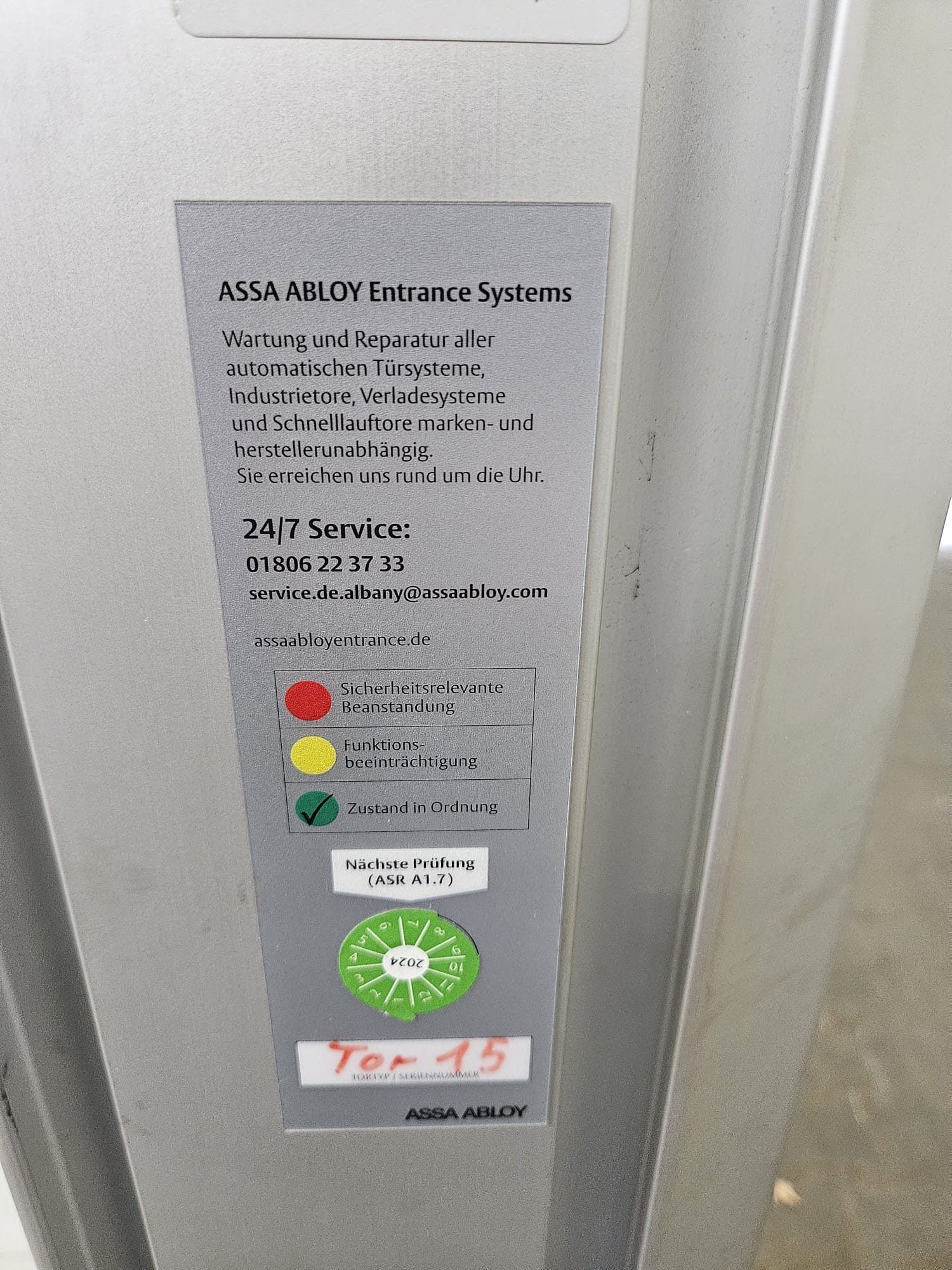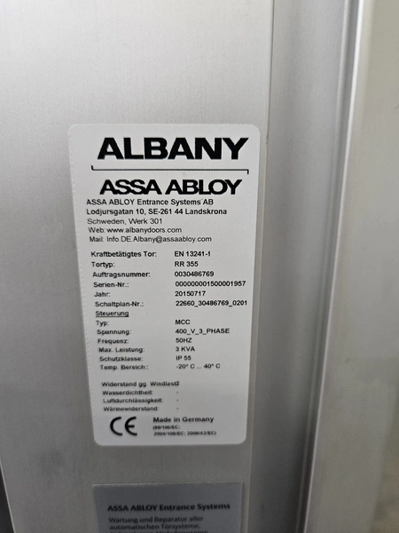 Albany Assa Abloy electrical high speed shutter door, door type: RR 355, serial number: 000000001500001957, year of construction: 2015.07.17, 400 V 3 Ph, 50 Hz, 3 KVA, door dimensions: 3000 mm x 2950 mm.
