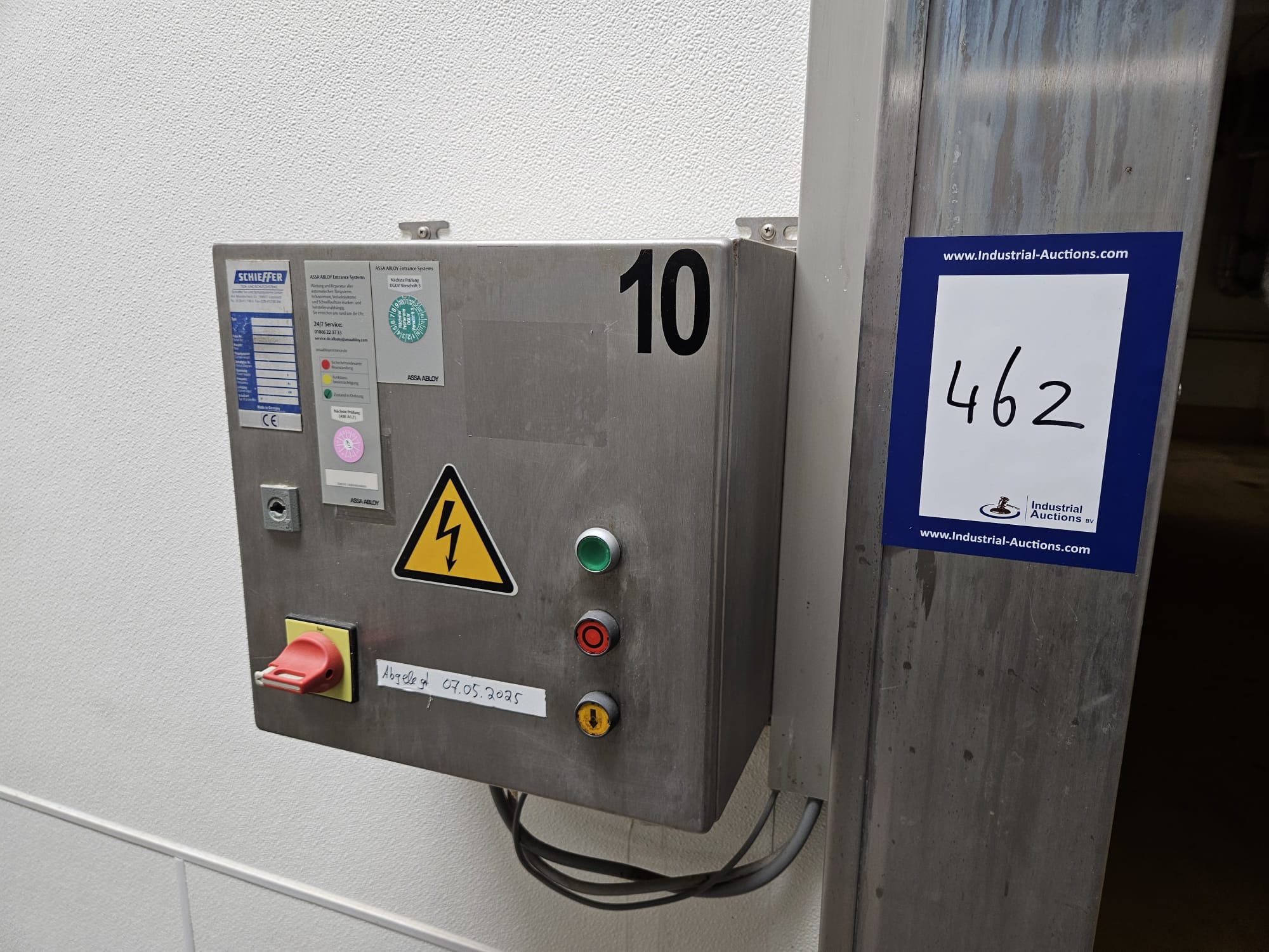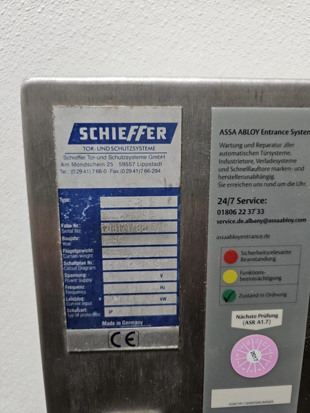 Schieffer high speed shutter door, type: Roll 350 E, serial number: 108121/98/1/1, year of construction: 1998, 400 V, 50 Hz, 0.75 kW, dimensions: 2500 mm x 2450 mm. Technical condition unknown.