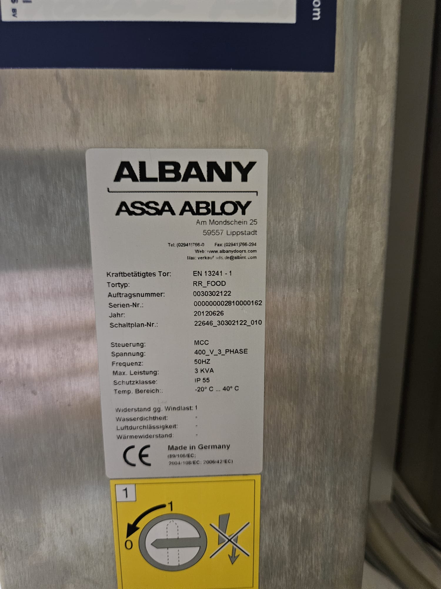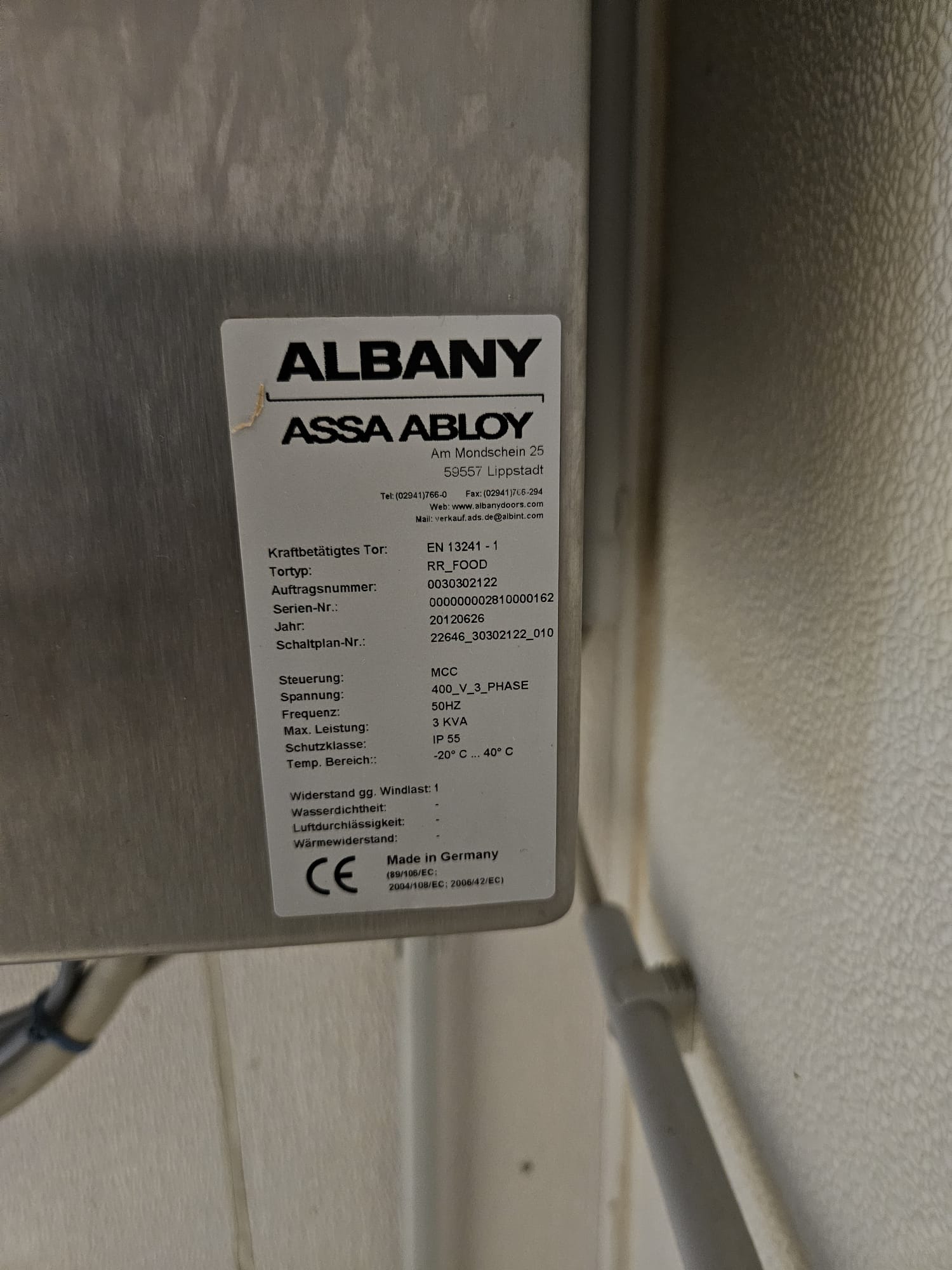 Assa Abloy high speed shutter door, type: RR_Food, year of construction: 2012, 400 V, 3 Ph, 50 Hz, dimensions: 2220 mm x 2500 mm.