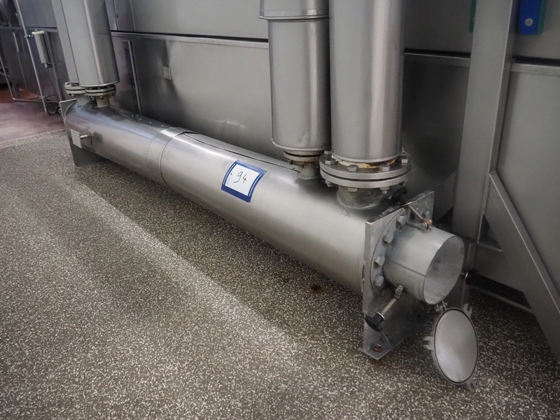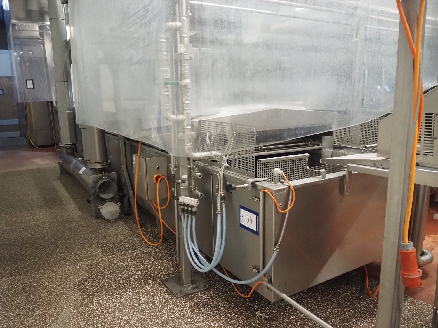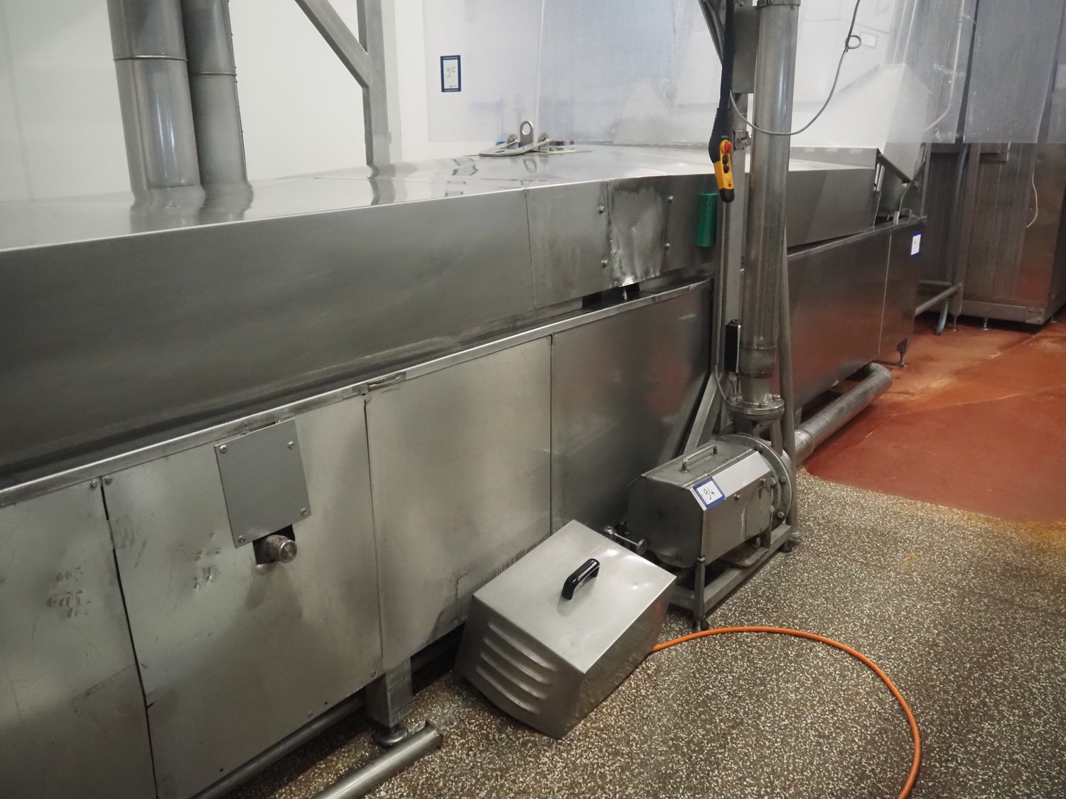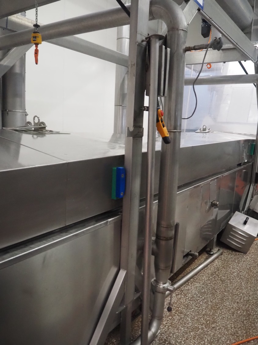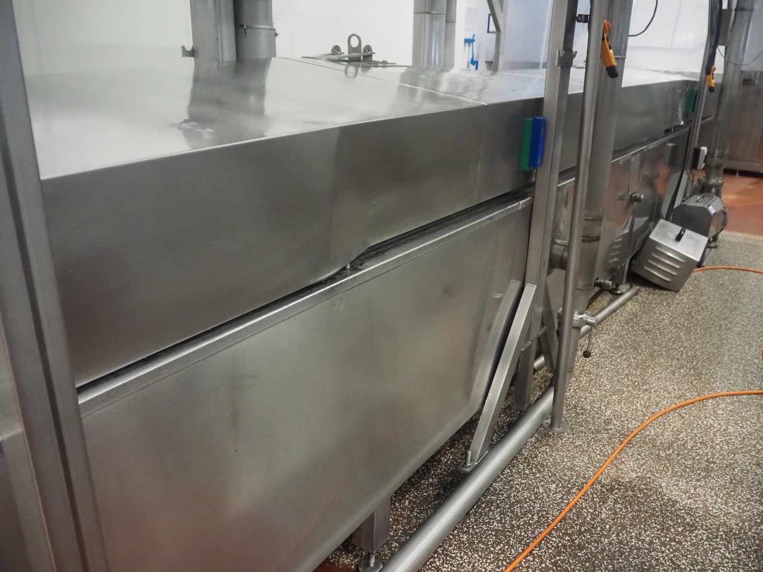 Cooking line, working width: 1400 mm, IGEFA tubular heat exchanger, type: 161U-159-159, fabrication number: 50724, year of construction: 2014, tube: 17 liter, shell: 16 liter, medium: water, efficiency: 380 kW, 2 electrical hoists, total dimensions cooking line: 11000 mm x 2100 mm x 3000 mm, vertical s/s outfeed belt, s/s mesh belt with dividers, belt width: 1200 mm, distance between dividers: 200 mm, divider height: 85 mm, elevating height: 4300 mm.