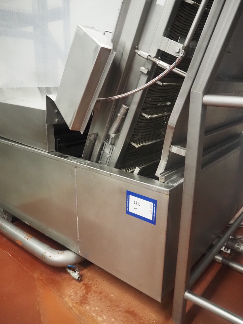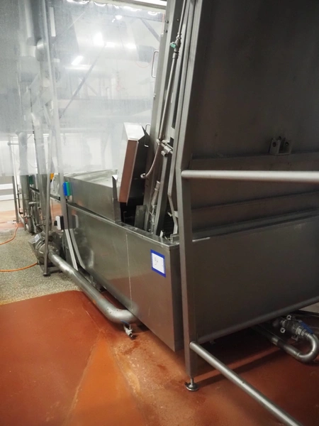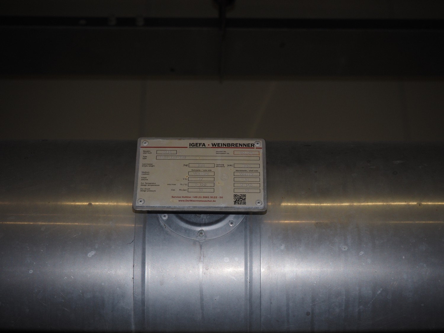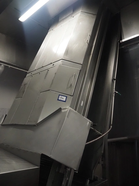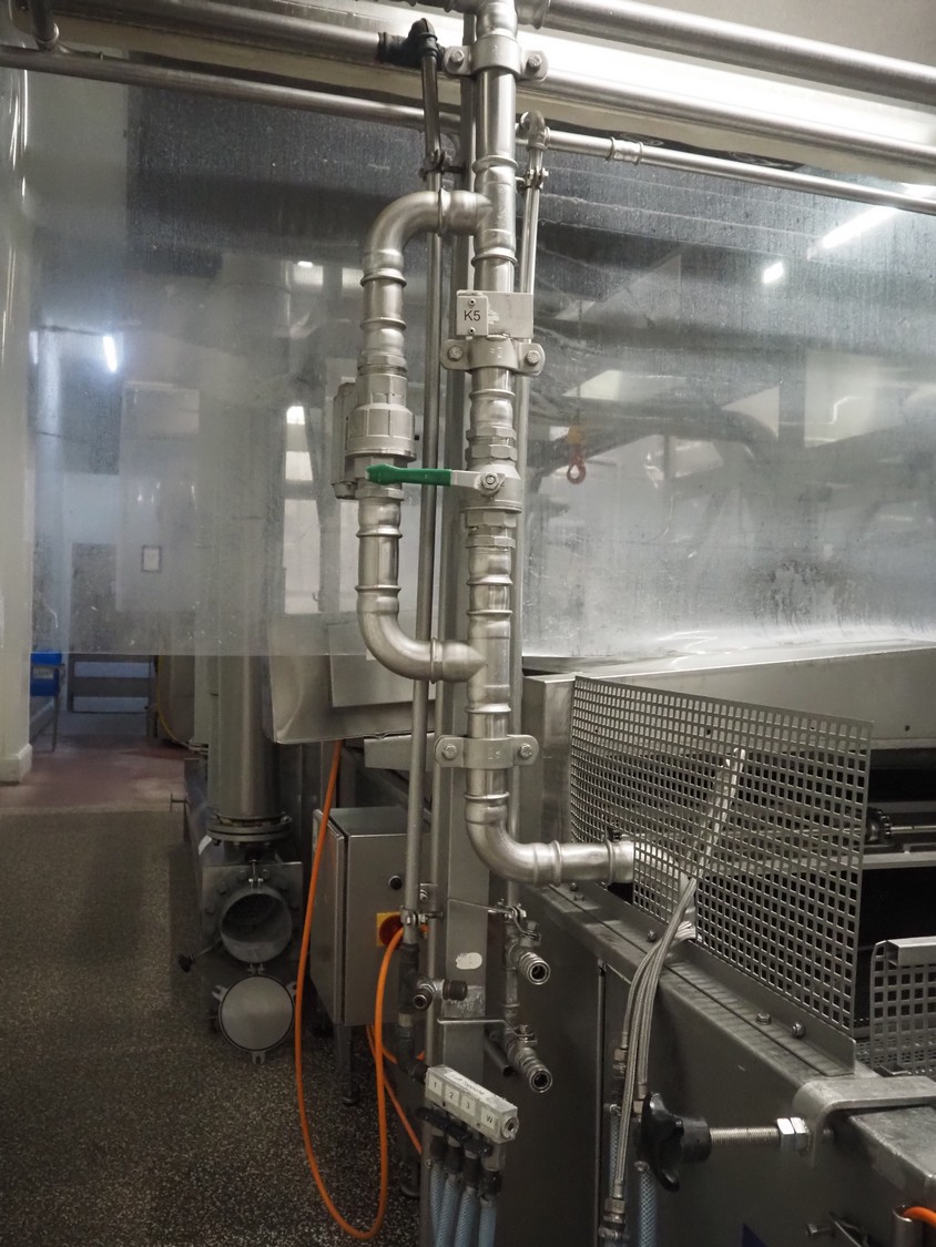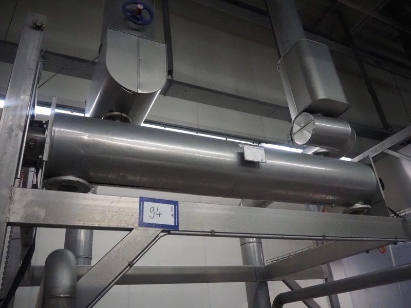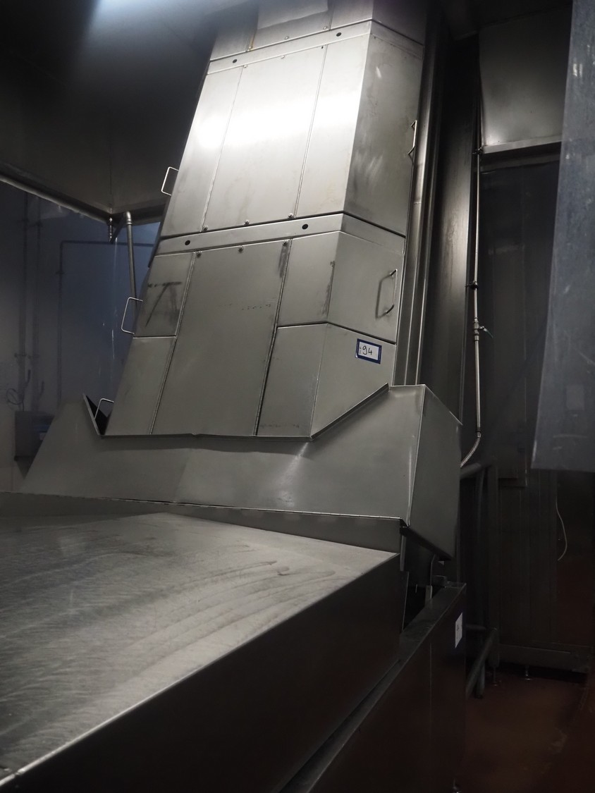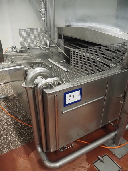 Cooking line, working width: 1400 mm, IGEFA tubular heat exchanger, type: 161U-159-159, fabrication number: 50724, year of construction: 2014, tube: 17 liter, shell: 16 liter, medium: water, efficiency: 380 kW, 2 electrical hoists, total dimensions cooking line: 11000 mm x 2100 mm x 3000 mm, vertical s/s outfeed belt, s/s mesh belt with dividers, belt width: 1200 mm, distance between dividers: 200 mm, divider height: 85 mm, elevating height: 4300 mm.