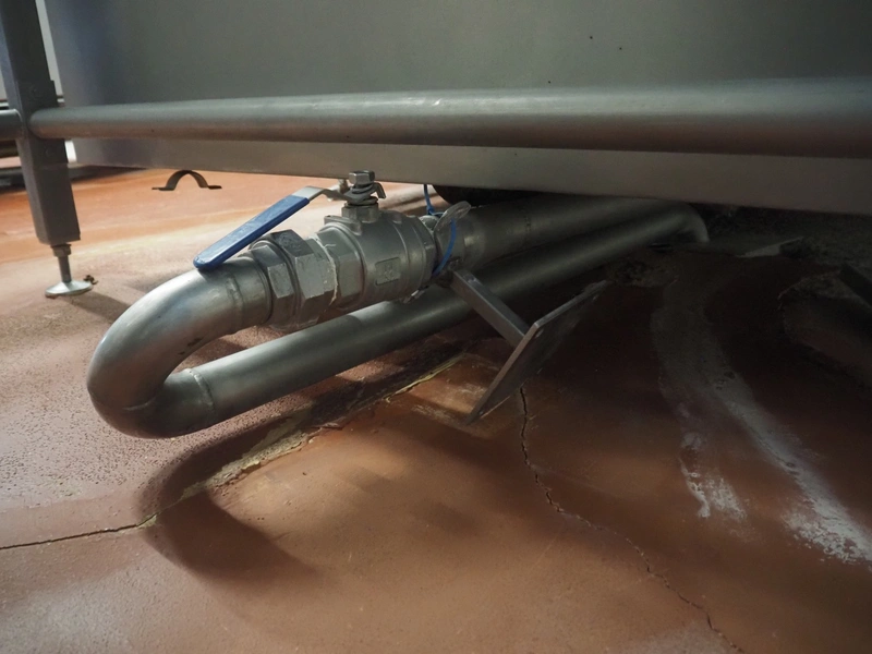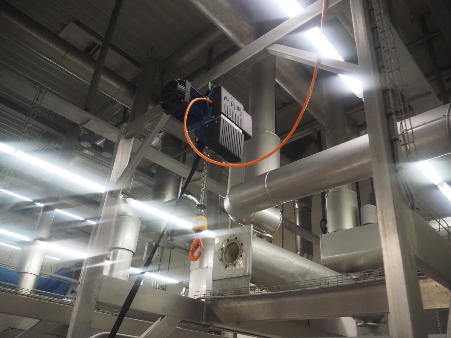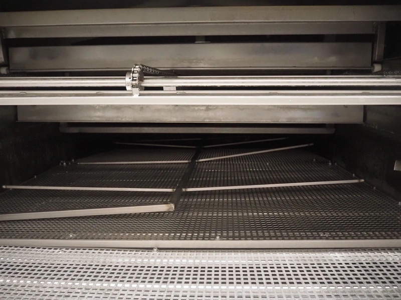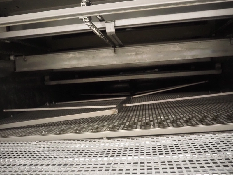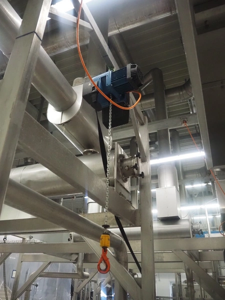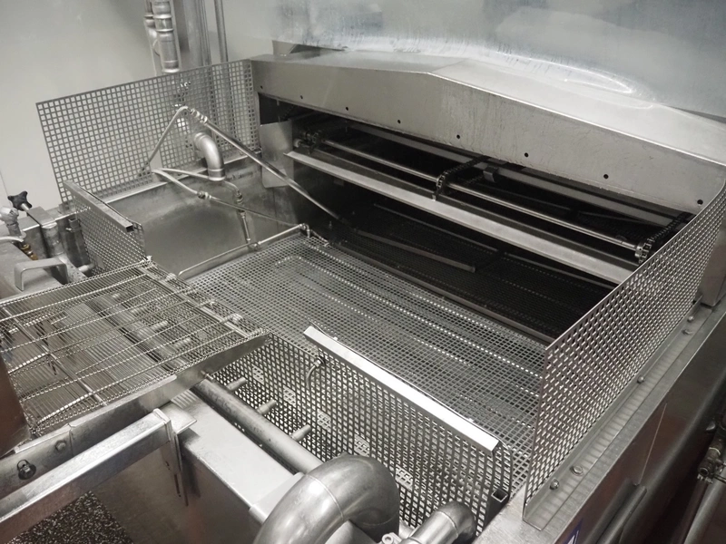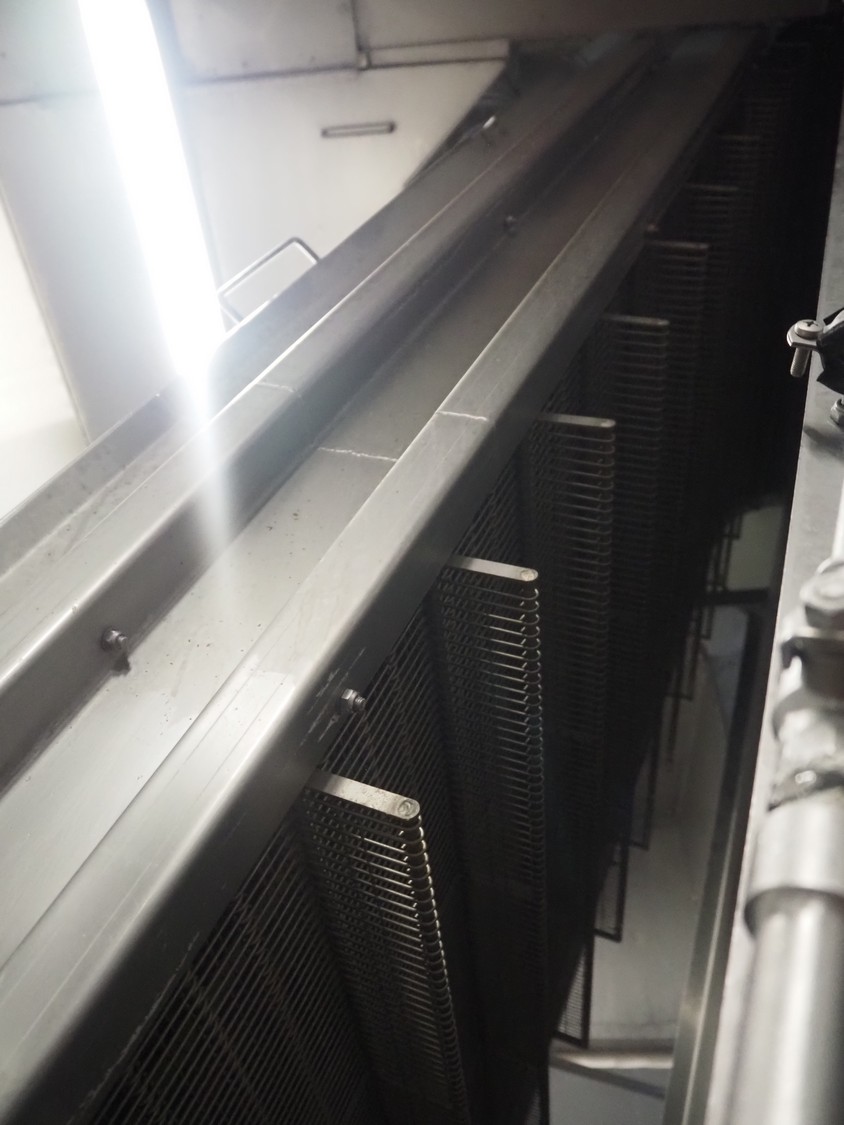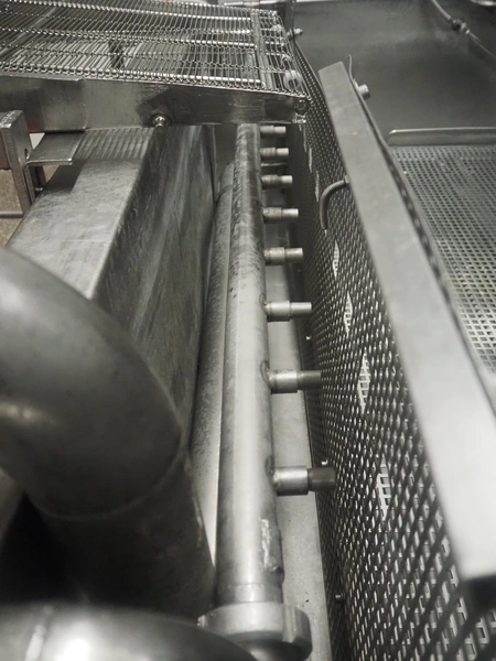 Cooking line, working width: 1400 mm, IGEFA tubular heat exchanger, type: 161U-159-159, fabrication number: 50724, year of construction: 2014, tube: 17 liter, shell: 16 liter, medium: water, efficiency: 380 kW, 2 electrical hoists, total dimensions cooking line: 11000 mm x 2100 mm x 3000 mm, vertical s/s outfeed belt, s/s mesh belt with dividers, belt width: 1200 mm, distance between dividers: 200 mm, divider height: 85 mm, elevating height: 4300 mm.