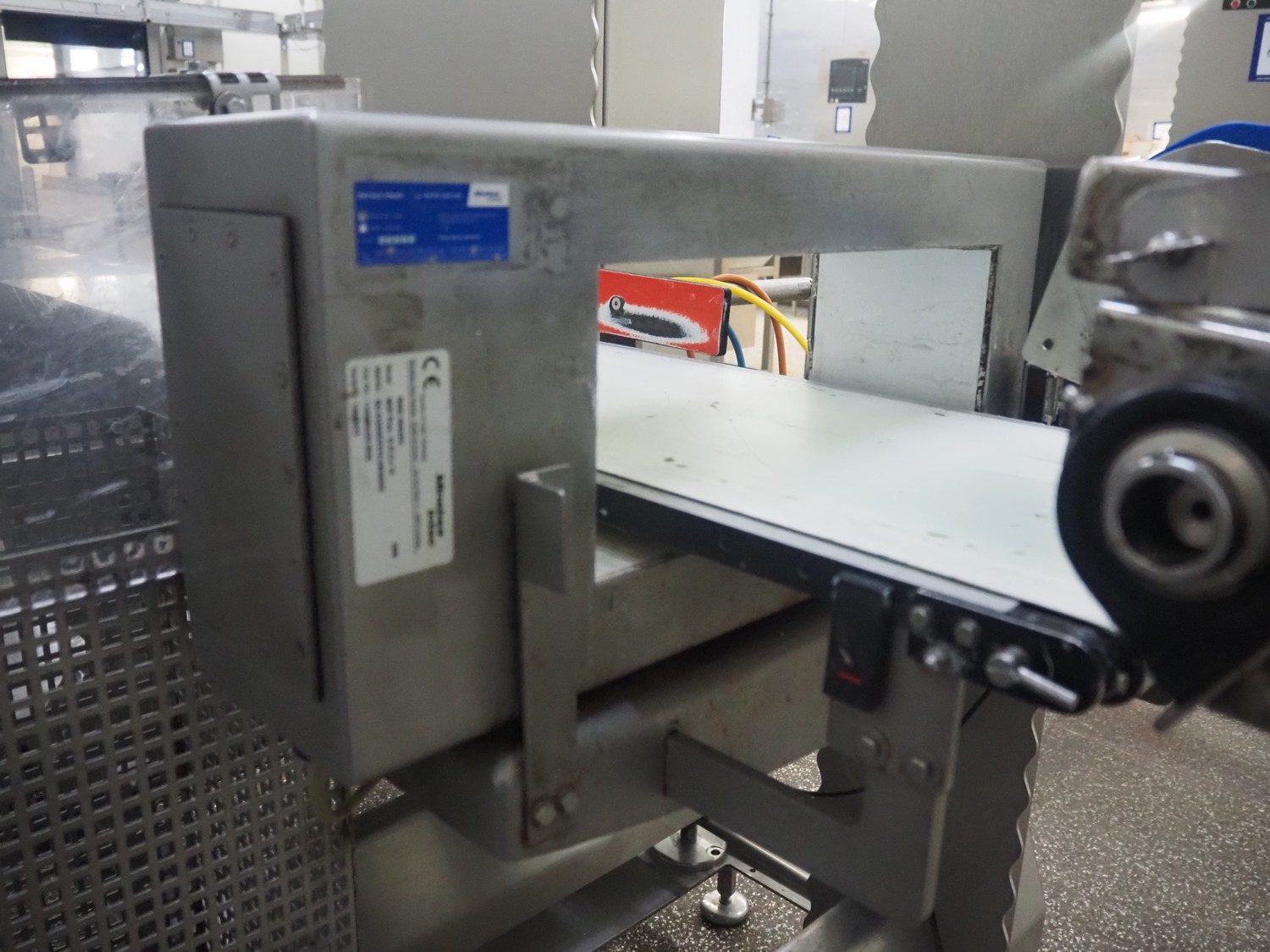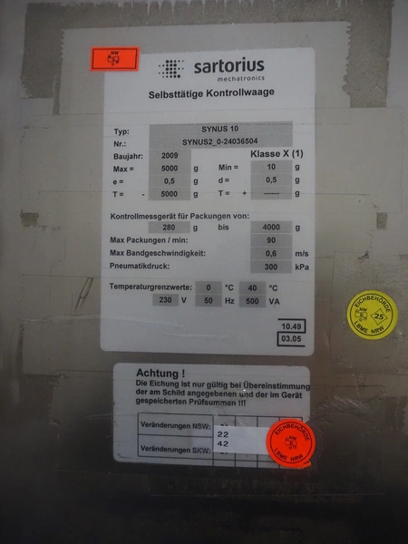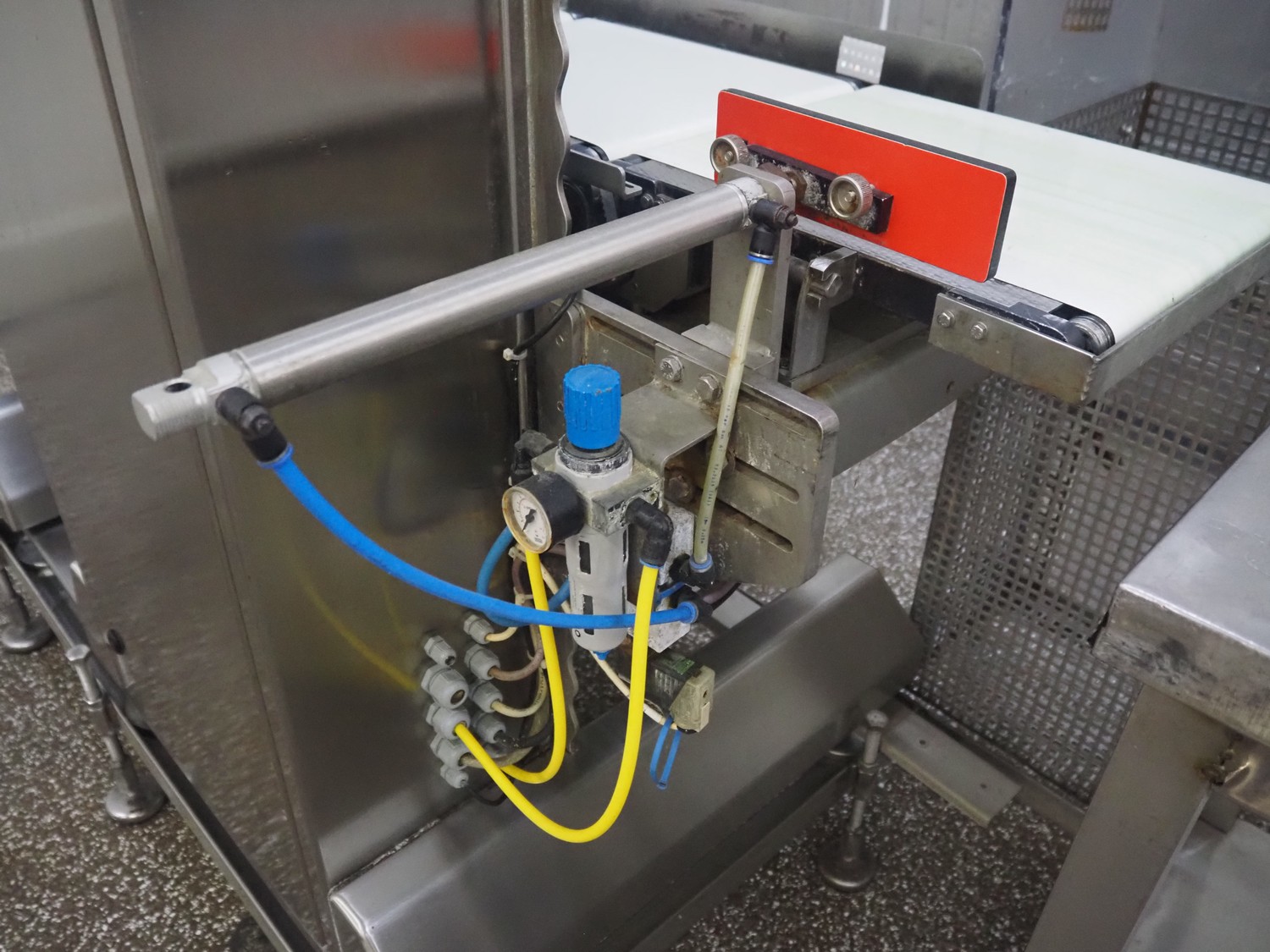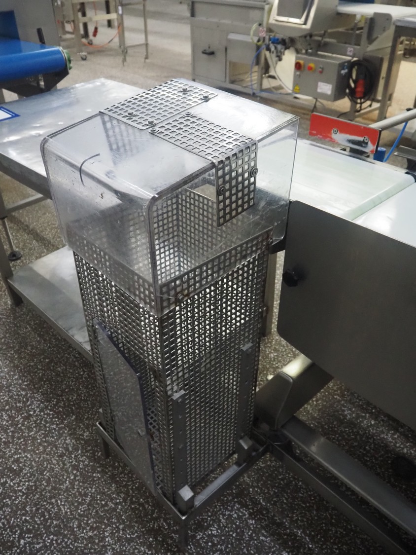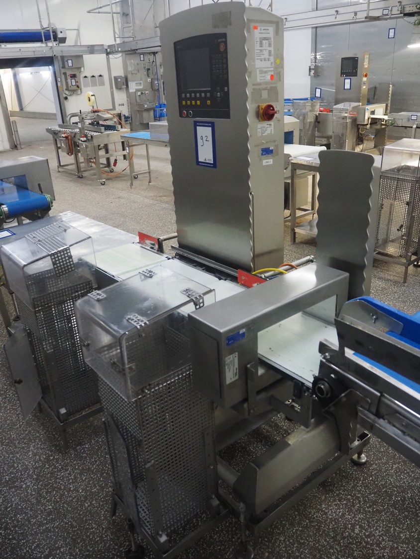 Sartorius / Minebea Intec metal detector with checkweigher with double rejector, model metal detector: MDP Plus - S 37.5 x 15, year of construction: 2009, clearance: 376 mm x 113 mm, Sartorius checkweigher, type: SYNUS 10, number: SYNUS 2_0-24036504, year of construction: 2009, 230 V, 50 Hz, maximum: 5000 gram, minimum: 10 gram, e = 0.5 gram, plastic belt, belt width: 300 mm, total dimensions: 1600 mm x 1050 mm x 2000 mm.