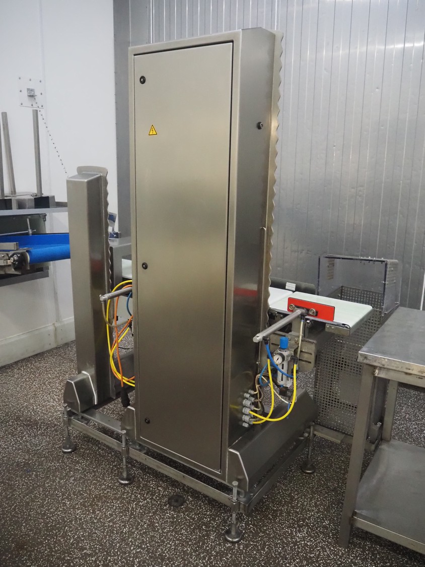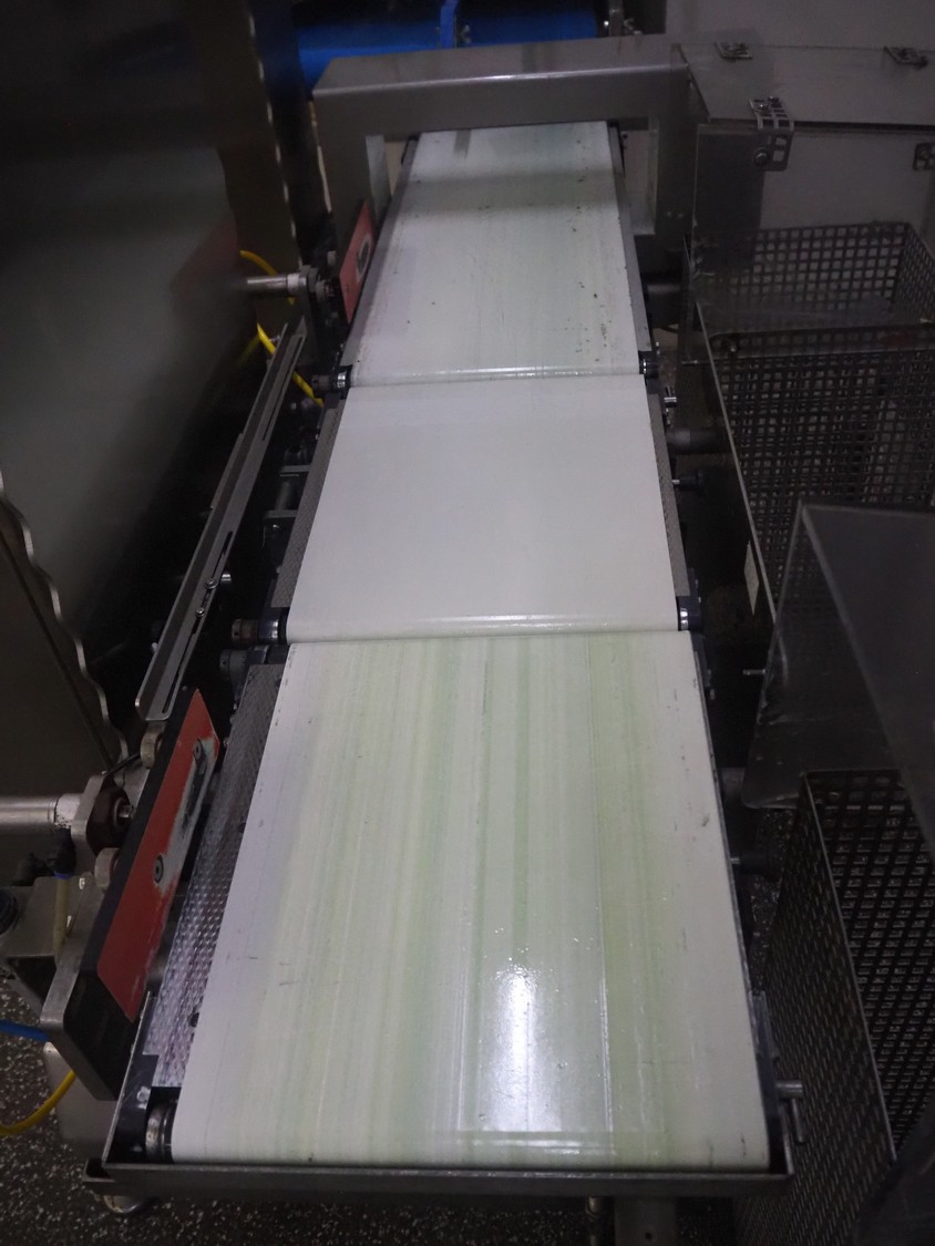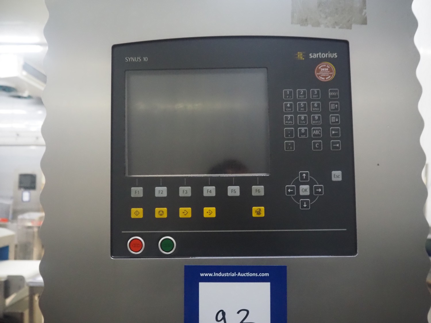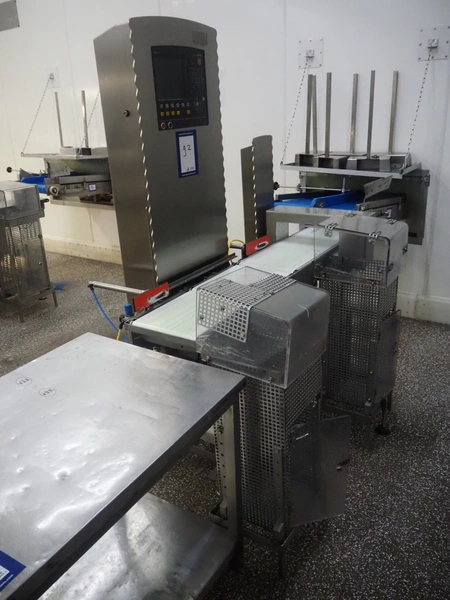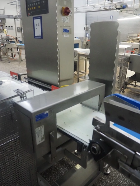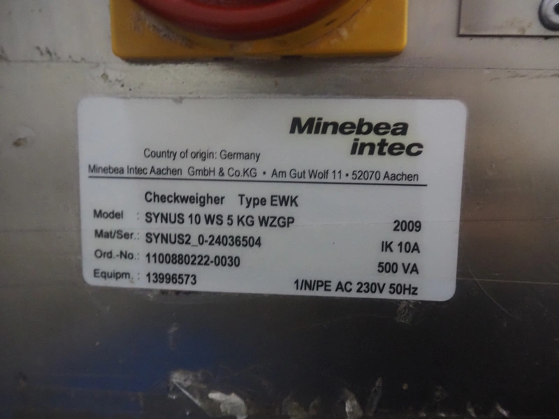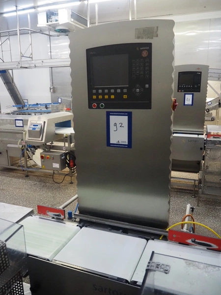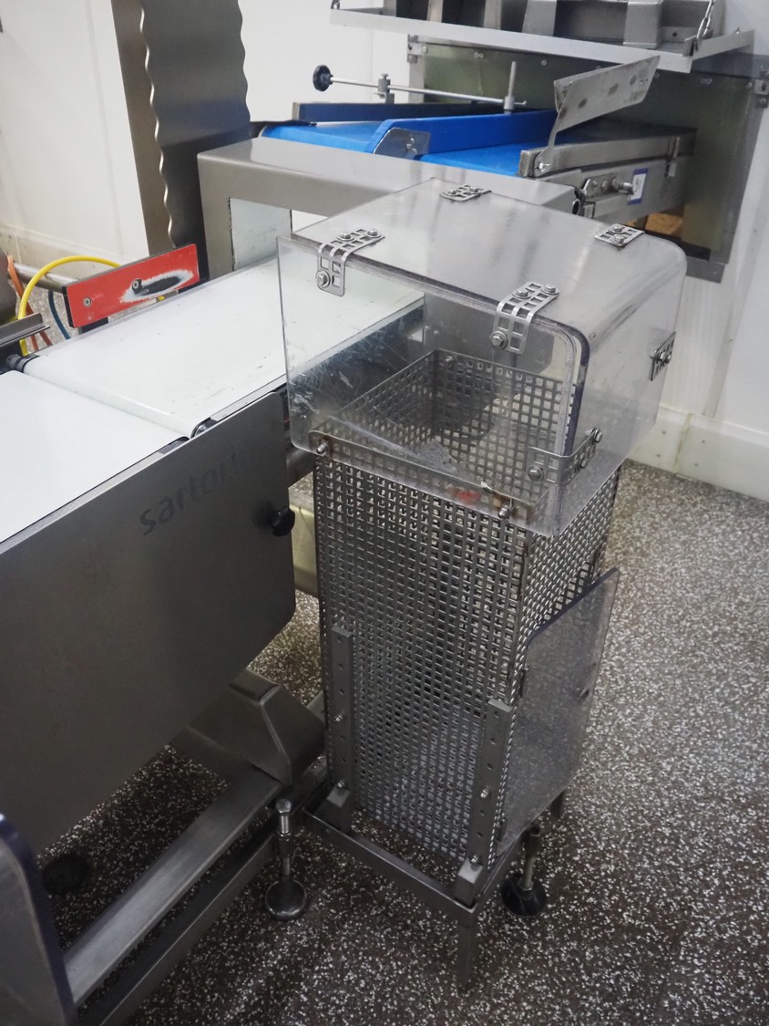 Sartorius / Minebea Intec metal detector with checkweigher with double rejector, model metal detector: MDP Plus - S 37.5 x 15, year of construction: 2009, clearance: 376 mm x 113 mm, Sartorius checkweigher, type: SYNUS 10, number: SYNUS 2_0-24036504, year of construction: 2009, 230 V, 50 Hz, maximum: 5000 gram, minimum: 10 gram, e = 0.5 gram, plastic belt, belt width: 300 mm, total dimensions: 1600 mm x 1050 mm x 2000 mm.