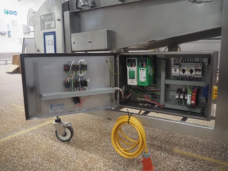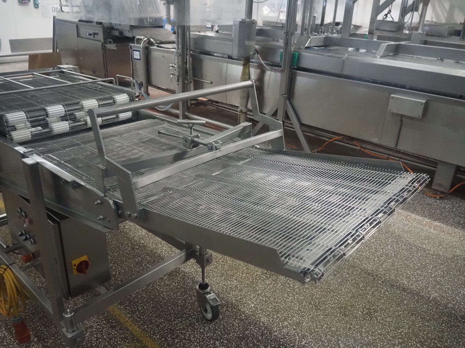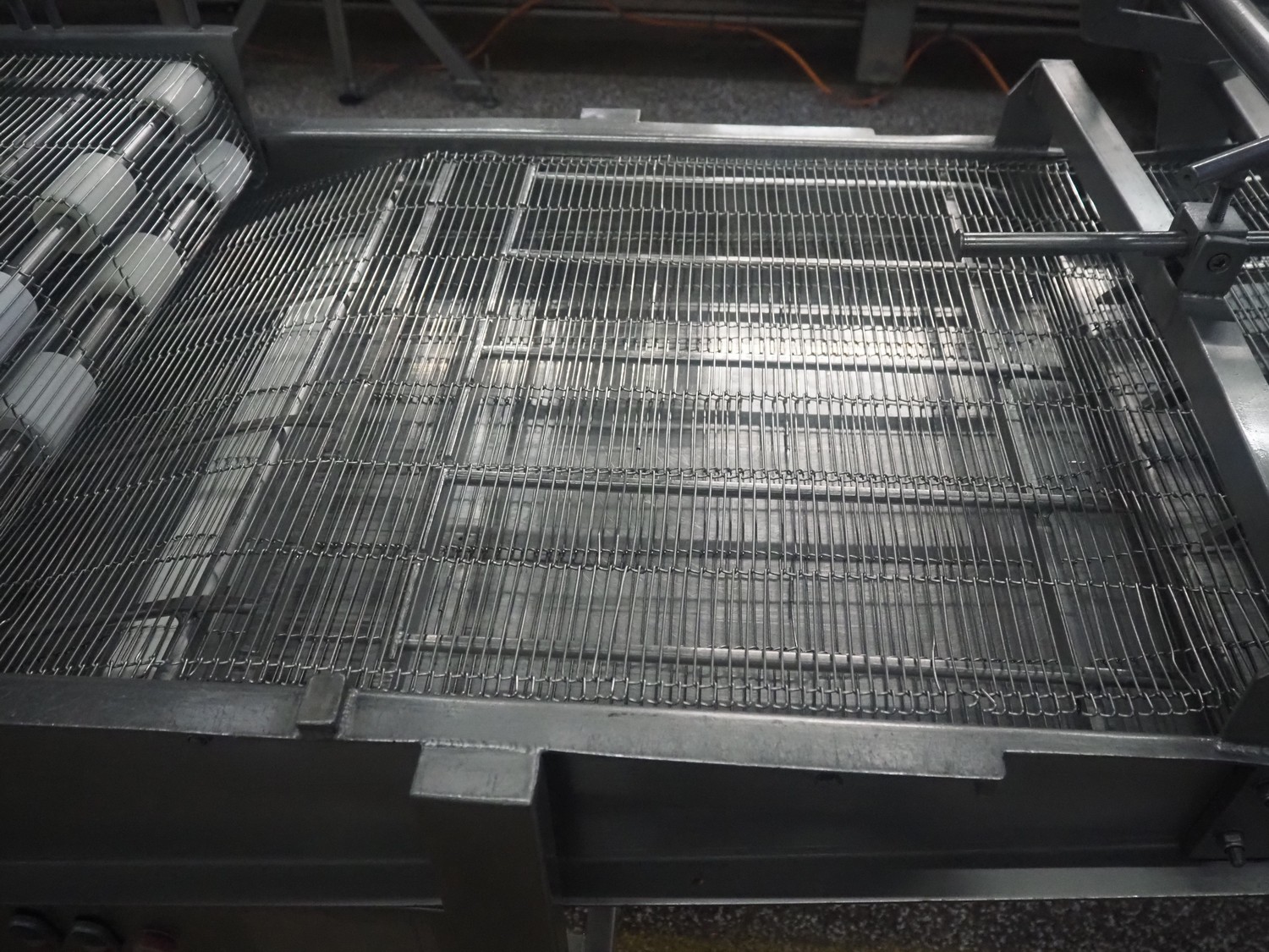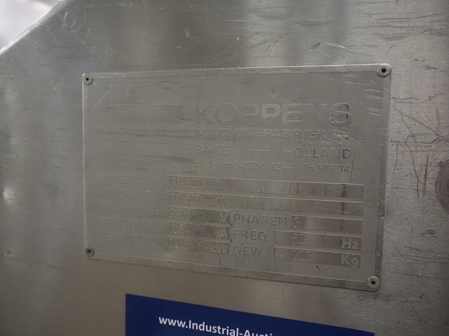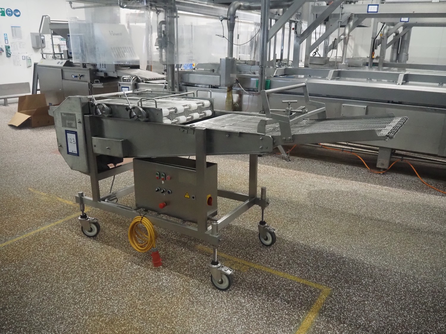 Koppens Machinefabriek B.V. mobile tempura dipper, type: TD 600, machine number: TD 600-124, 380 V, 3 Ph, 50 Hz, 1.64 A, 0.45 kW, s/s mesh belt, belt width: 600 mm, weight: 200 kg, total dimensions: 2650 mm x 800 mm x 1350 mm.