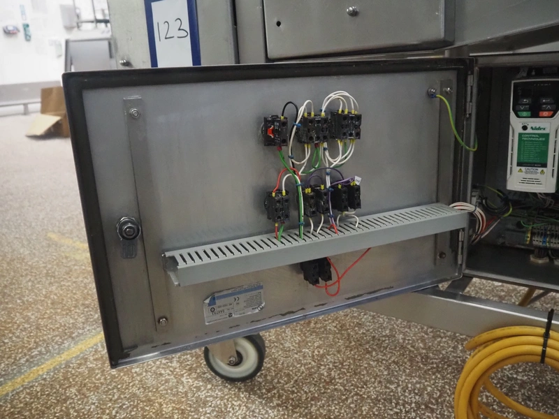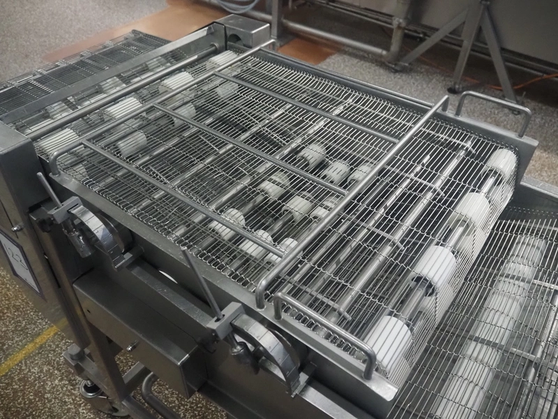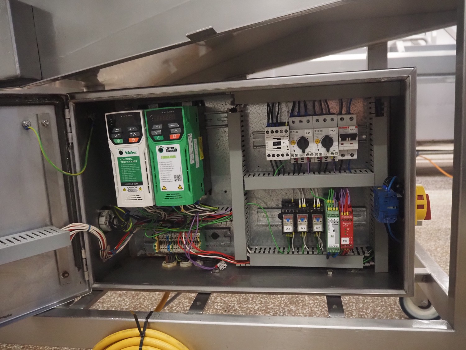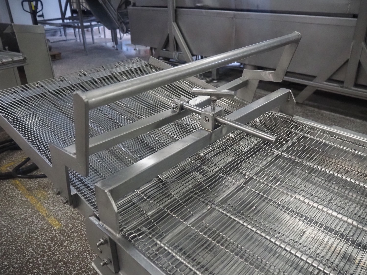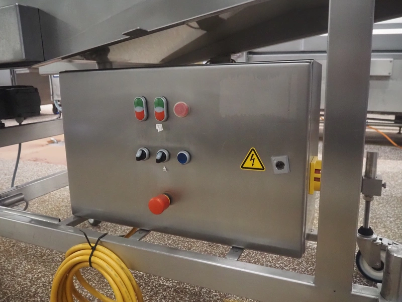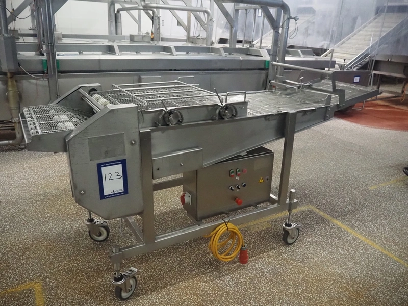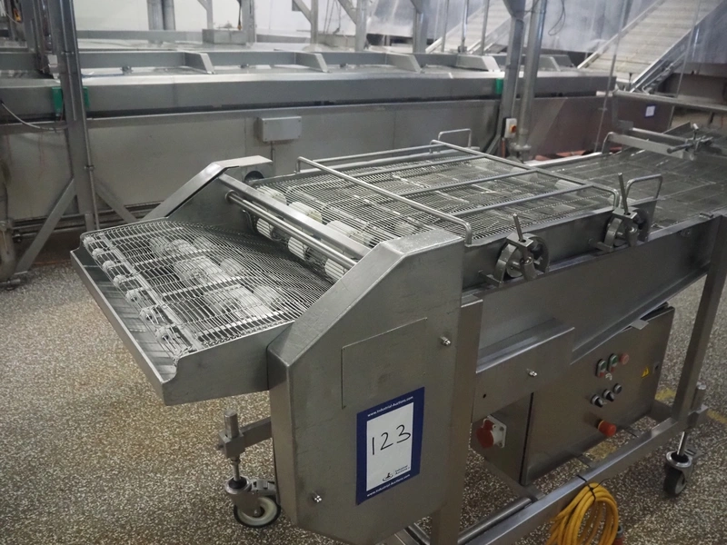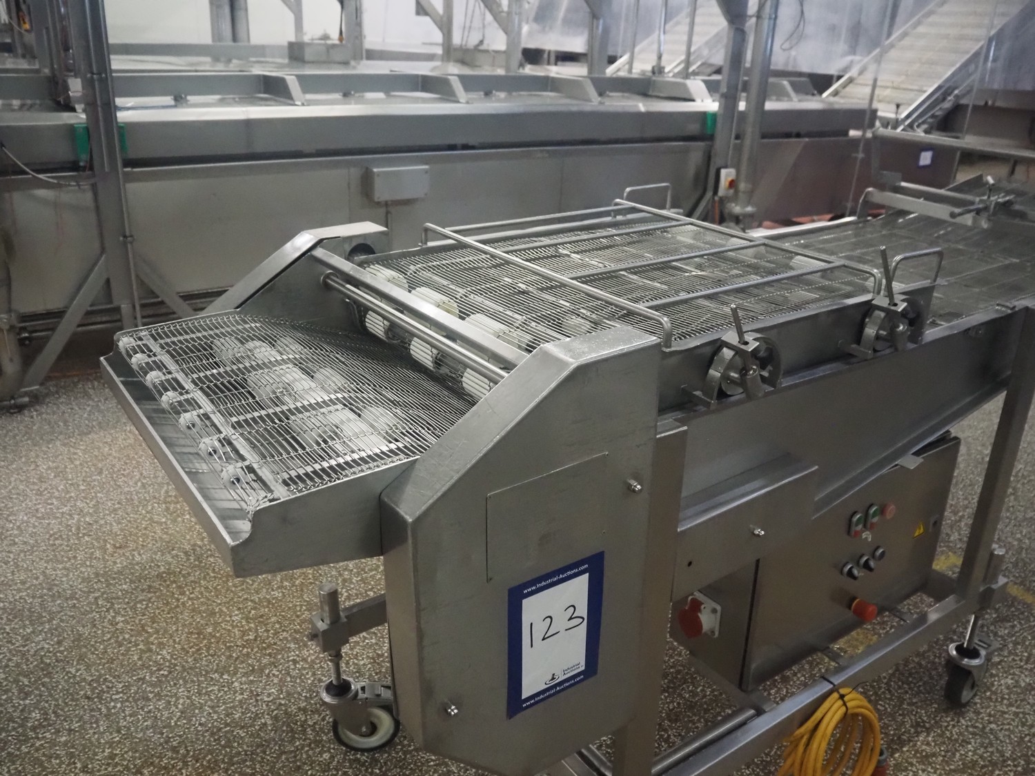 Koppens Machinefabriek B.V. mobile tempura dipper, type: TD 600, machine number: TD 600-124, 380 V, 3 Ph, 50 Hz, 1.64 A, 0.45 kW, s/s mesh belt, belt width: 600 mm, weight: 200 kg, total dimensions: 2650 mm x 800 mm x 1350 mm.