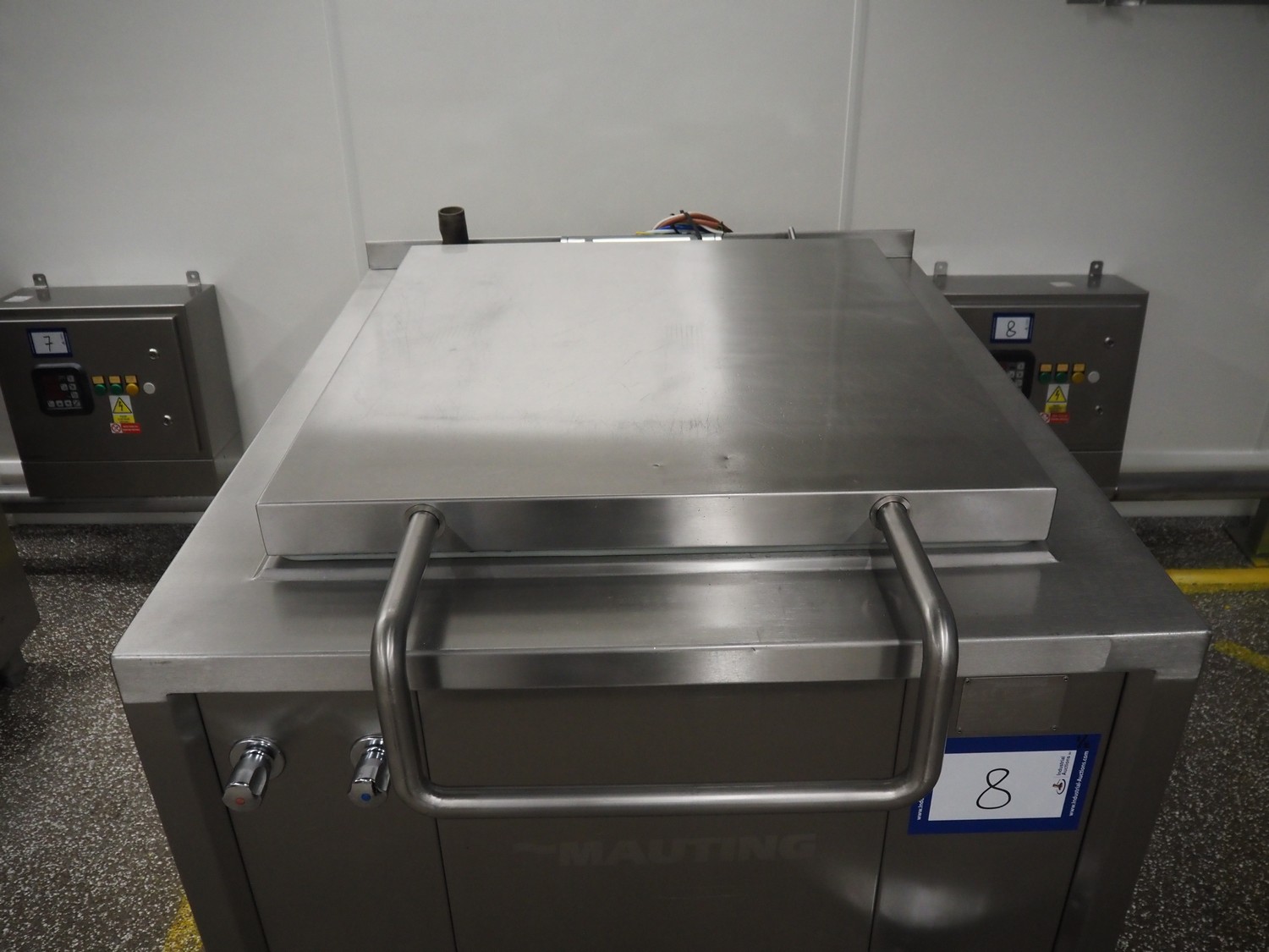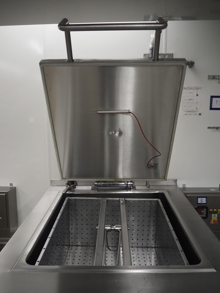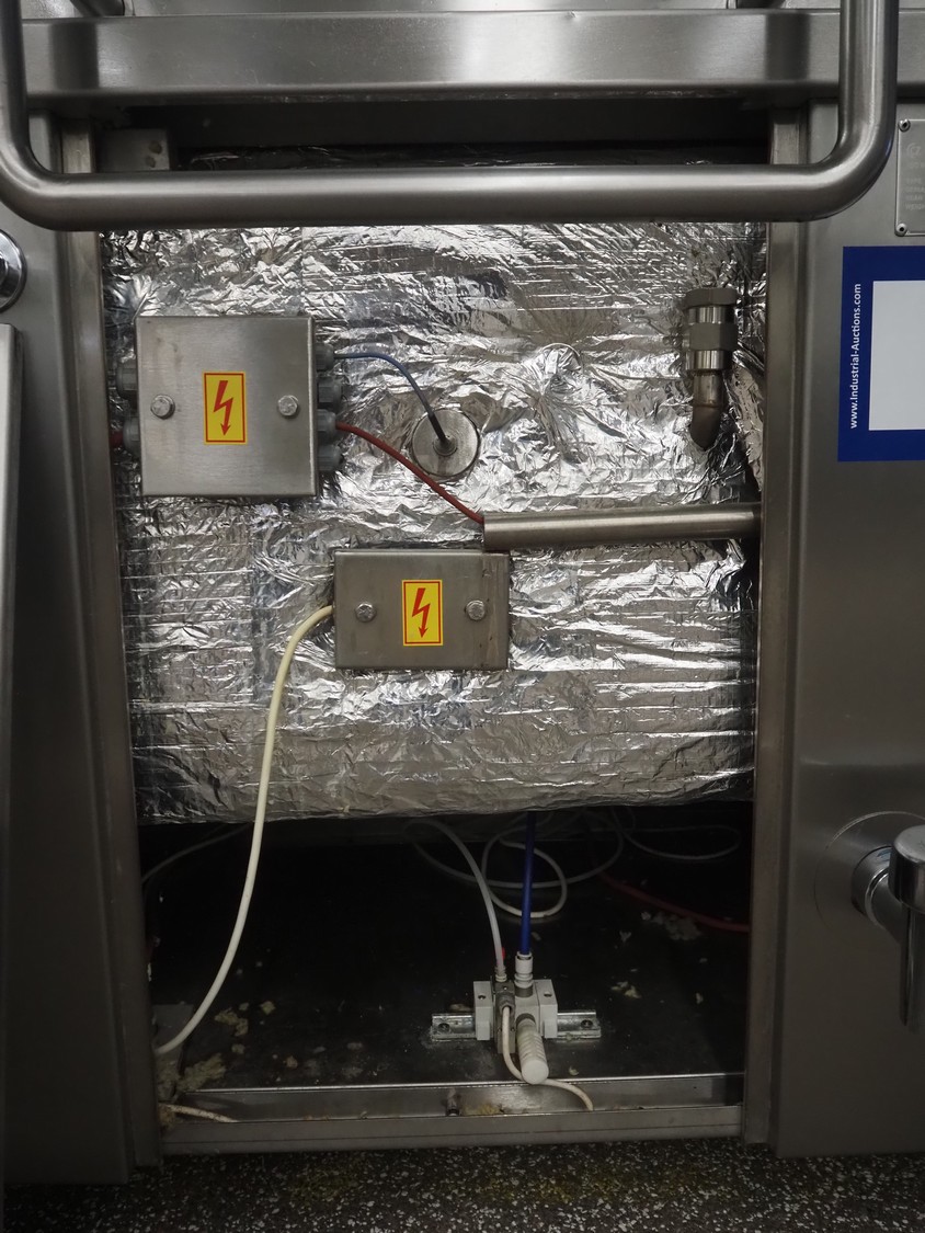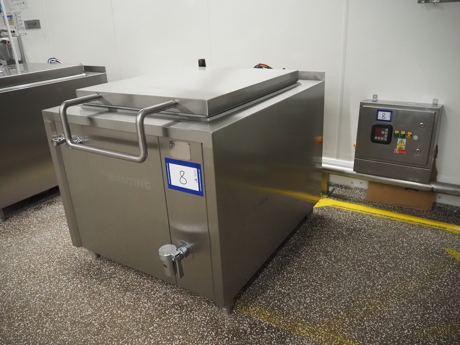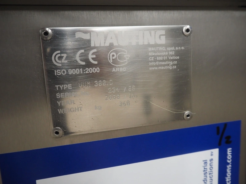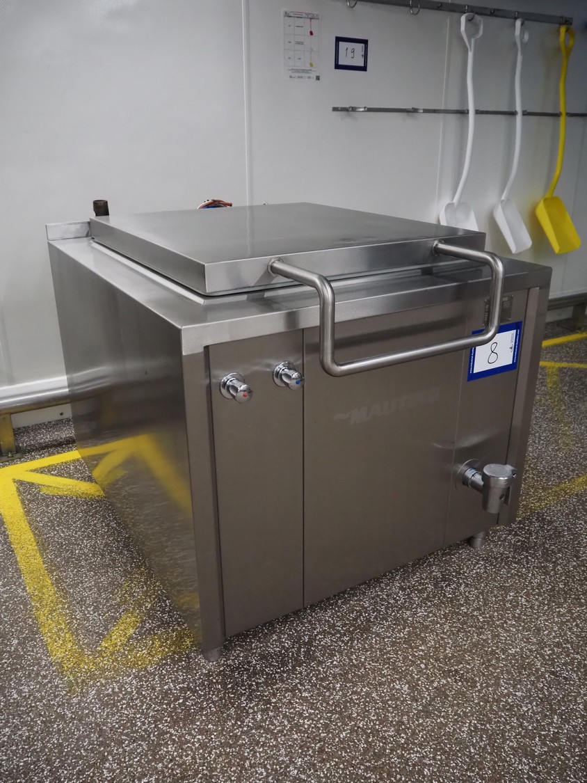 Mauting cooking vessel, type: VVM 300.D, serial number: 234/08, year of construction: 2008, 3 x 400 V, 50 Hz, 0.5 kW, volume: 300 liter, heating: steam 40 kg per hour, inside dimensions: 900 mm x 790 mm x 480 mm, basket size: 830 mm x 700 mm x 430 mm, infeed height: 950 mm, outfeed height: 300 mm, outfeed valve: DN 40, total dimensions: 1400 mm x 1100 mm x 1050 mm. Including control panel, dimensions: 500 mm x 200 mm x 500 mm.
