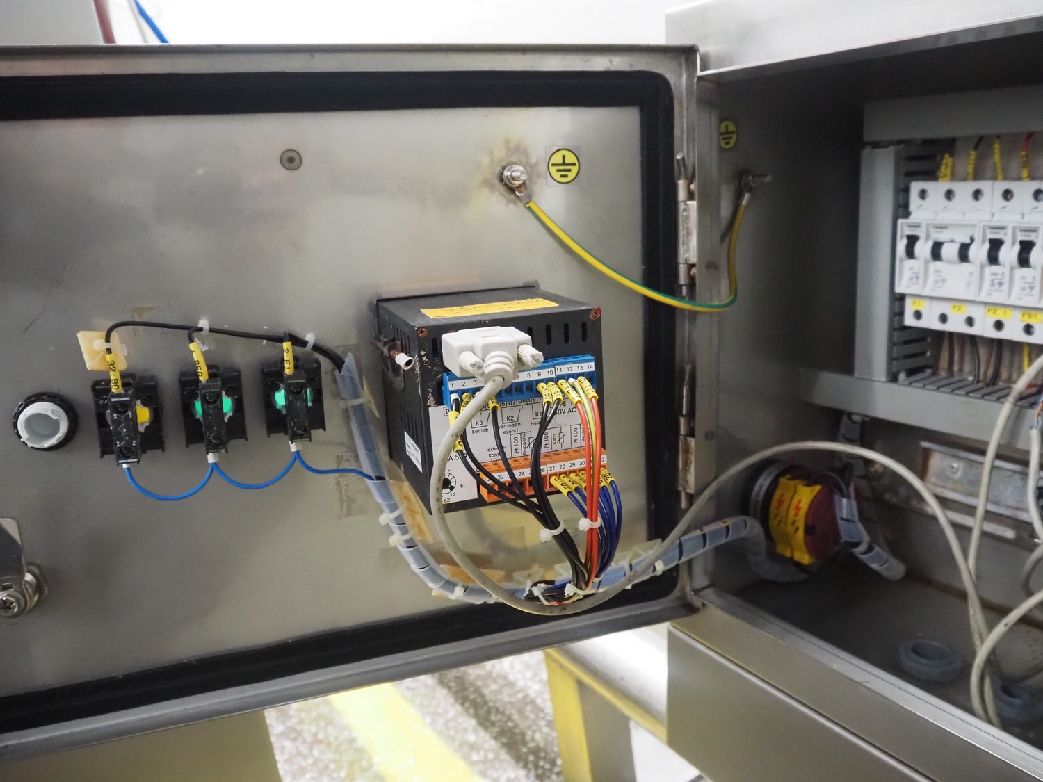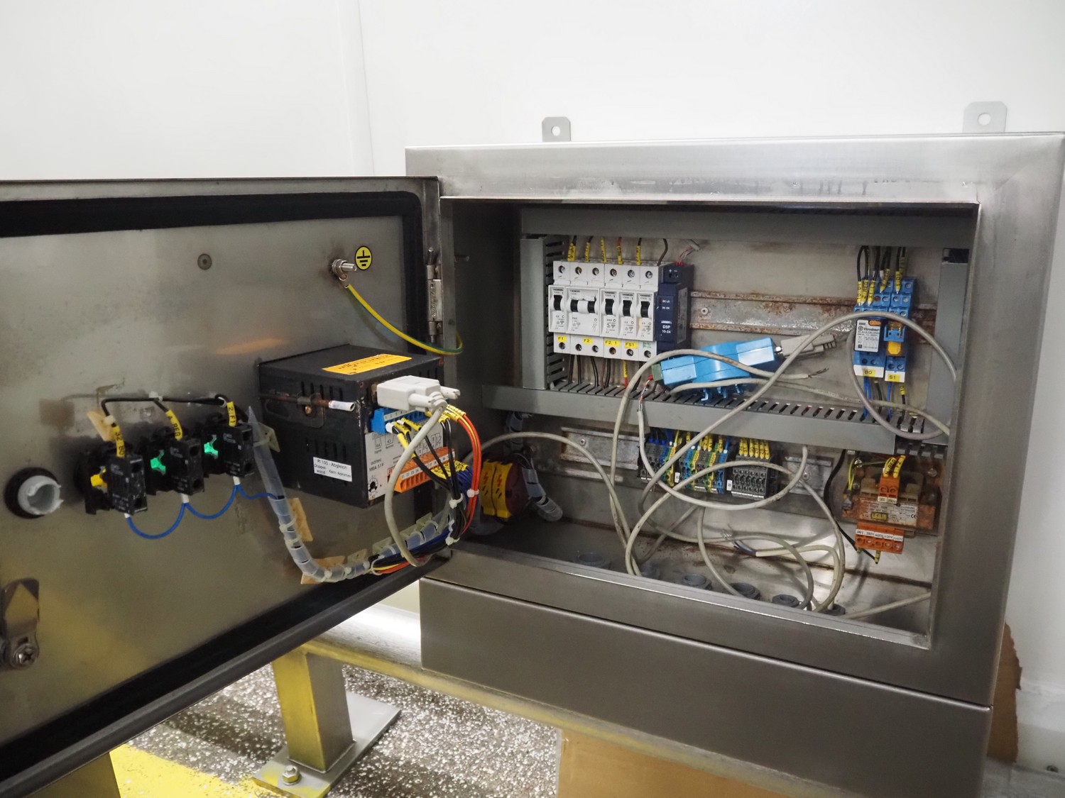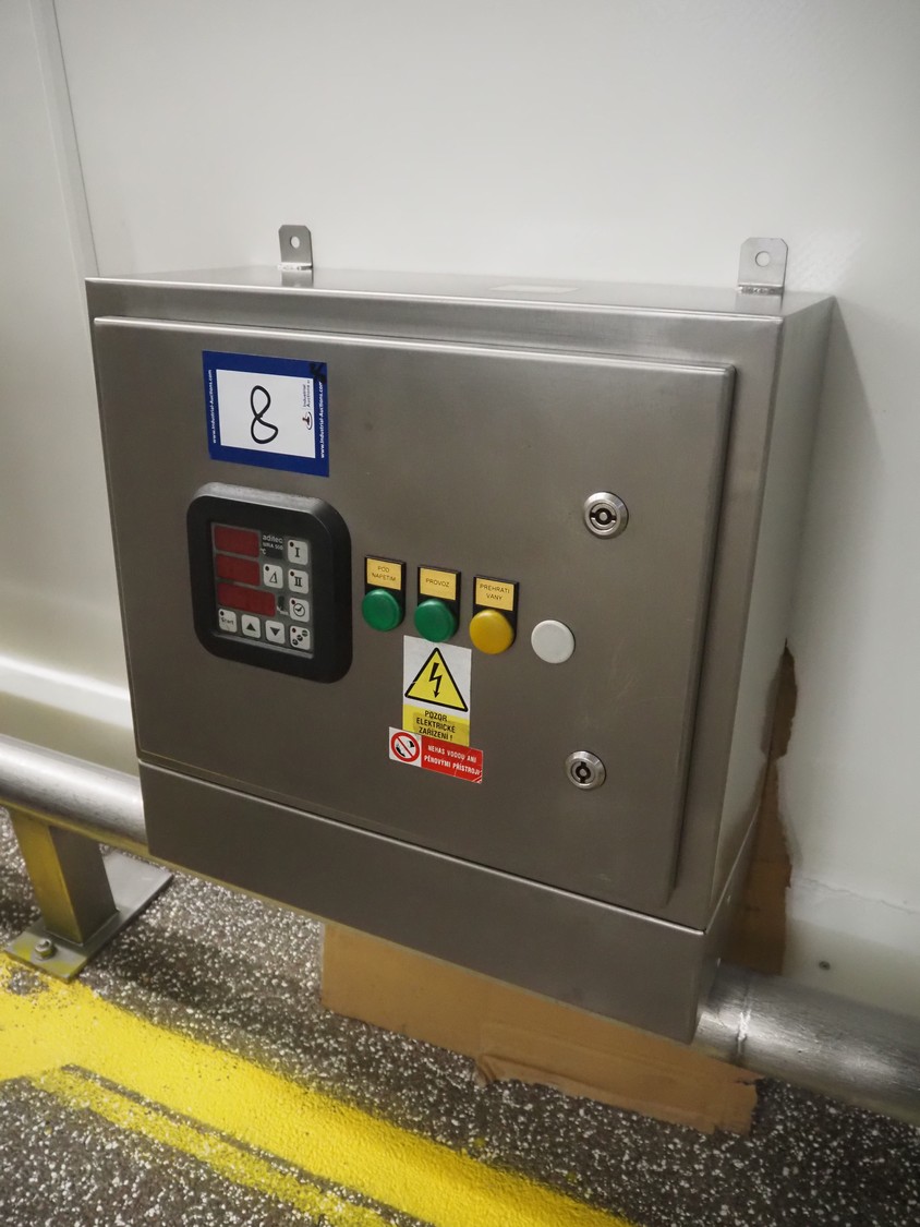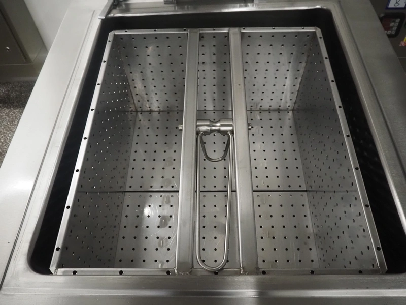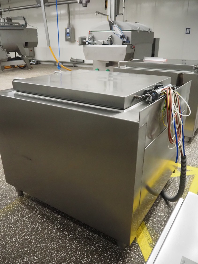 Mauting cooking vessel, type: VVM 300.D, serial number: 234/08, year of construction: 2008, 3 x 400 V, 50 Hz, 0.5 kW, volume: 300 liter, heating: steam 40 kg per hour, inside dimensions: 900 mm x 790 mm x 480 mm, basket size: 830 mm x 700 mm x 430 mm, infeed height: 950 mm, outfeed height: 300 mm, outfeed valve: DN 40, total dimensions: 1400 mm x 1100 mm x 1050 mm. Including control panel, dimensions: 500 mm x 200 mm x 500 mm.
