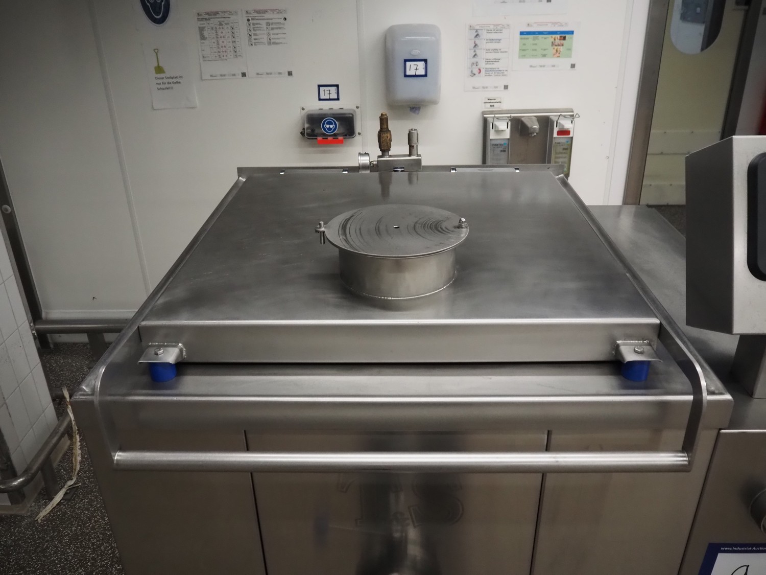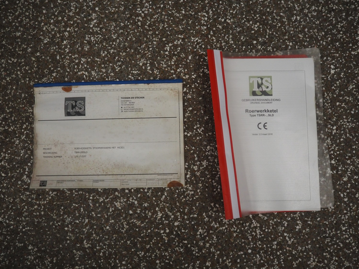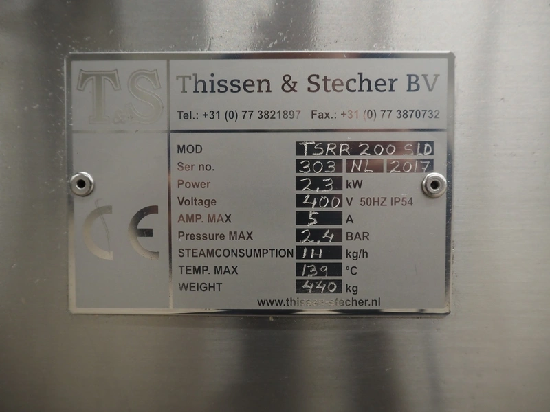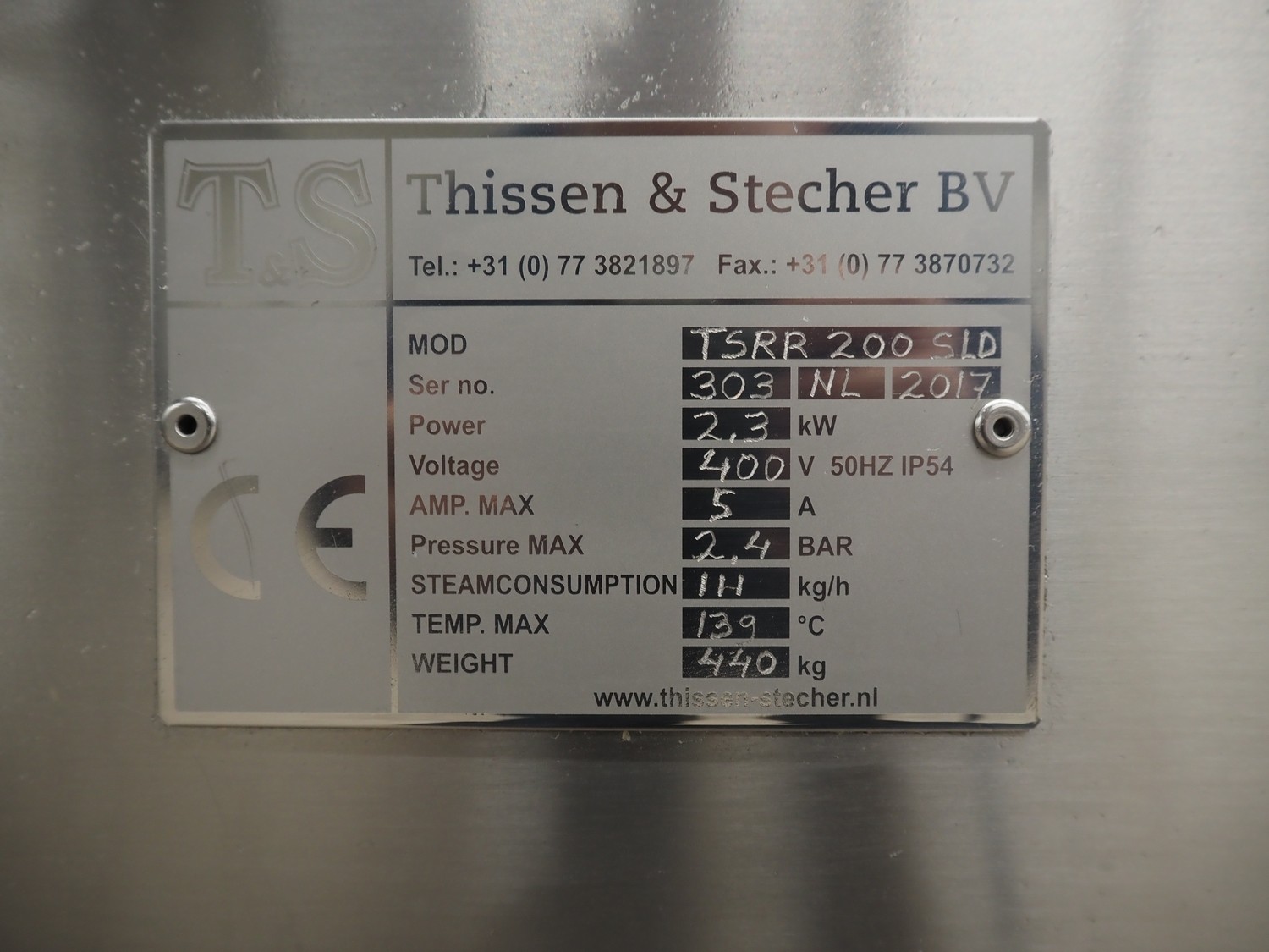 Thissen & Stecher BV cooking vessel with agitator, model: TSRR 200 SLD, serial number: 303 NL 2017, year of construction: 2017, 3 x 400 V, 50 Hz, 2.2 kW, volume: 200 liter, heating: steam 111 kg per hour, mixing: 10 - 60 rates per minute, total dimensions: 1550 mm x 1250 mm x 1700 mm.