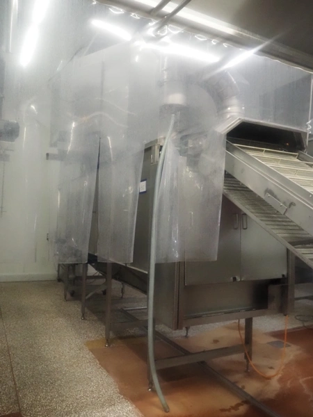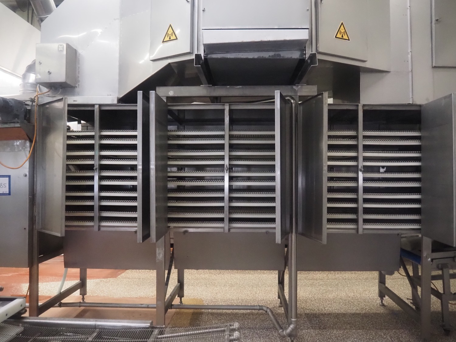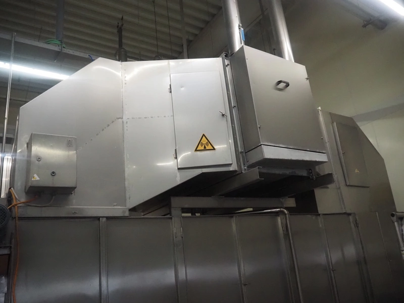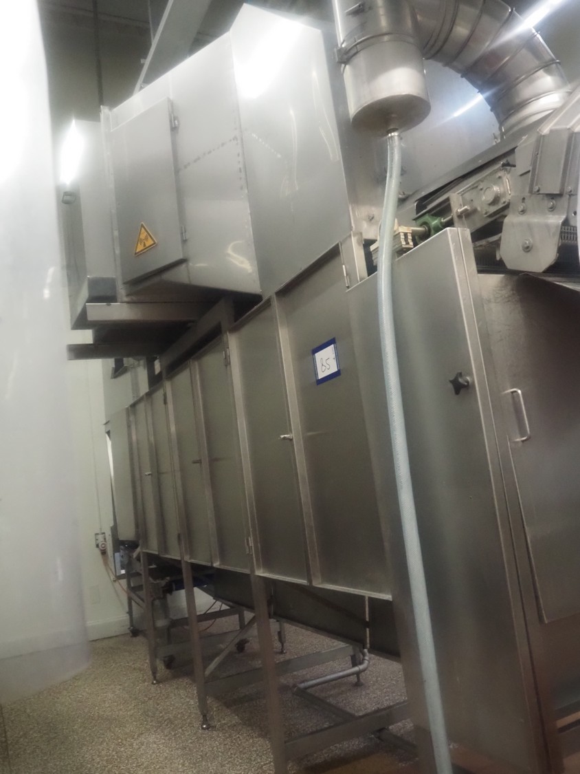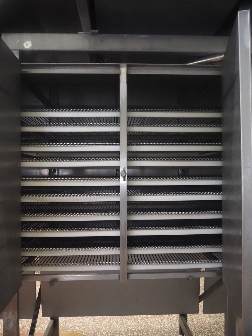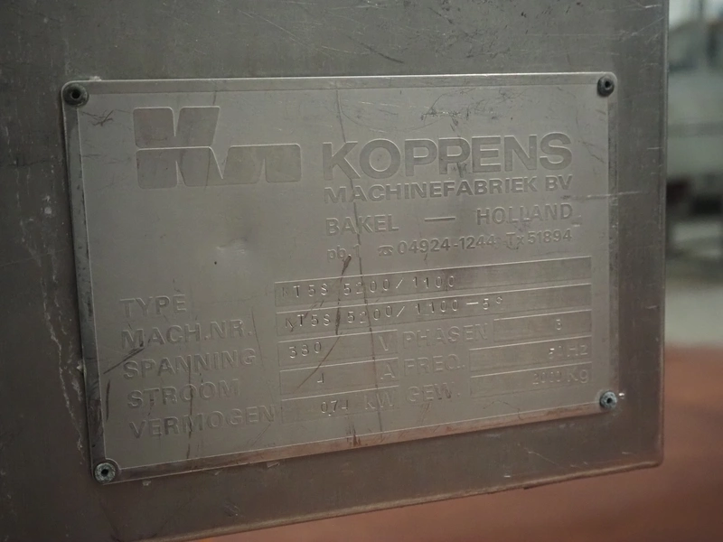 Koppens Machinefabriek BV s/s cooling tunnel, type: KT5S 5200/1100, machine number: KT5S 5200/1100-59, 380 V, 3 Ph, 50 Hz, 4 A, 0.74 kW, weight: 2000 kg, s/s mesh belt, belt width: 1100 mm, 5 floors, distance between floors: 70 mm, total dimensions: 6000 mm x 2450 mm x 3800 mm.