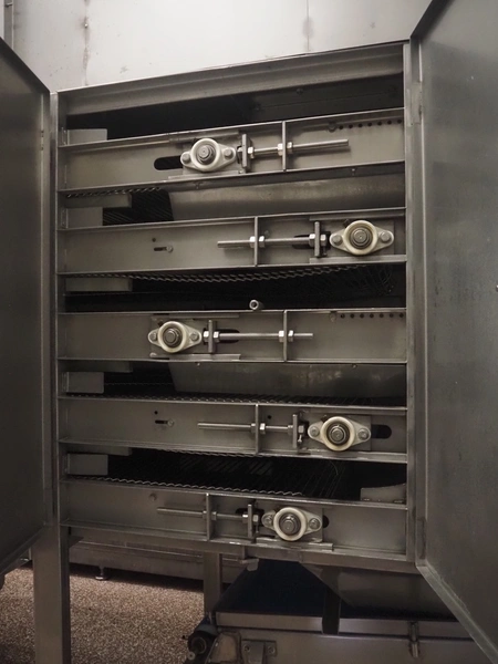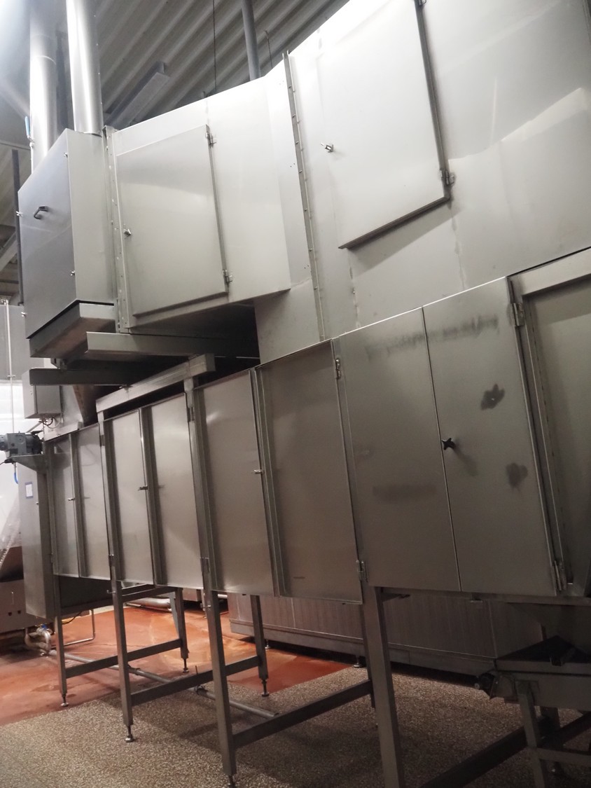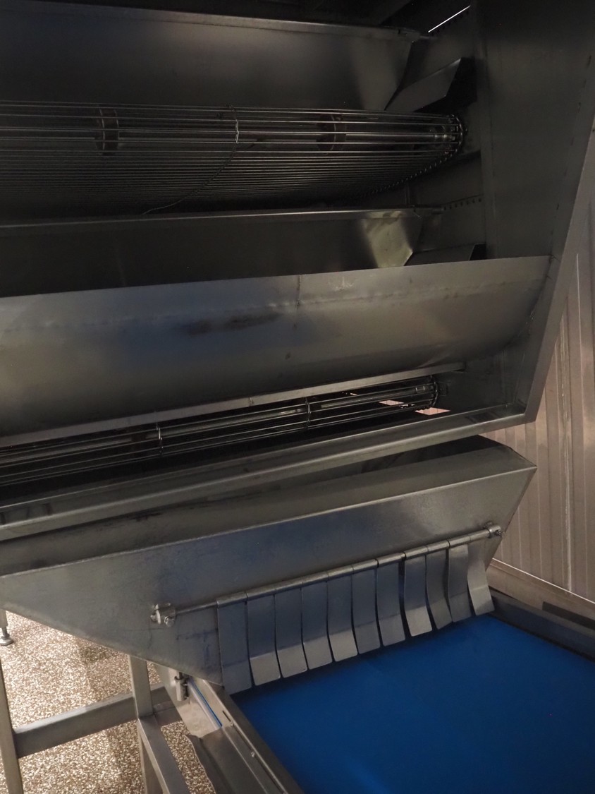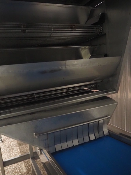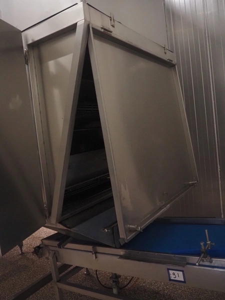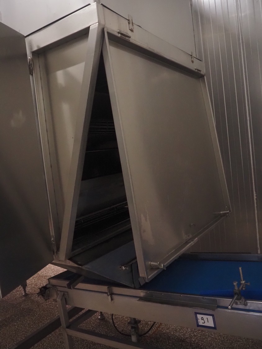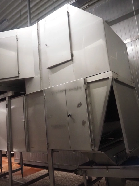Koppens Machinefabriek BV s/s cooling tunnel, type: KT5S 5200/1100, 380 V, 3 Ph, 50 Hz, 4 A, 0.74 kW, weight: 2000 kg, s/s mesh belt, belt width: 1100 mm, 5 floors, distance between floors: 70 mm, total dimensions: 6000 mm x 2450 mm x 3800 mm.