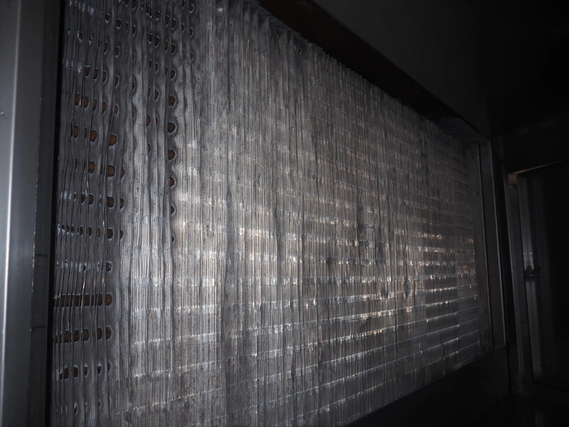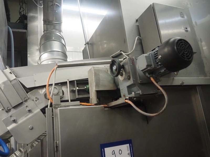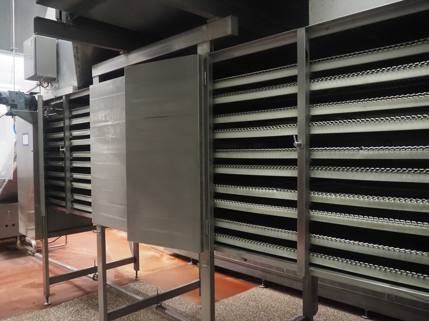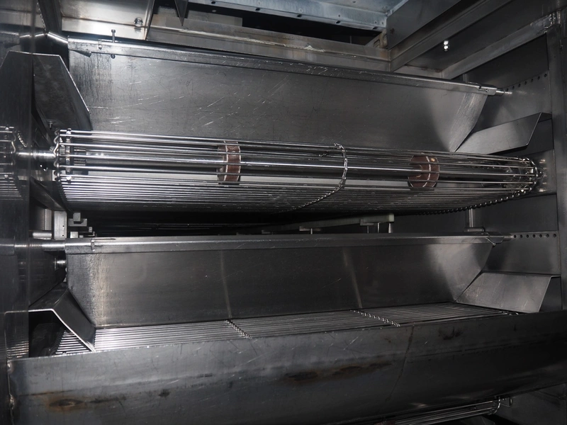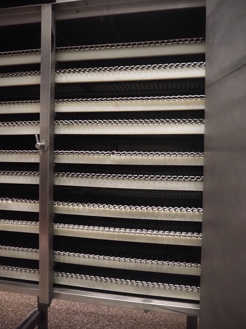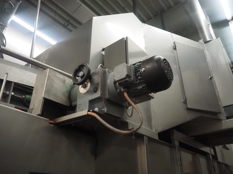 Koppens Machinefabriek BV s/s cooling tunnel, type: KT5S 5200/1100, 380 V, 3 Ph, 50 Hz, 4 A, 0.74 kW, weight: 2000 kg, s/s mesh belt, belt width: 1100 mm, 5 floors, distance between floors: 70 mm, total dimensions: 6000 mm x 2450 mm x 3800 mm.