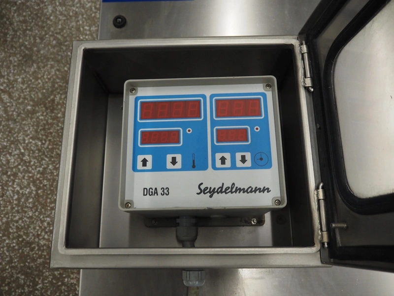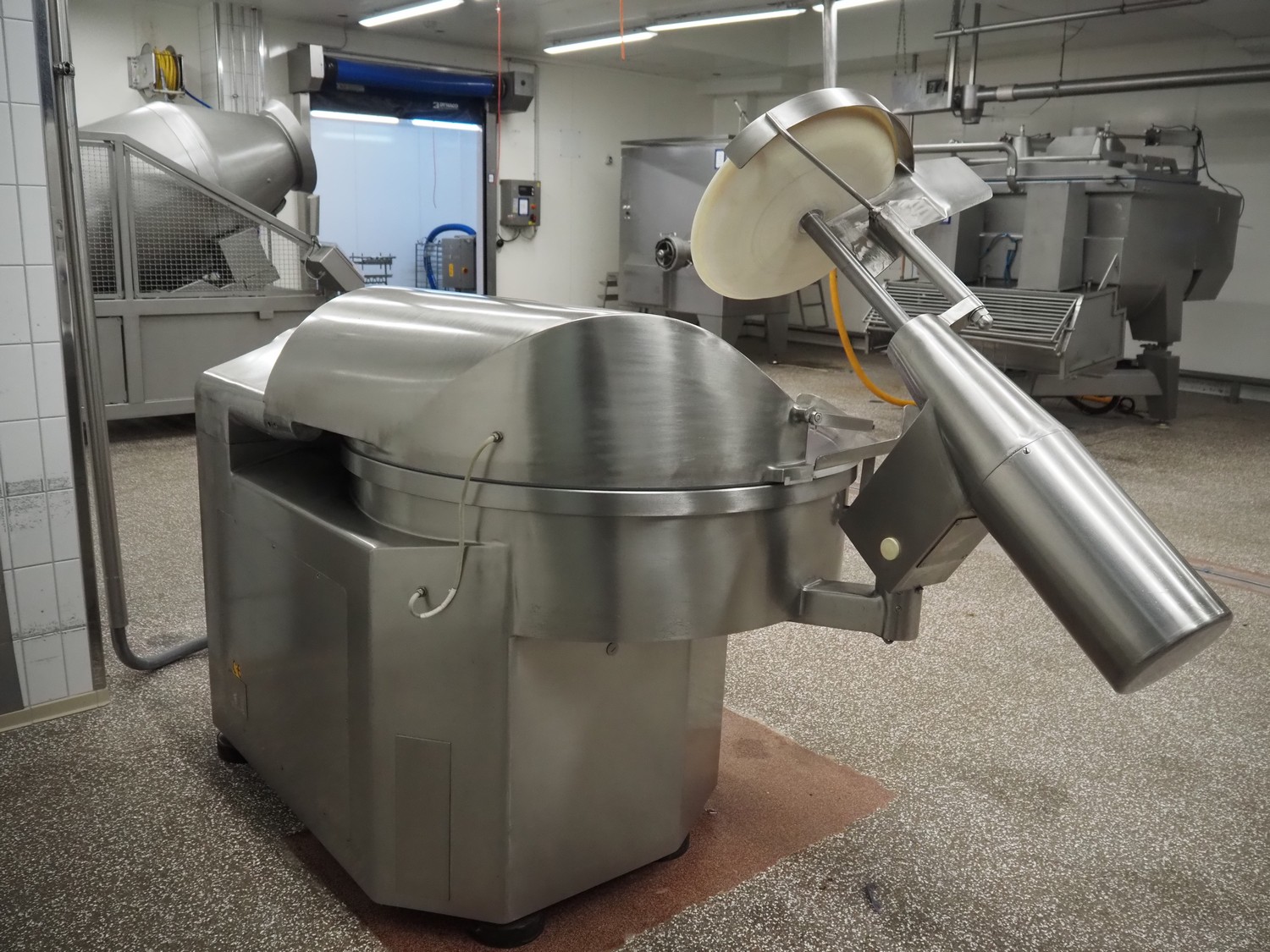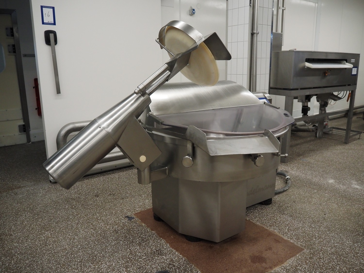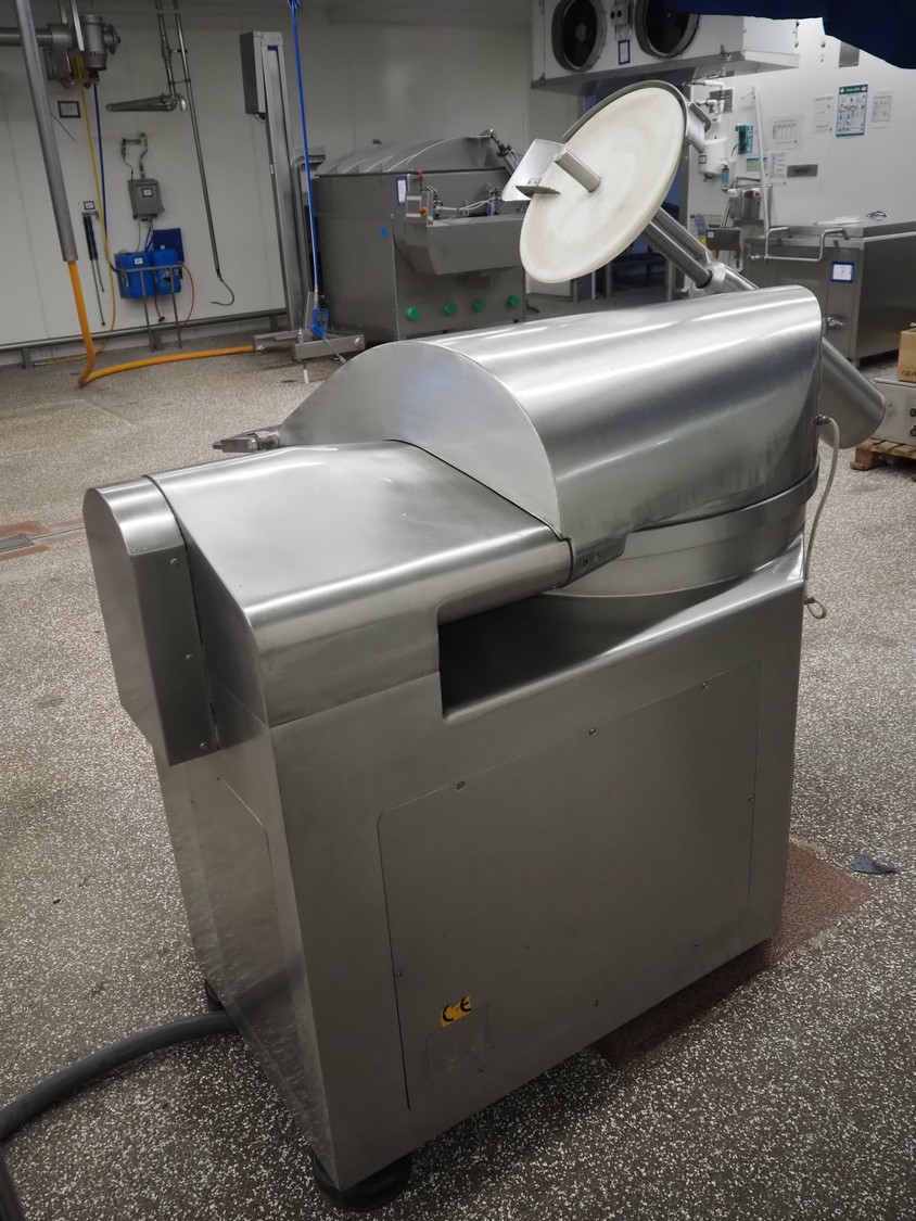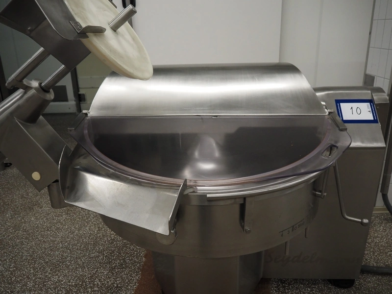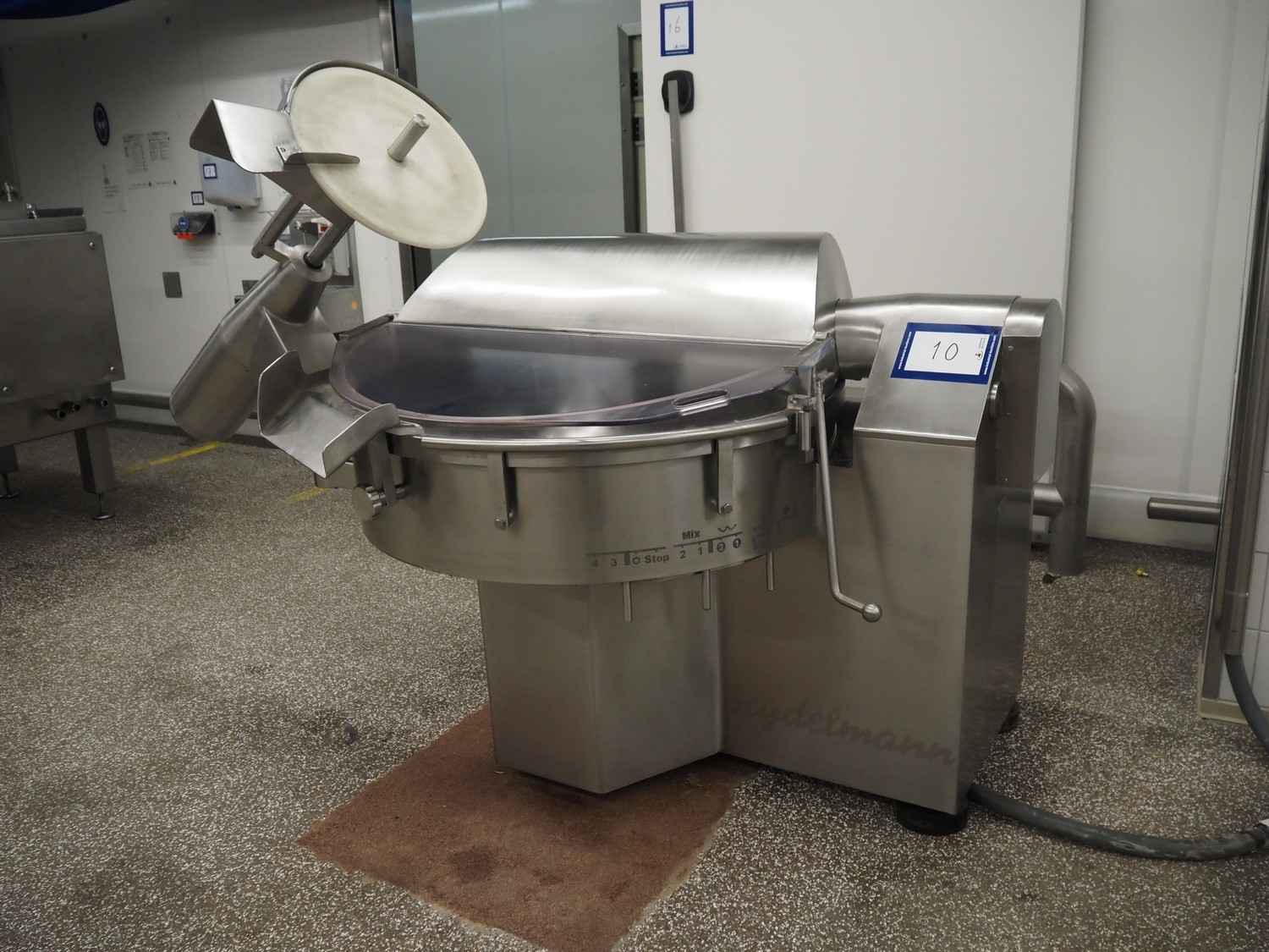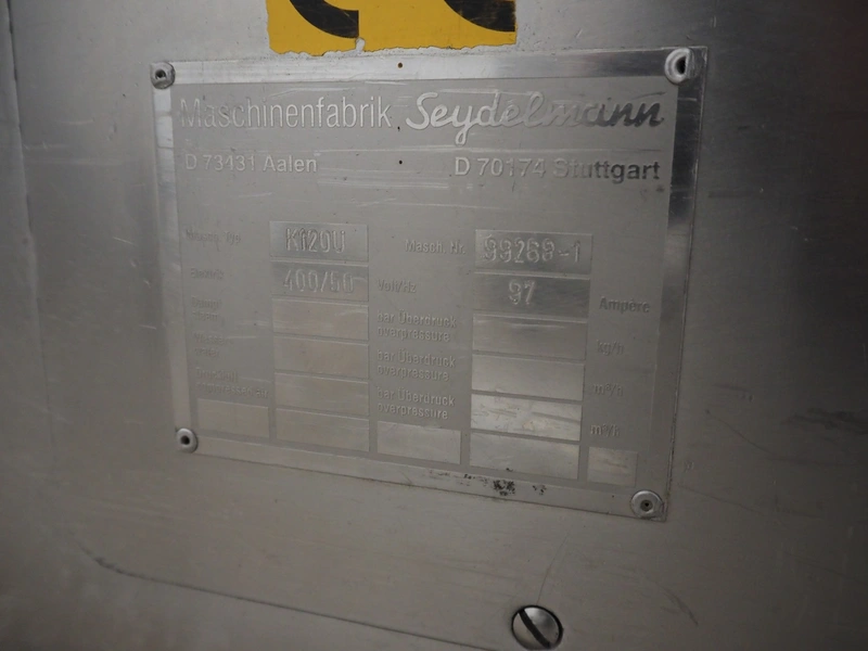 Seydelmann cutter with unloader, type: K120U, serial number: 99268-1, year of construction: 1999, 3 x 400 V, 50 Hz, 97 A, s/s bowl, volume: 120 liter, 2 speeds on knife / bowl and mixing speeds, weight: 1385 kg, dimensions cutter: 2050 mm x 1250 mm x 1250 mm, DGA33 control indicator, dimensions: 330 mm x 300 mm x 200 mm and switch cabinet, dimensions: 800 mm x 300 mm x 1000 mm.