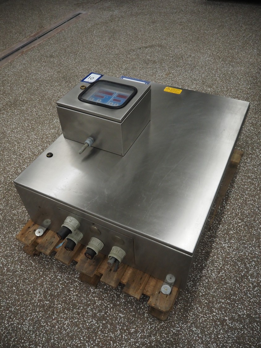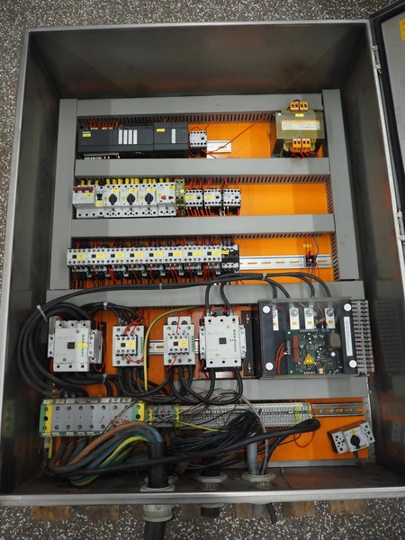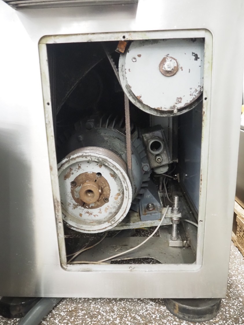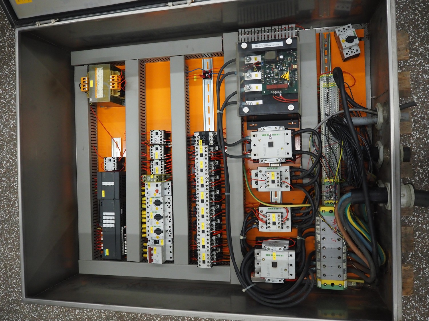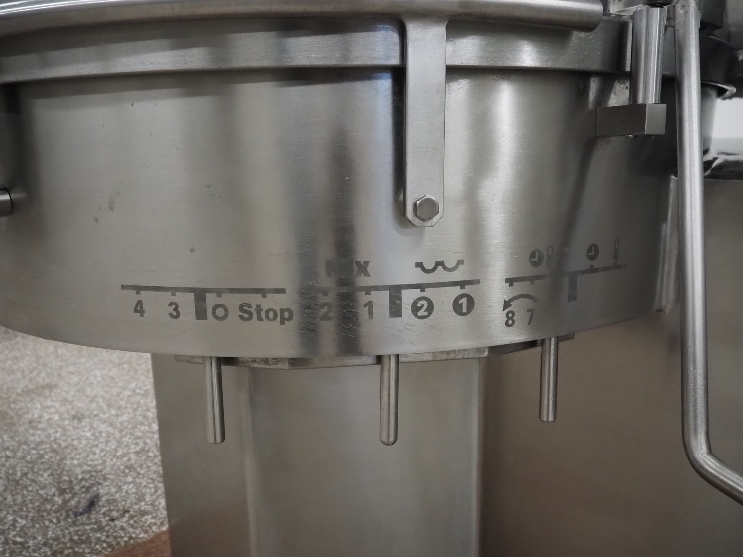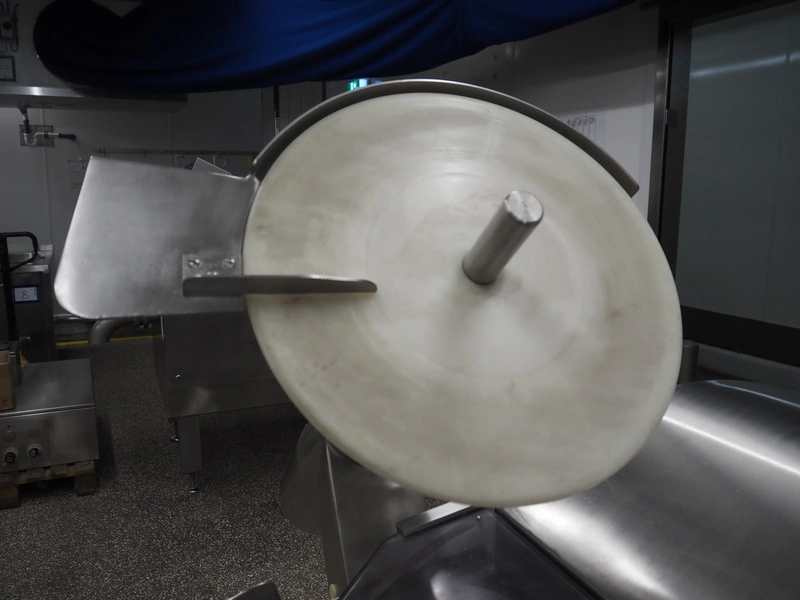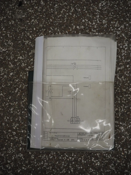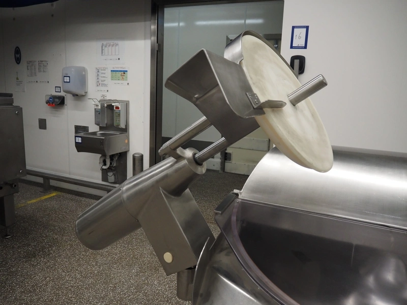 Seydelmann cutter with unloader, type: K120U, serial number: 99268-1, year of construction: 1999, 3 x 400 V, 50 Hz, 97 A, s/s bowl, volume: 120 liter, 2 speeds on knife / bowl and mixing speeds, weight: 1385 kg, dimensions cutter: 2050 mm x 1250 mm x 1250 mm, DGA33 control indicator, dimensions: 330 mm x 300 mm x 200 mm and switch cabinet, dimensions: 800 mm x 300 mm x 1000 mm.