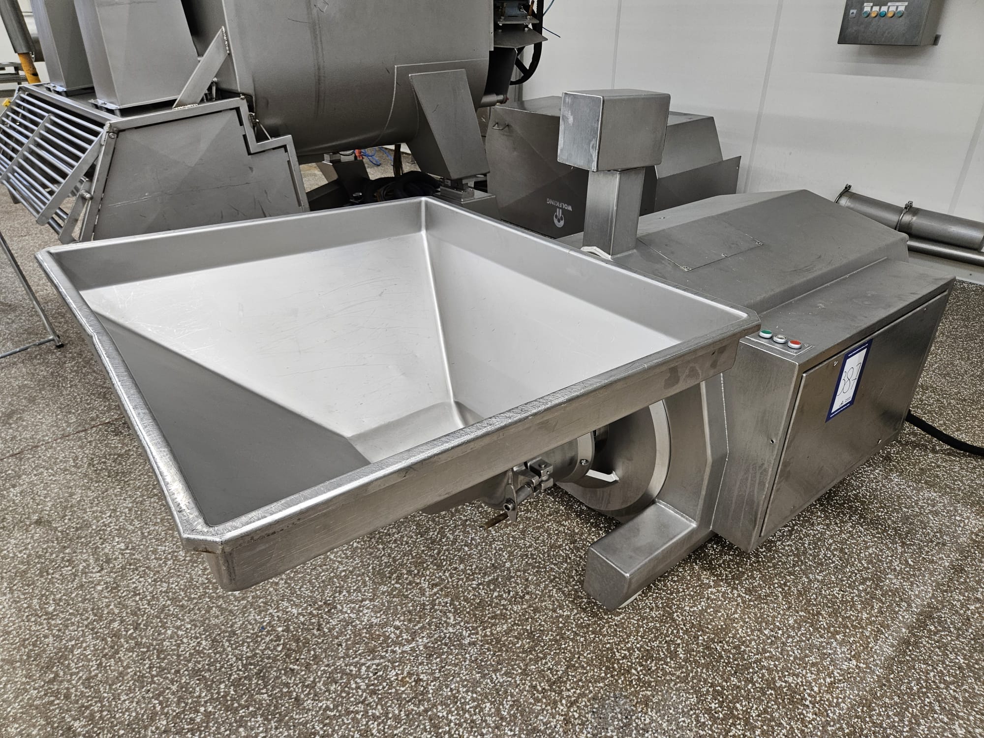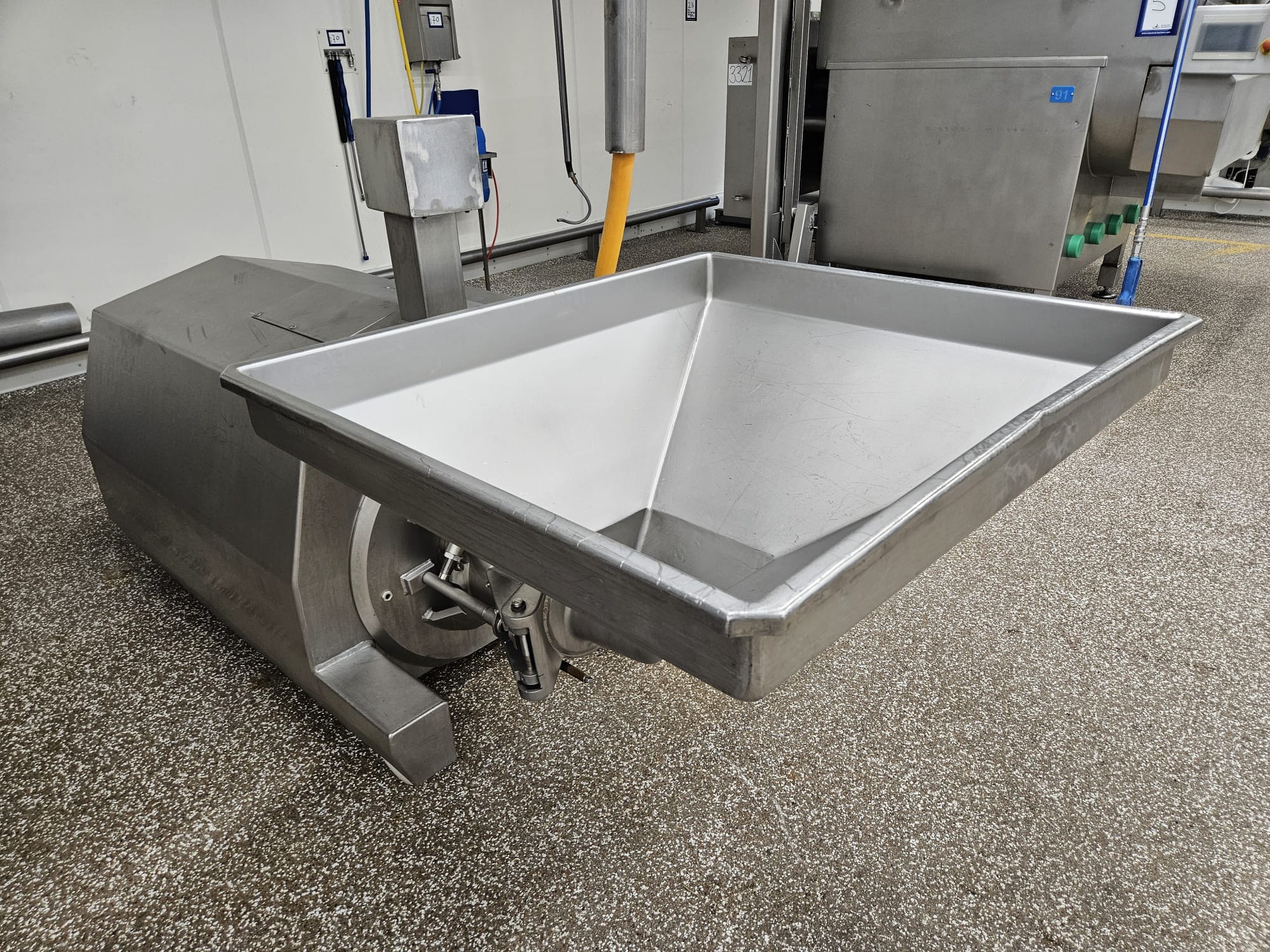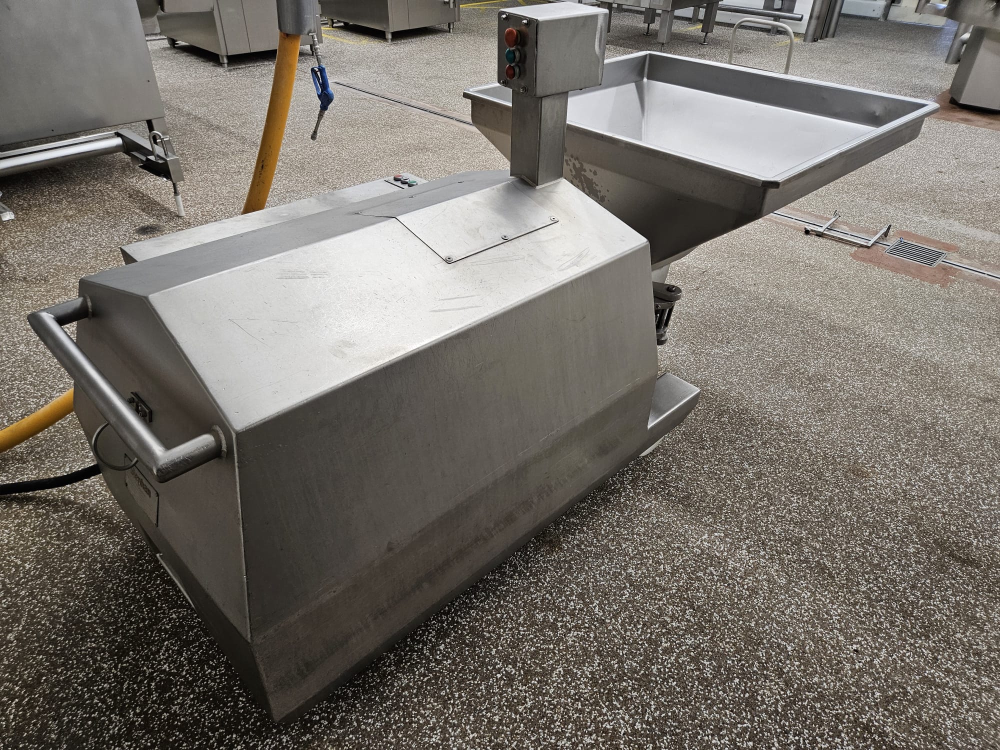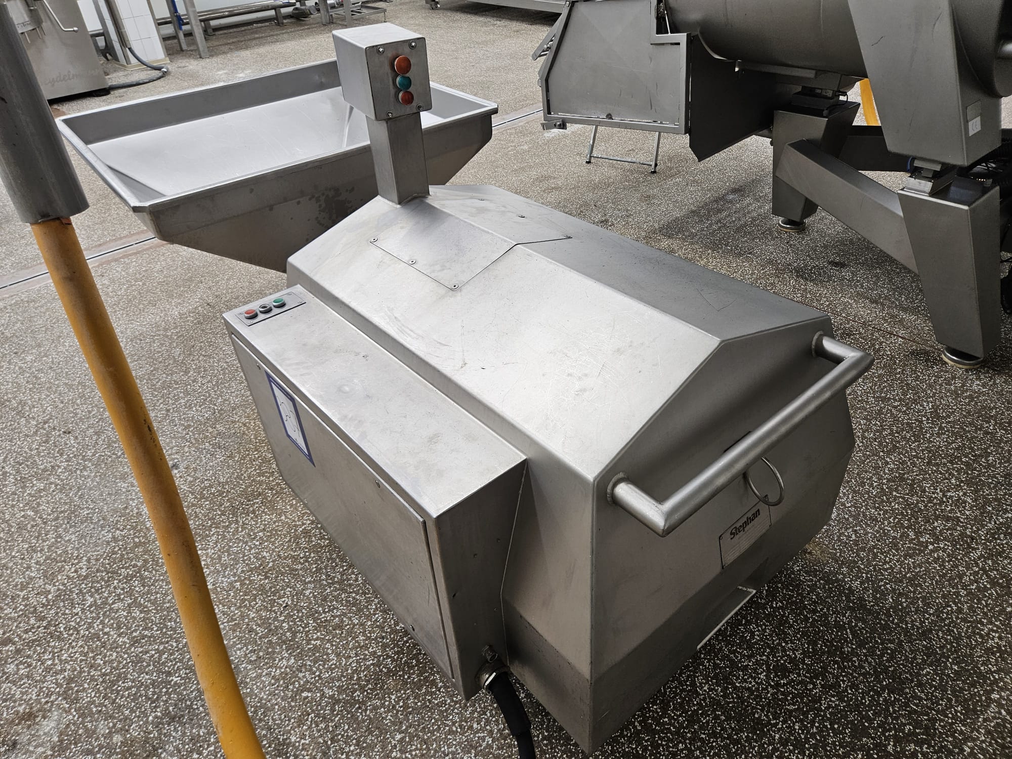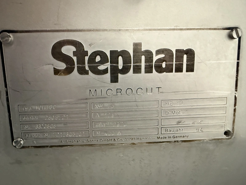 Stephan microcutter, type: MCHD90, serial number: 721.305.01, year of construction: 1994, motor: 3 x 400 V, 50 Hz, 75 kW, knife speed: 2900 rates per minute, hopper volume: 250 liter, weight: 1000 kg, dimensions: 2400 mm x 1100 mm x 1250 mm.