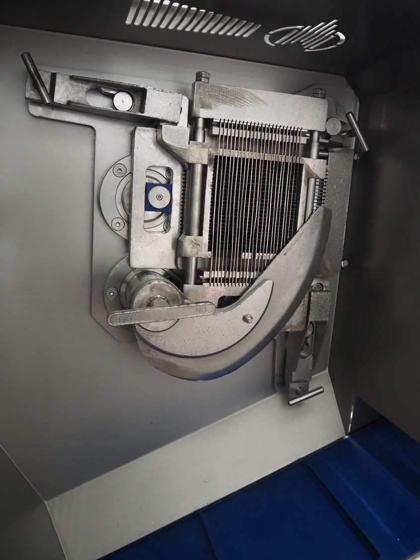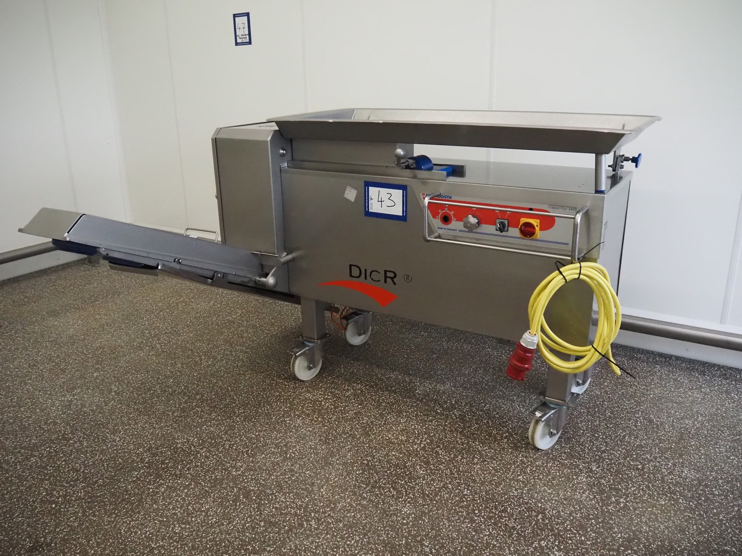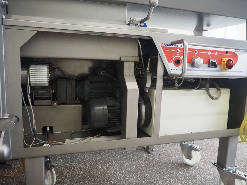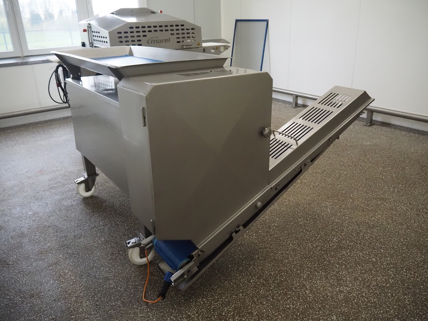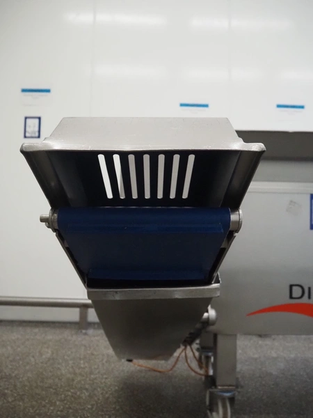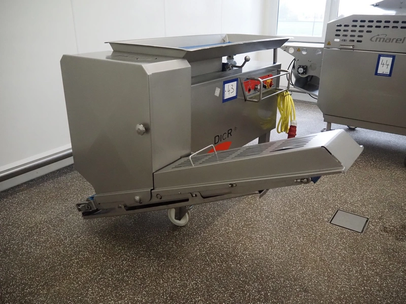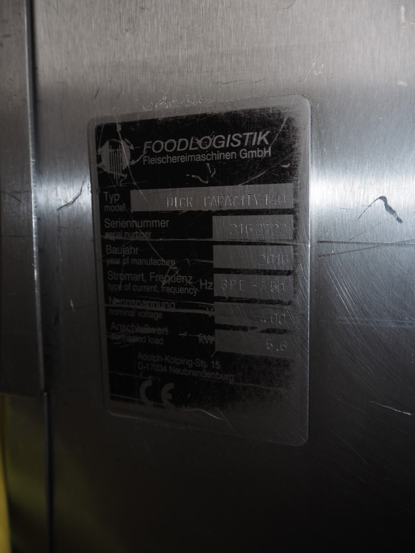 Foodlogistik mobile dicer, model: Dicr Capacity 140, serial number: 2162722, year of construction: 2016, 3 x 400 V, 50 Hz, 5.6 kW, plastic outfeed belt, belt width: 245 mm, outfeed height: 800 mm, chamber dimensions: 550 mm x 140 mm x 140 mm, knife set: 5 x 5 mm, weight: 650 kg, dimensions: 1650 mm x 1800 mm x 1200 mm.