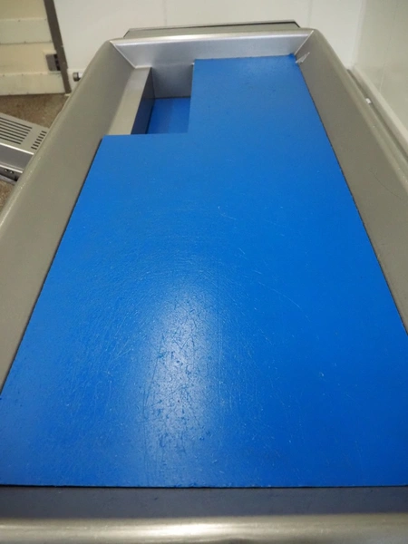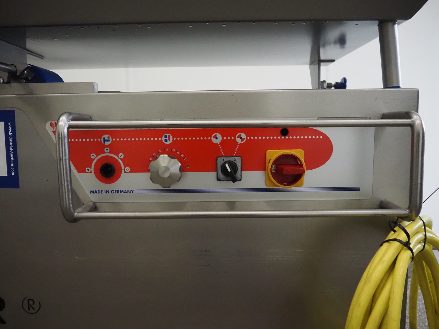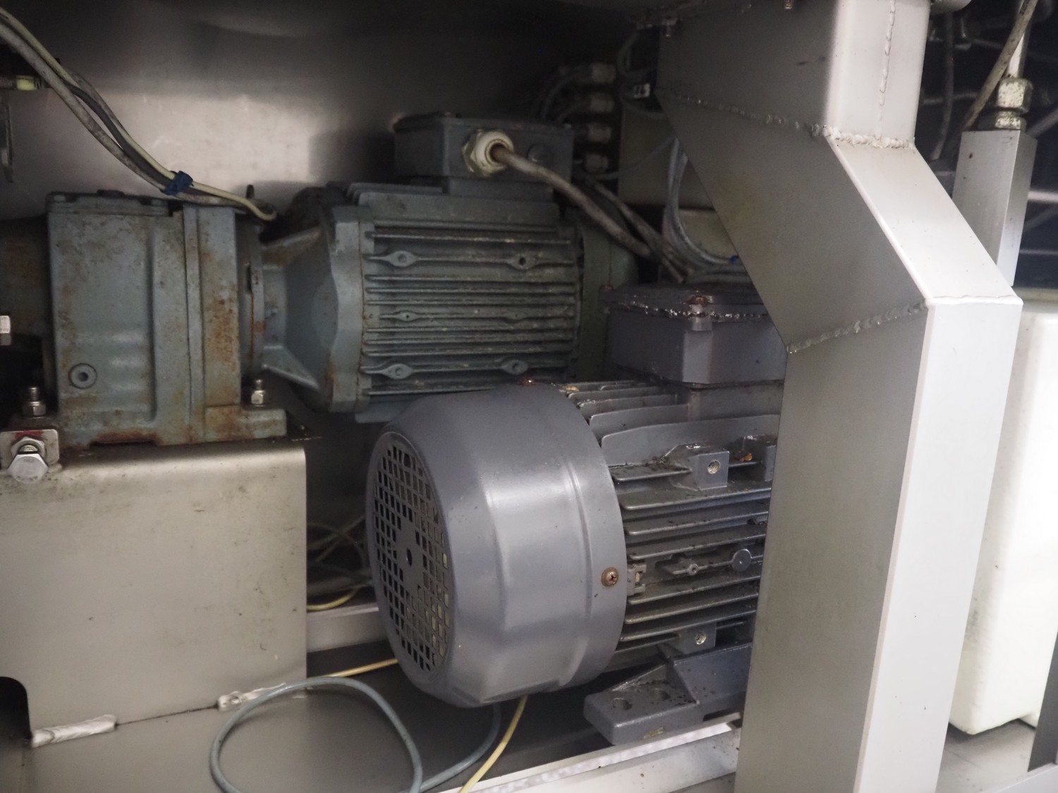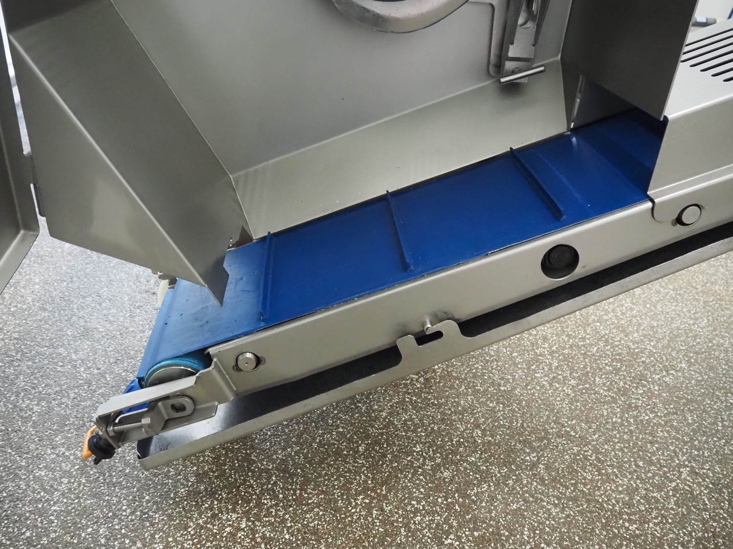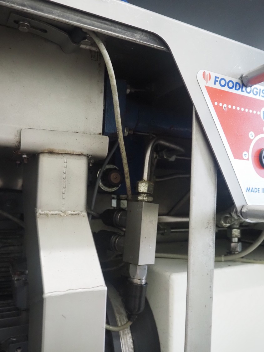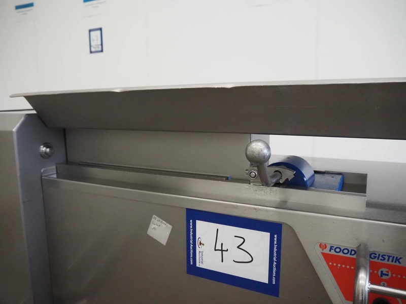 Foodlogistik mobile dicer, model: Dicr Capacity 140, serial number: 2162722, year of construction: 2016, 3 x 400 V, 50 Hz, 5.6 kW, plastic outfeed belt, belt width: 245 mm, outfeed height: 800 mm, chamber dimensions: 550 mm x 140 mm x 140 mm, knife set: 5 x 5 mm, weight: 650 kg, dimensions: 1650 mm x 1800 mm x 1200 mm.
