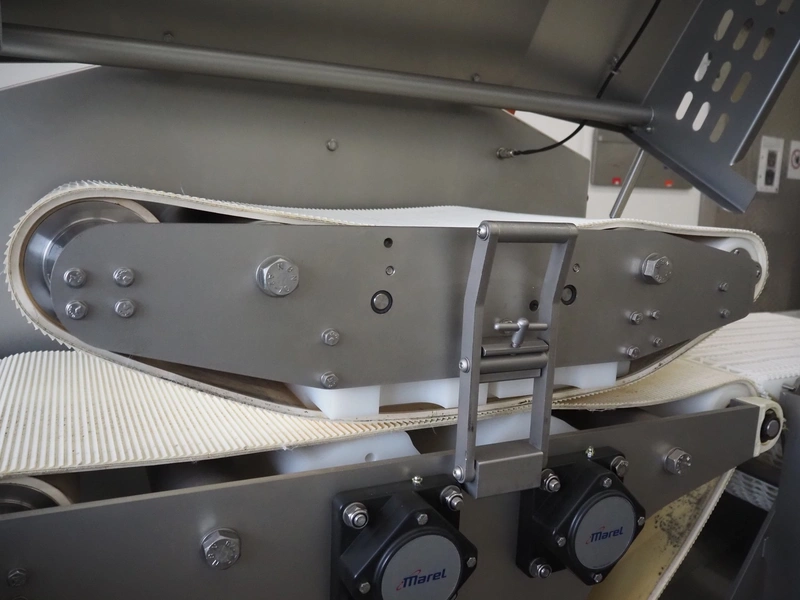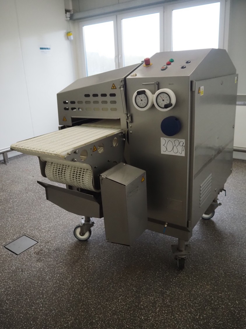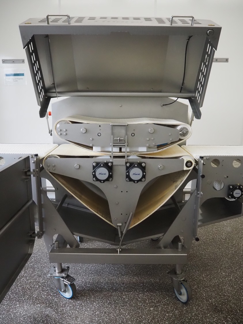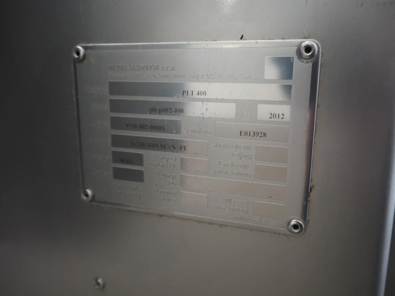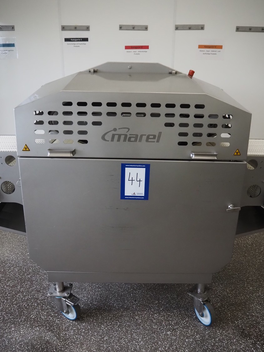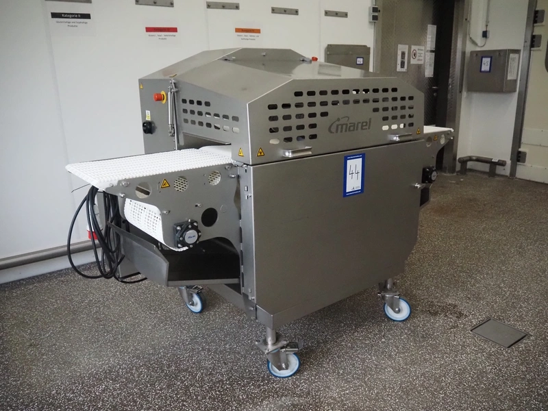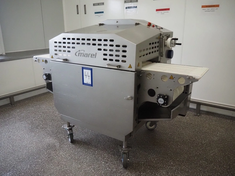 Marel mobile flattener, type: Platino 400, serial number: E013925, year of construction: 2012, 3 x 400 V, 50 Hz, 3 kW, plastic mesh belt, belt width: 400 mm, height setting: 2 - 51 mm, compressed air: 6 - 10 bar, weight: 600 kg, dimensions: 2250 mm x 1100 mm x 1550 mm.