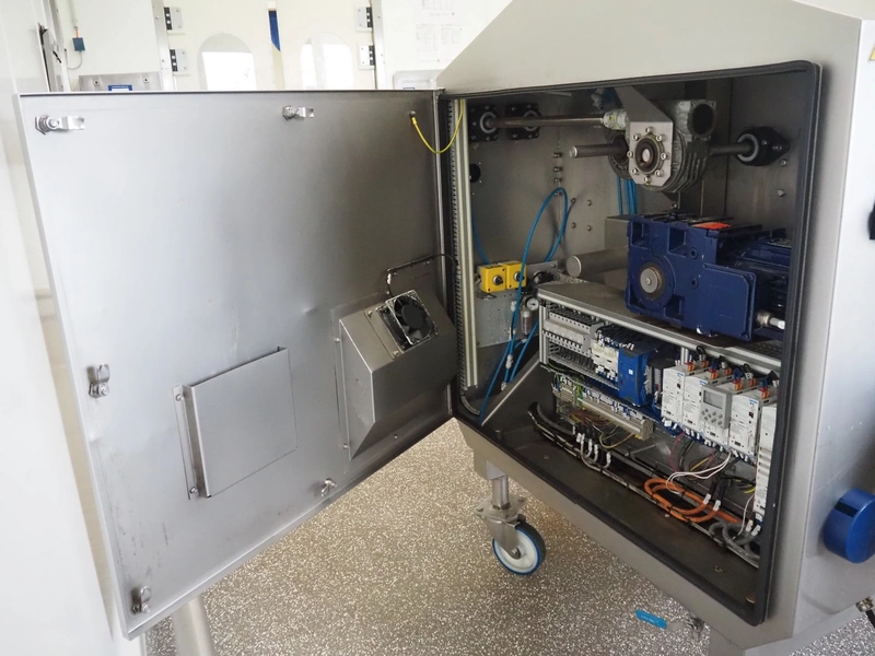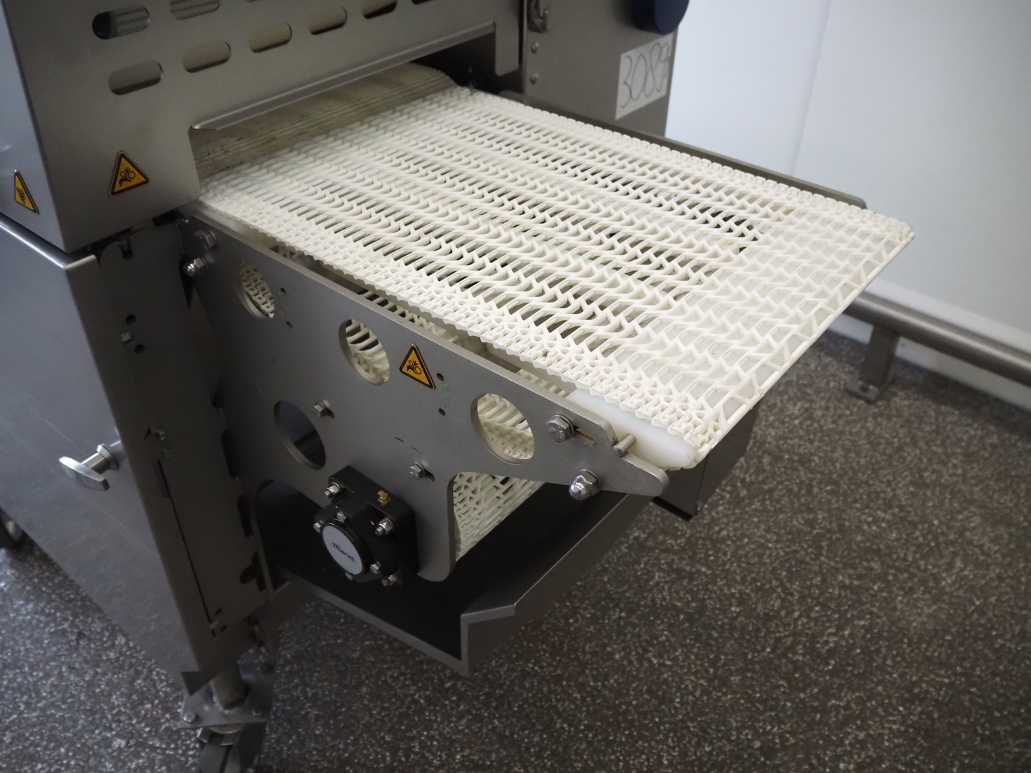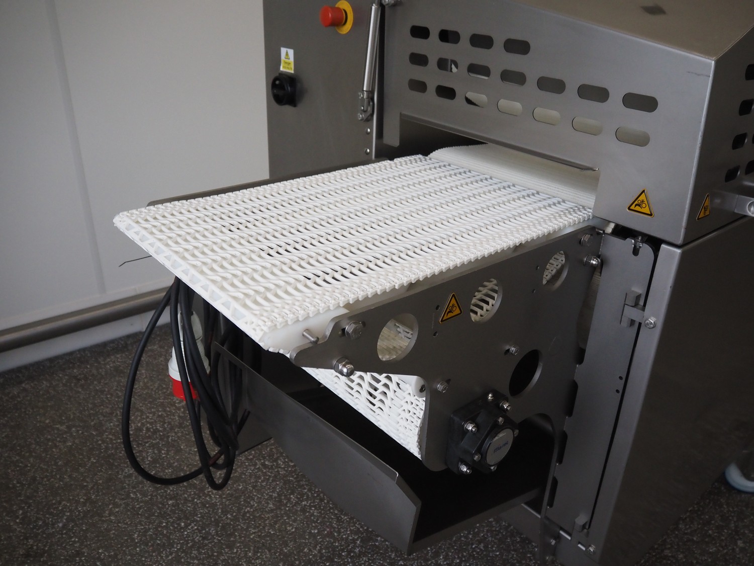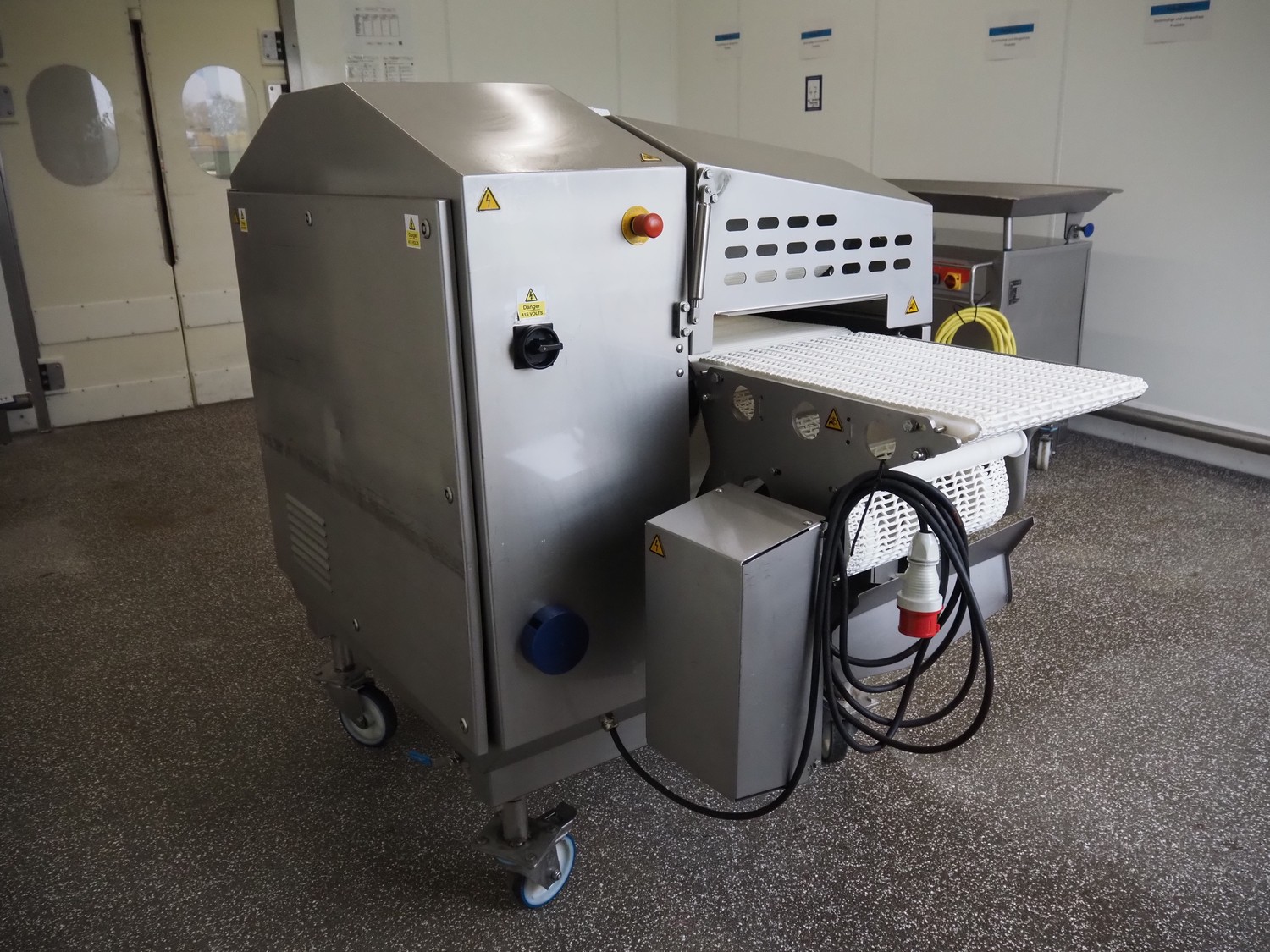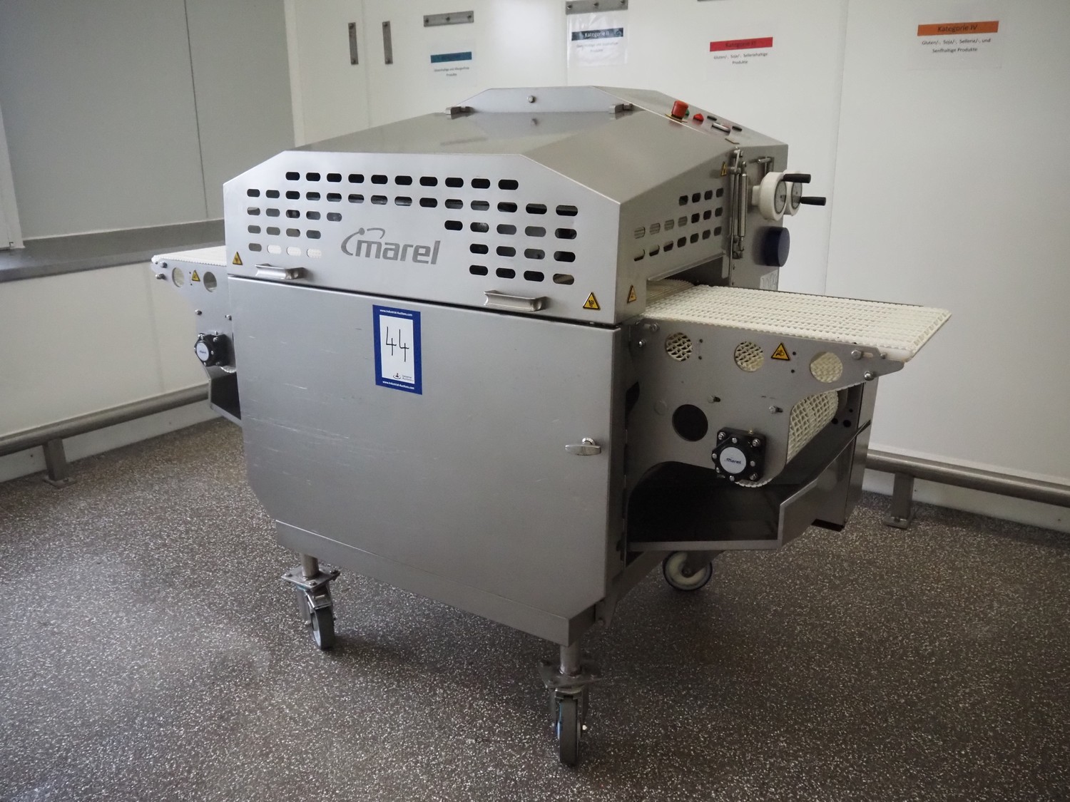 Marel mobile flattener, type: Platino 400, serial number: E013925, year of construction: 2012, 3 x 400 V, 50 Hz, 3 kW, plastic mesh belt, belt width: 400 mm, height setting: 2 - 51 mm, compressed air: 6 - 10 bar, weight: 600 kg, dimensions: 2250 mm x 1100 mm x 1550 mm.