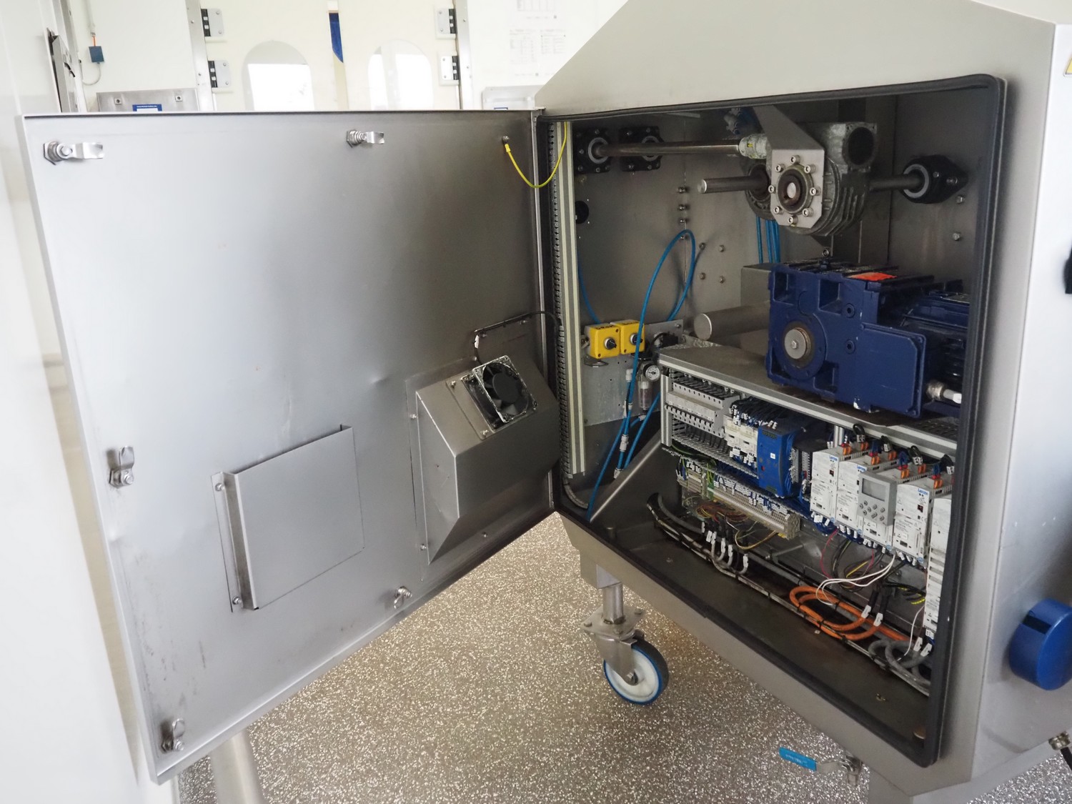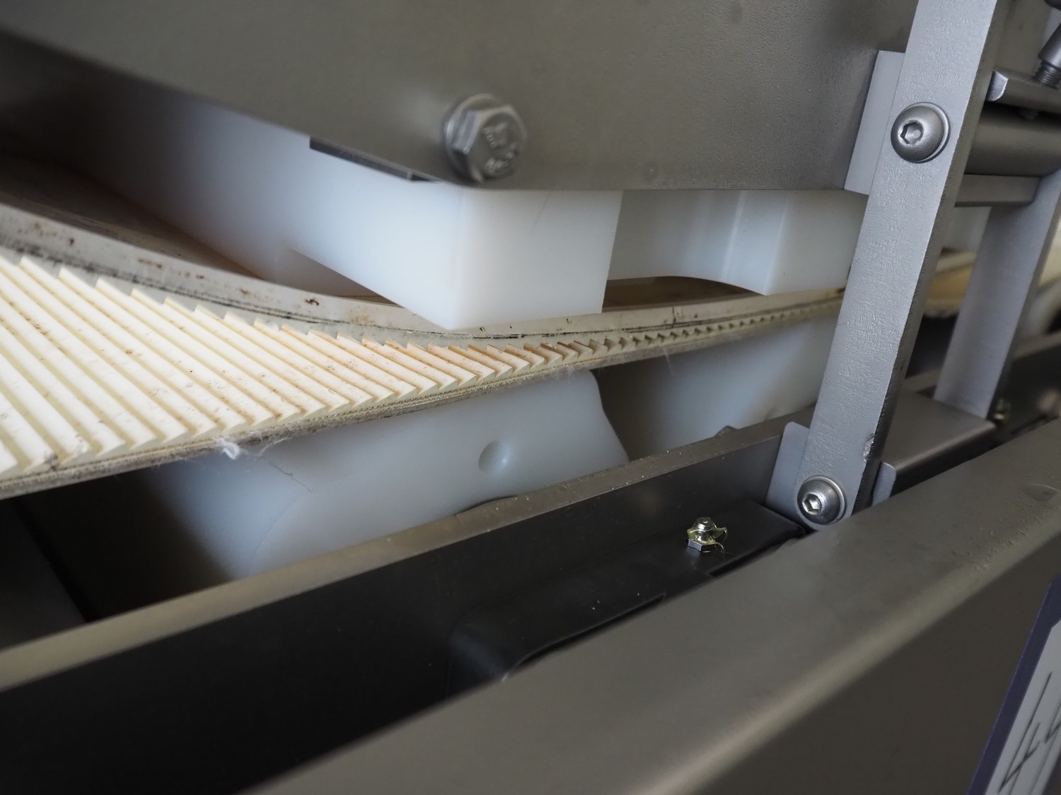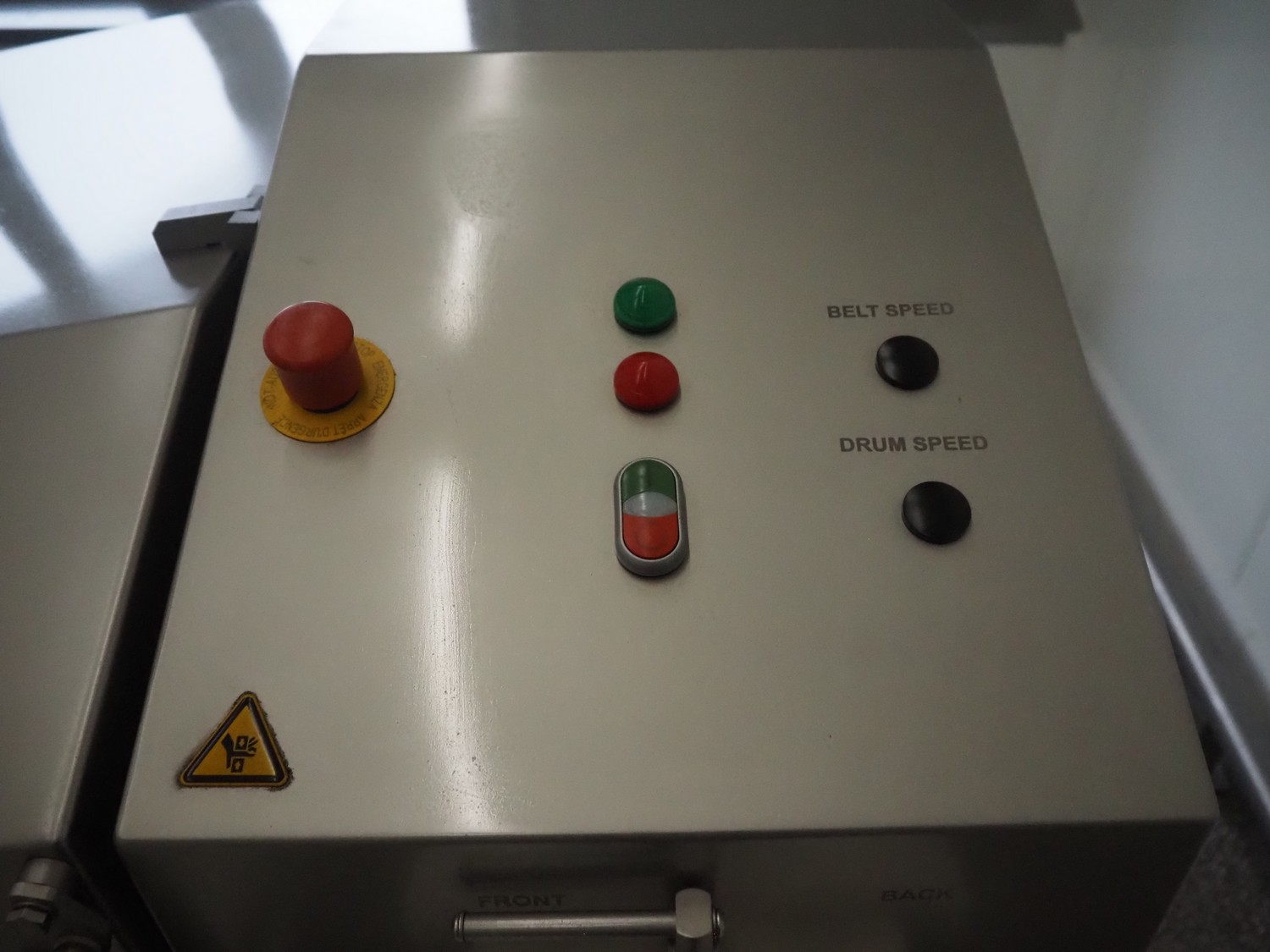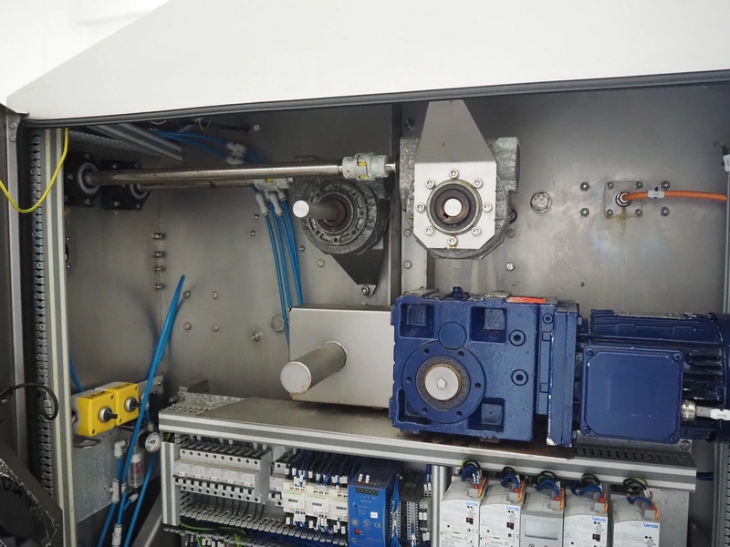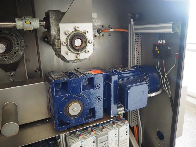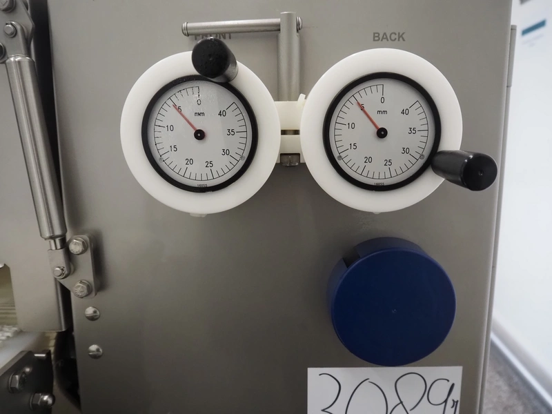 Marel mobile flattener, type: Platino 400, serial number: E013925, year of construction: 2012, 3 x 400 V, 50 Hz, 3 kW, plastic mesh belt, belt width: 400 mm, height setting: 2 - 51 mm, compressed air: 6 - 10 bar, weight: 600 kg, dimensions: 2250 mm x 1100 mm x 1550 mm.