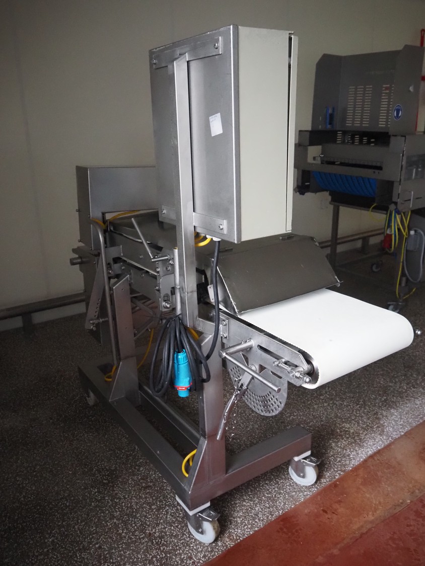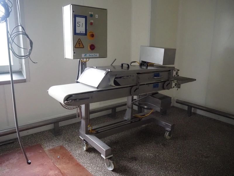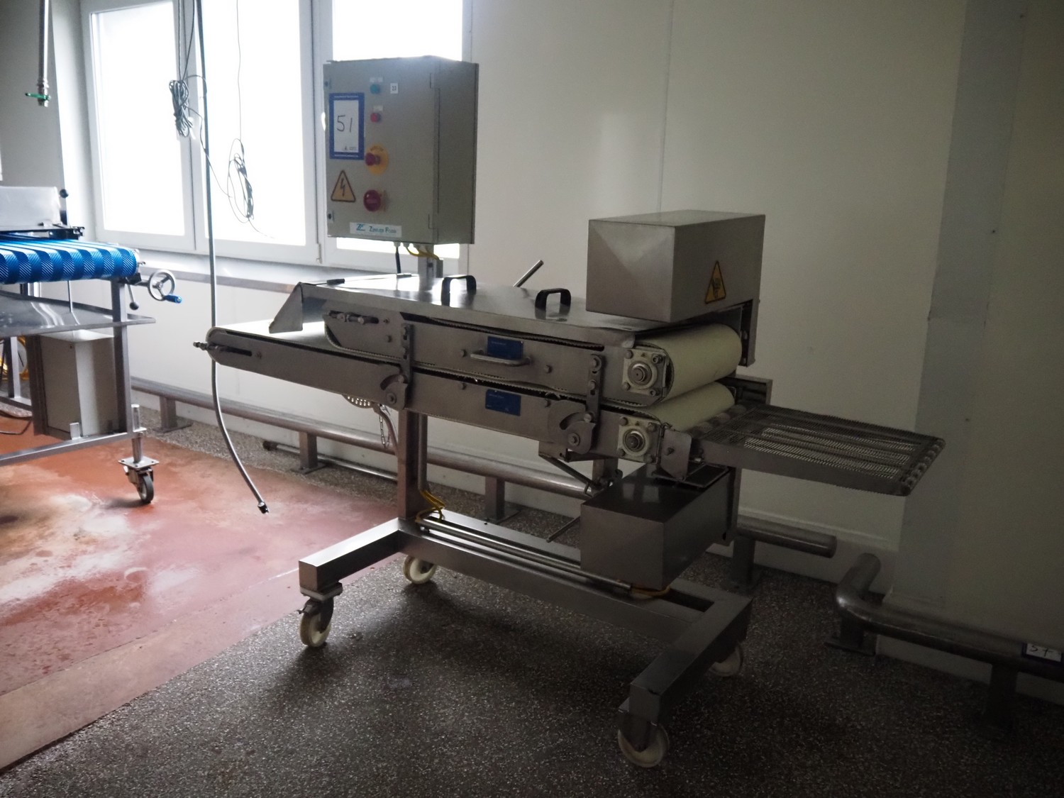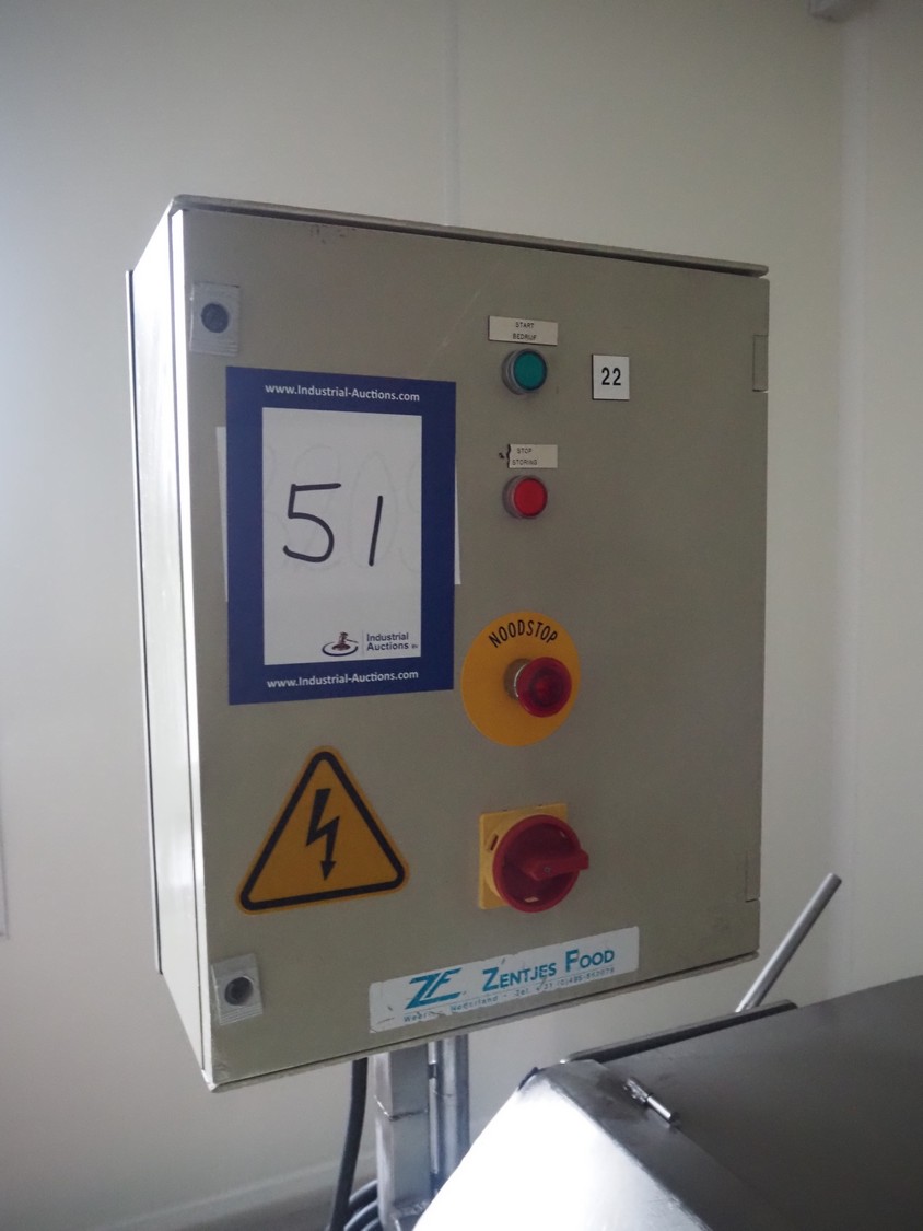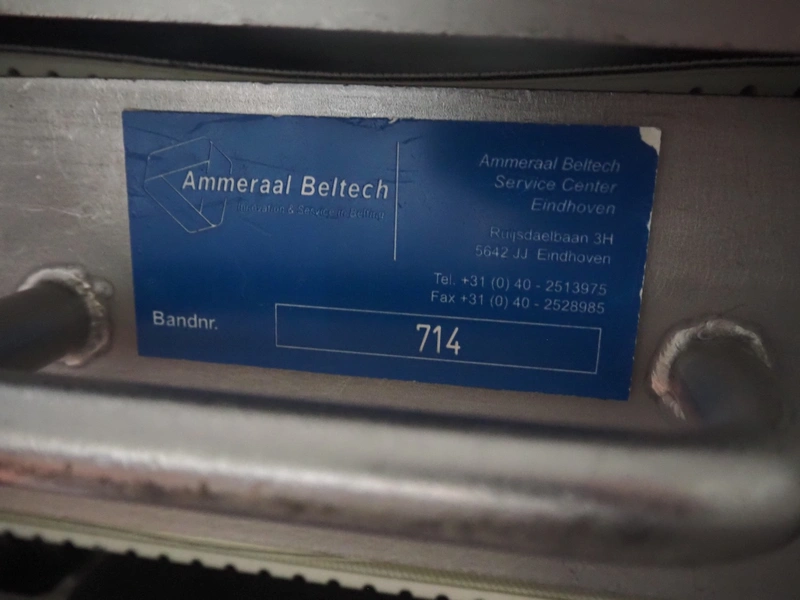 Zentjes mobile flattener, type: RMP400, 3 x 380 V, 50 Hz, 0.55 kW, plastic belt, belt width: 400 mm, belt speed: 2 - 9 meter / minute, weight: 270 kg, dimensions: 2100 mm x 700 mm x 1750 mm.