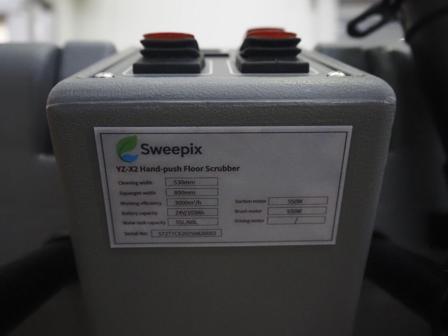 Sweepix floor scrubbing machine, type: YZ-X2 Hand-push Floor Scrubber, serial number: 57277CX20250826002, cleaning width: 530 mm, squeegee width: 800 mm, working efficiency: 3000 m² per hour, dimensions: 1350 mm x 550 mm x 1100 mm. Including charger. New, never used.