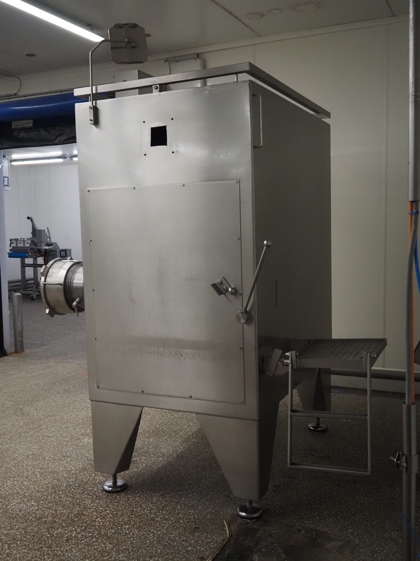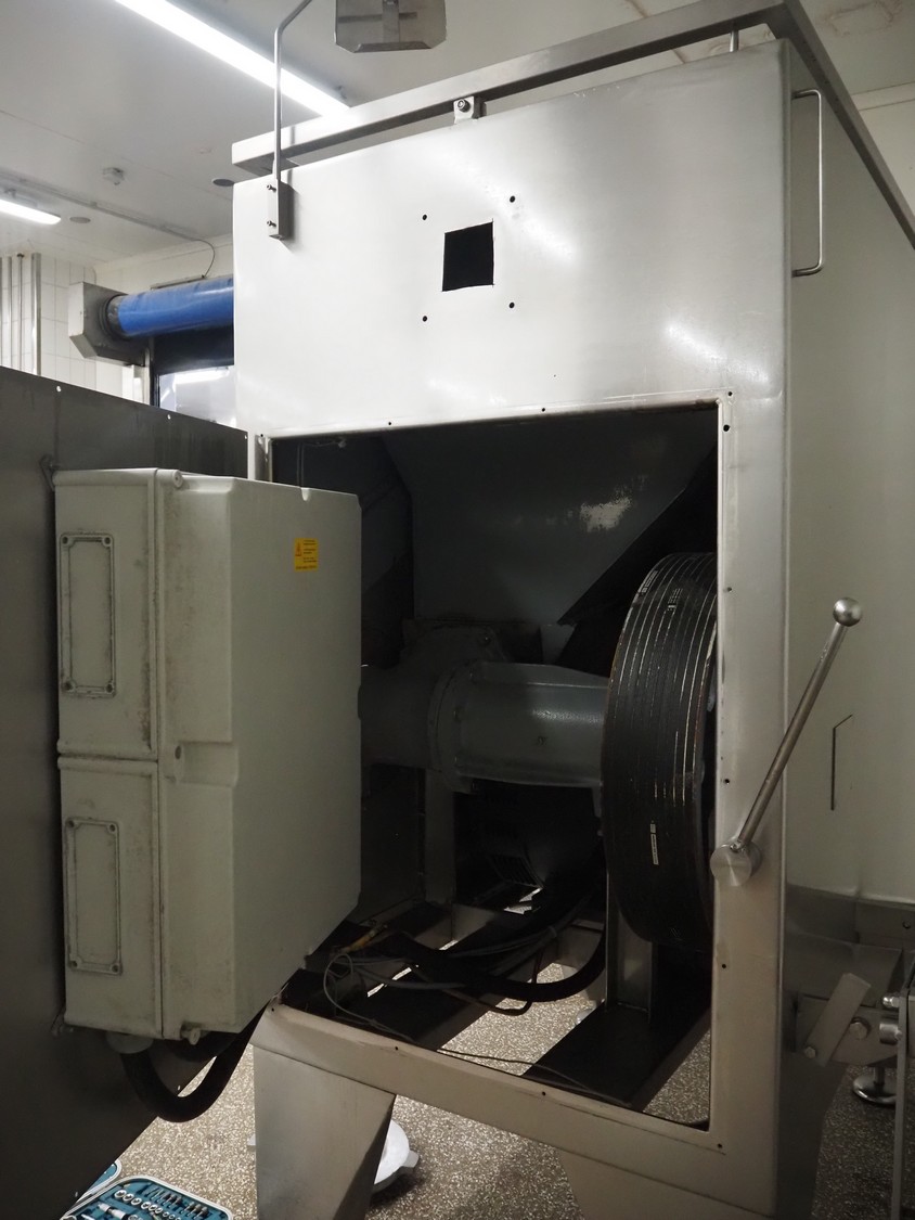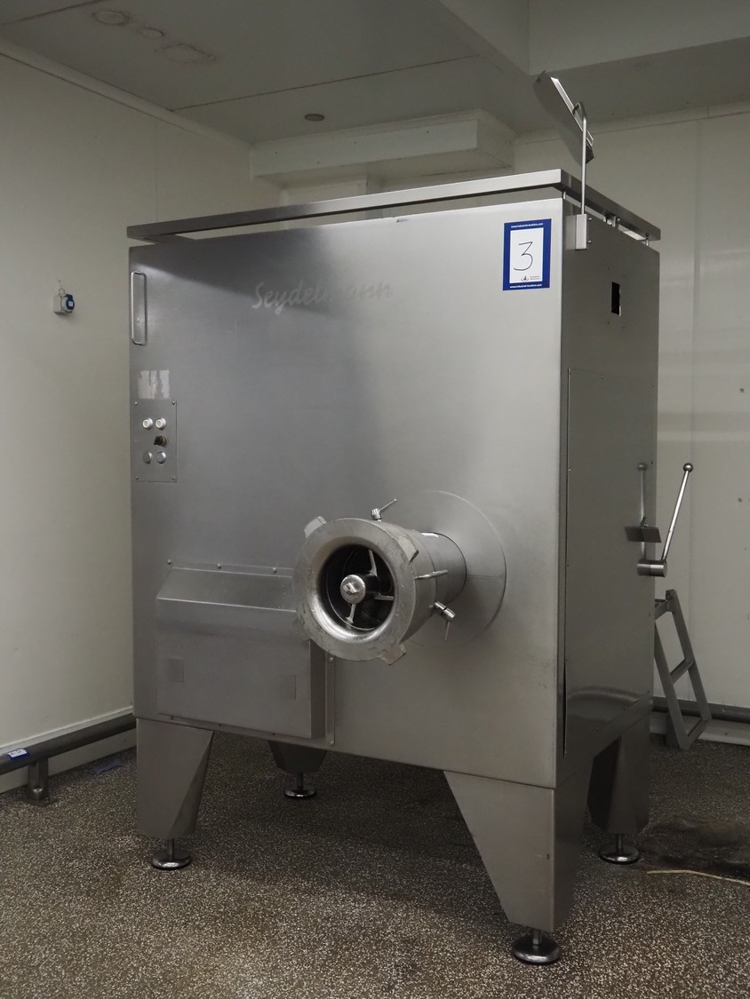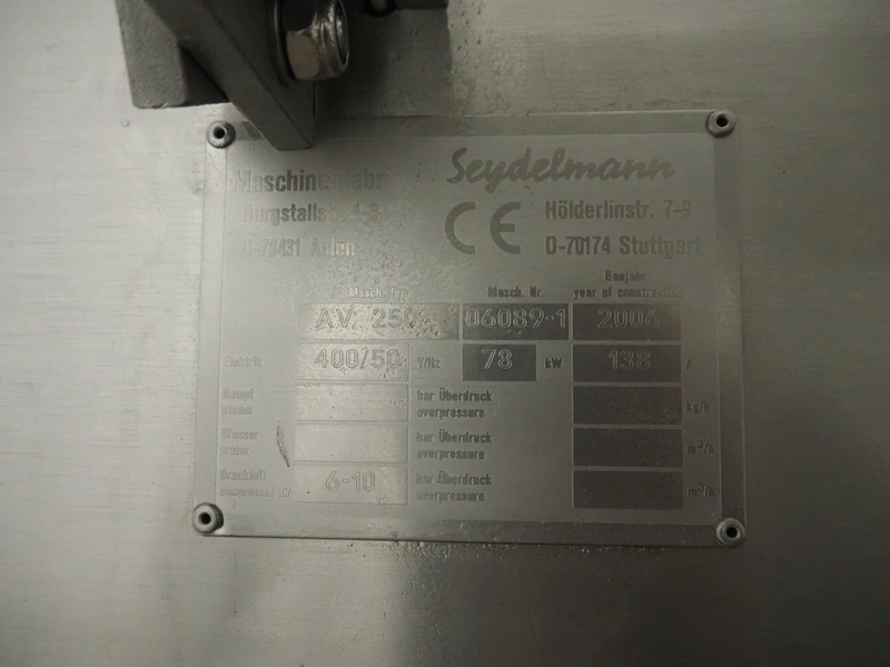 Seydelmann automatic grinder, machine type: AV 250, machine number: 06089-1, year of construction: 2006, 400 V, 50 Hz, 138 A, 78 kW, compressed air: 6 - 10 bar, plate diameter: 250 mm, hopper: 800 liter, 3 speeds on feed screw, 2 speeds on working worm, dimensions grinder: 1650 mm x 1700 mm x 2400 mm, including Verbufa tool trolley, dimensions: 800 mm x 700 mm x 900 mm.