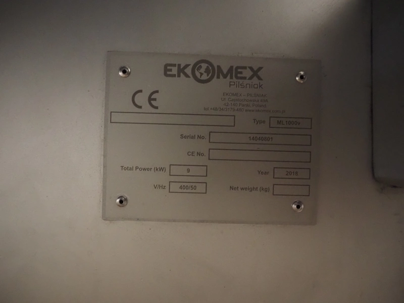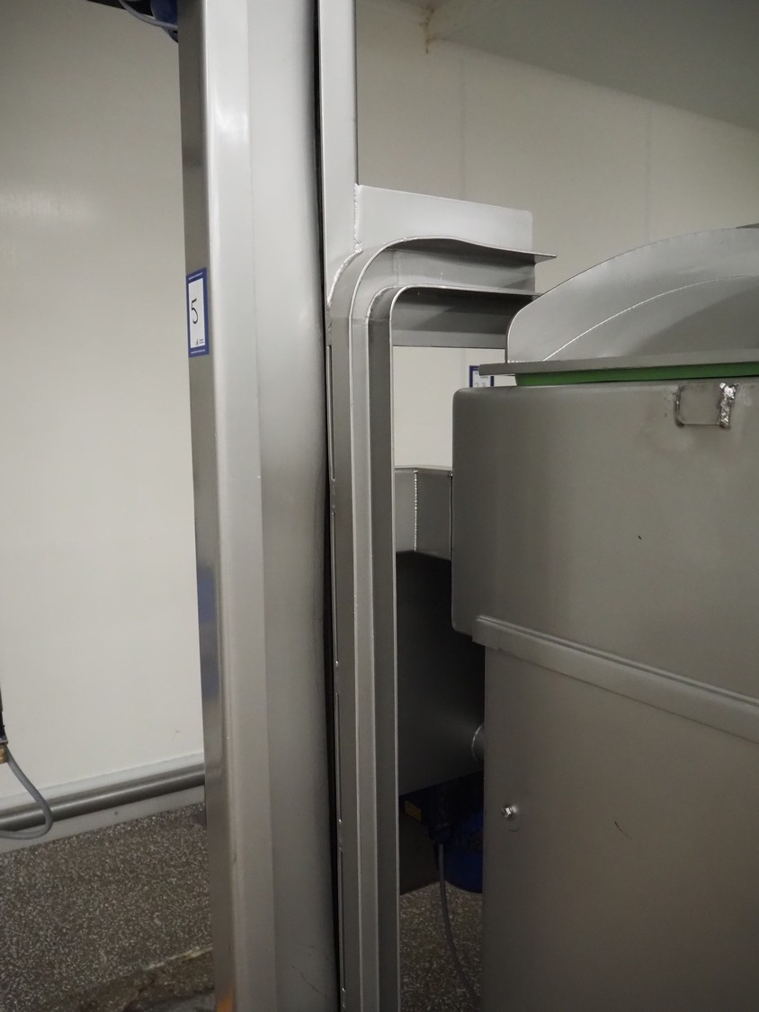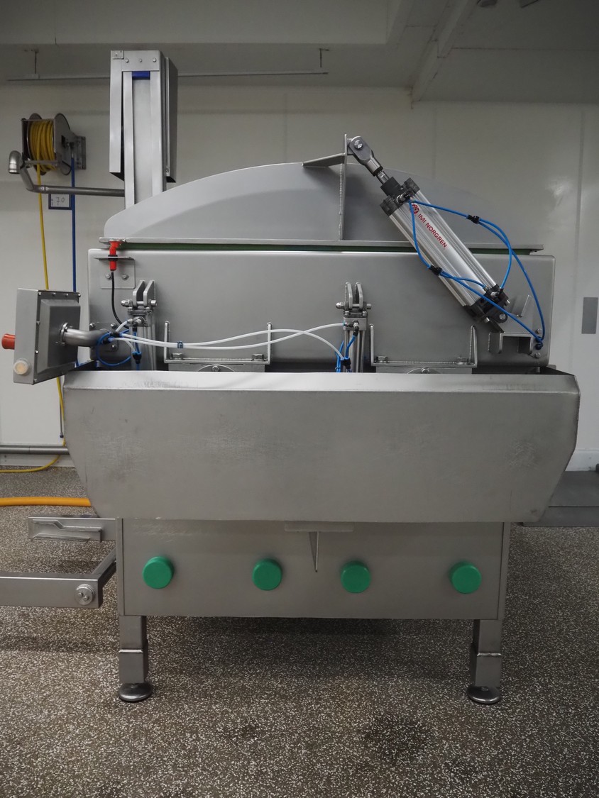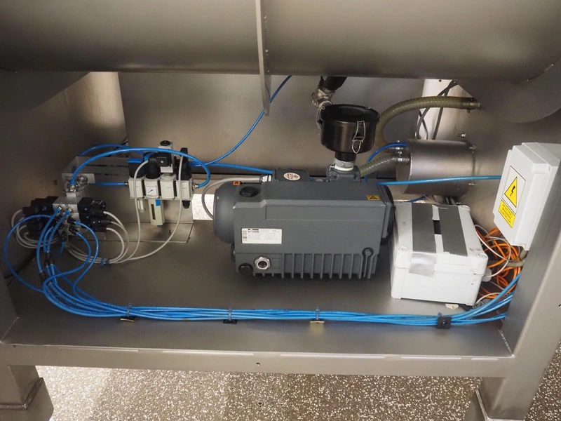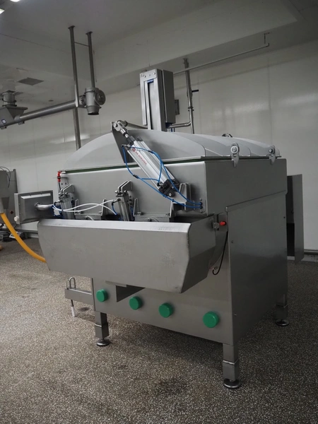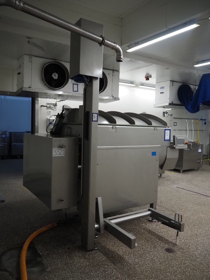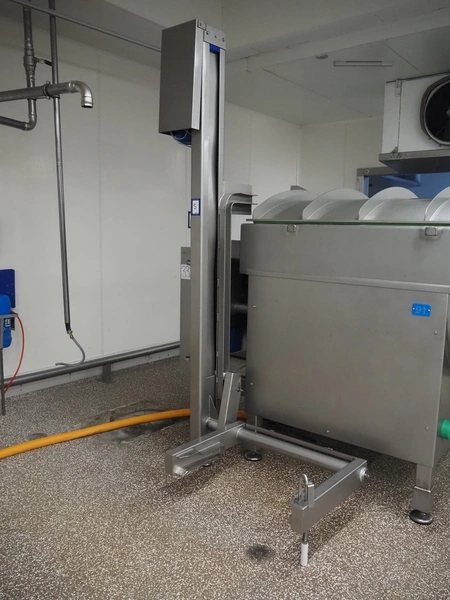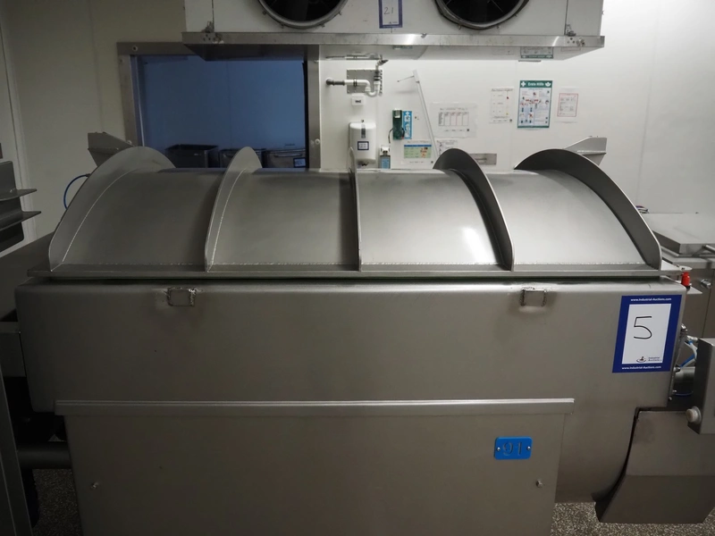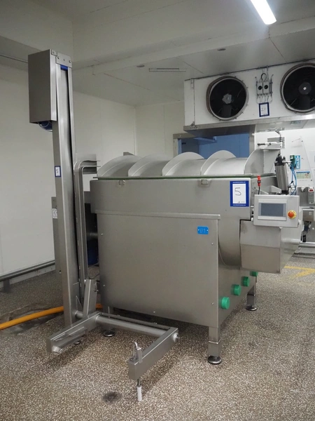 Ekomex double paddle vacuum mixer with lifter for 200 liter meat bins, type: ML-1000V, serial number: 14040801, year of construction: 2018, 3 x 400 V, 50 Hz, 9 kW, Busch vacuum pump, type: KB 0040 D 100, serial number: D16410645, year of construction: 2016, volume: 48 m³ per hour, total dimensions: 2400 mm x 2100 mm x 2700 mm.