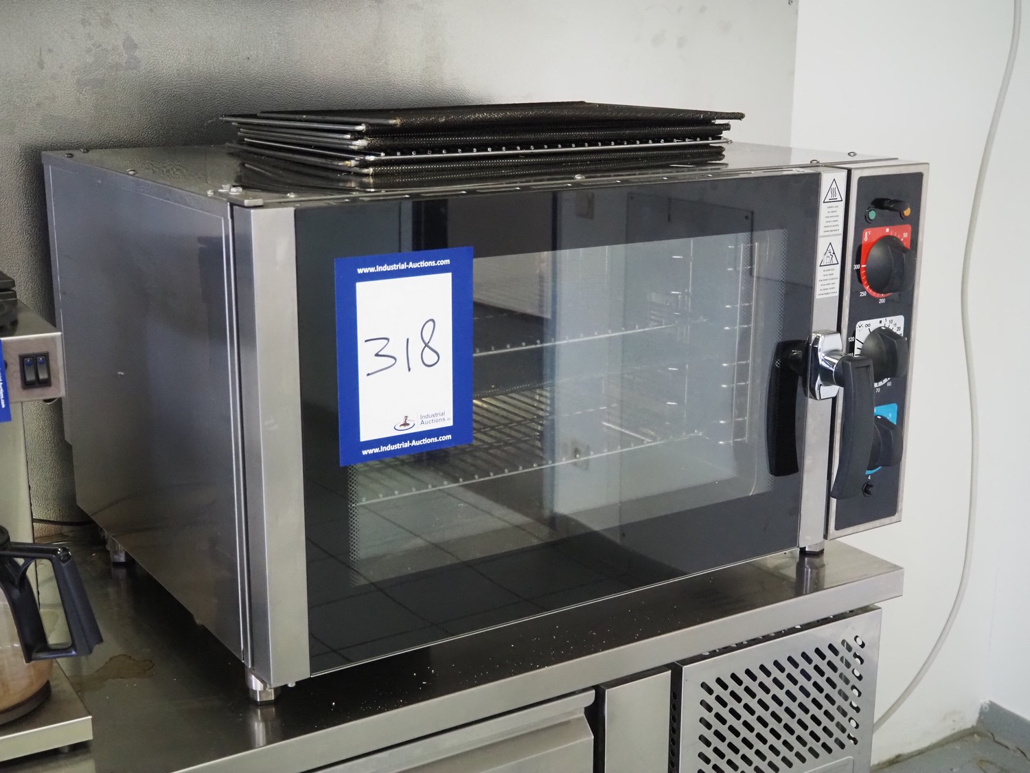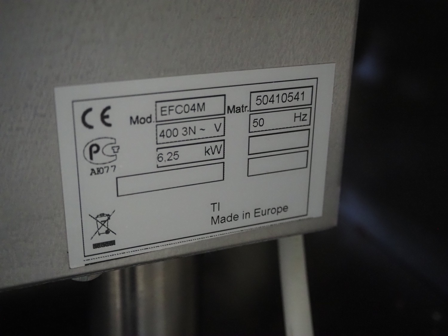 Combisteamer, model: EFC04M, serial number: 50410541, 400 V, 3 Ph, 50 Hz, 6.25 kW, 4 floors, dimensions floors: (4x) 530 mm x 360 mm, total dimensions: 860 mm x 700 mm x 530 mm.