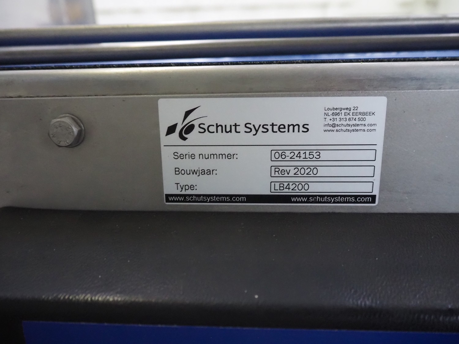 Schut Systems loading conveyor, type: LB4200, serial number: 06-24153, year of construction: 2020, belt width: 185 mm, total dimensions loading conveyor: 4100 mm x 400 mm x 1000 mm.