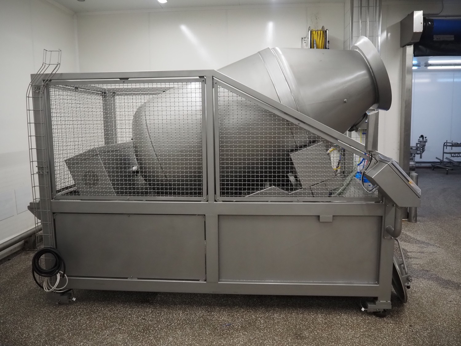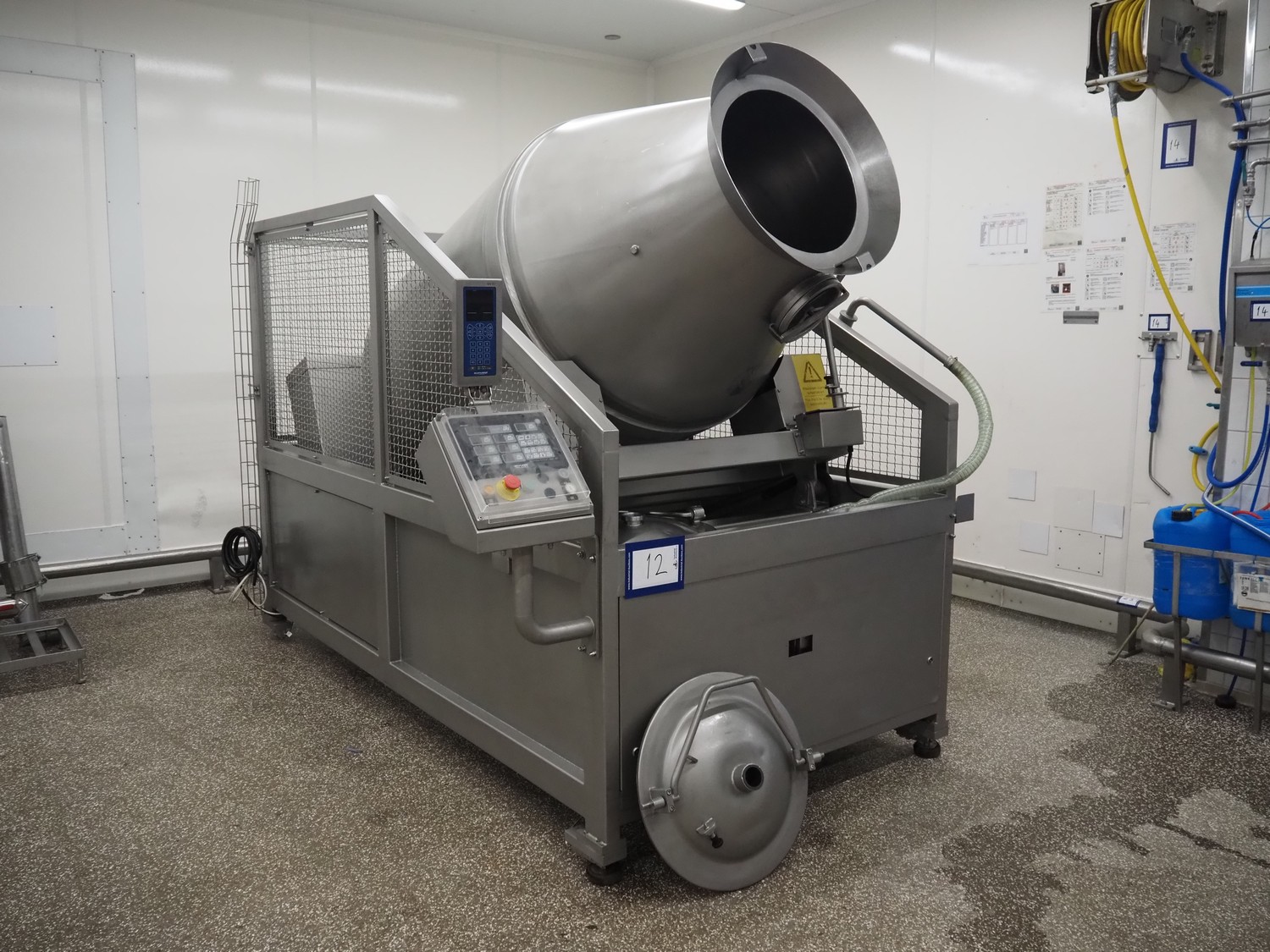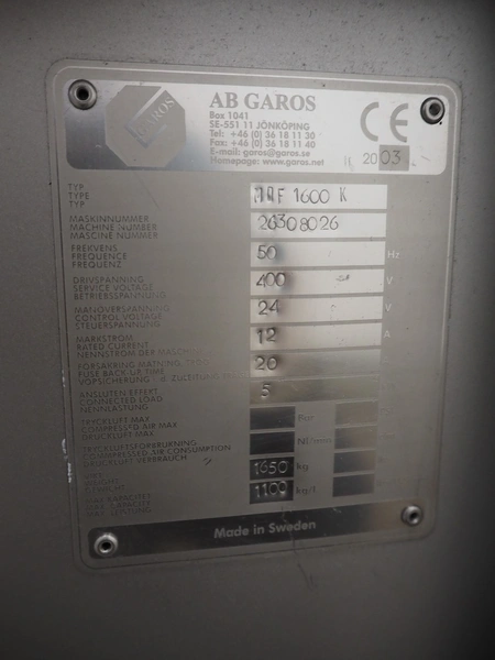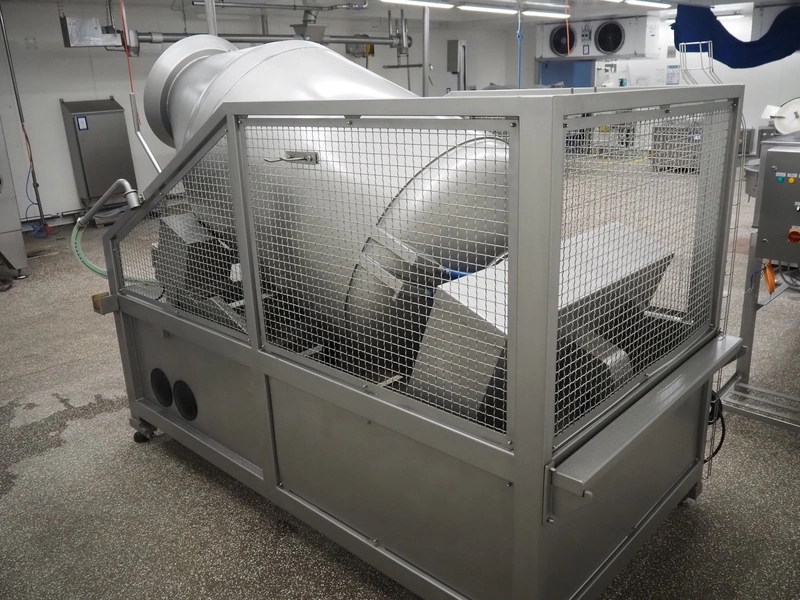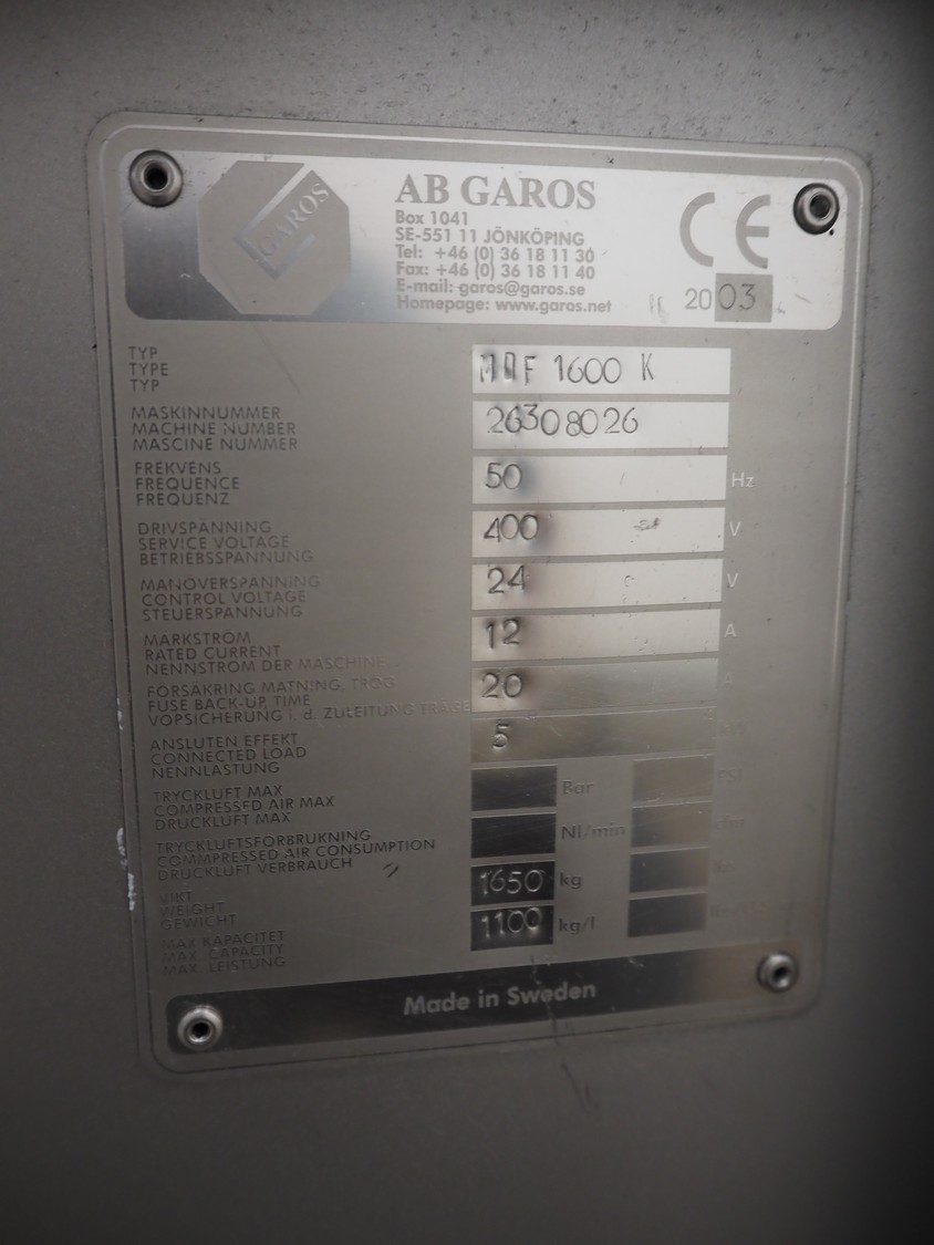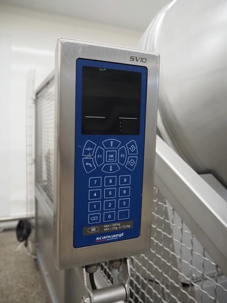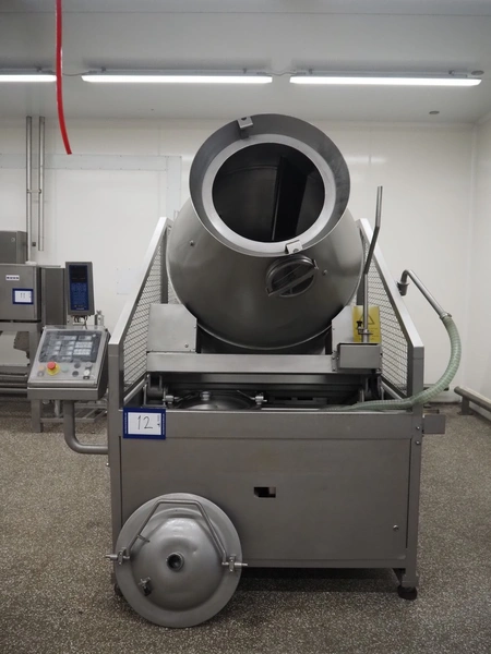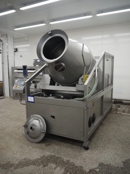 Garos vacuum tumbler with double jacket for cooling on weighing cells, type: MDF1600K, serial number: 26308026, year of construction: 2003, 3 x 380 V, 50 Hz, 5.2 kW, volume: 1600 liter, capacity: maximum 1100 kg, speed: 1.8 - 8.0 rates per minute, infeed height: 1650 mm, outfeed height: 880 mm, weight: 1650 kg, total dimensions: 3070 mm x 1900 mm x 2250 mm.