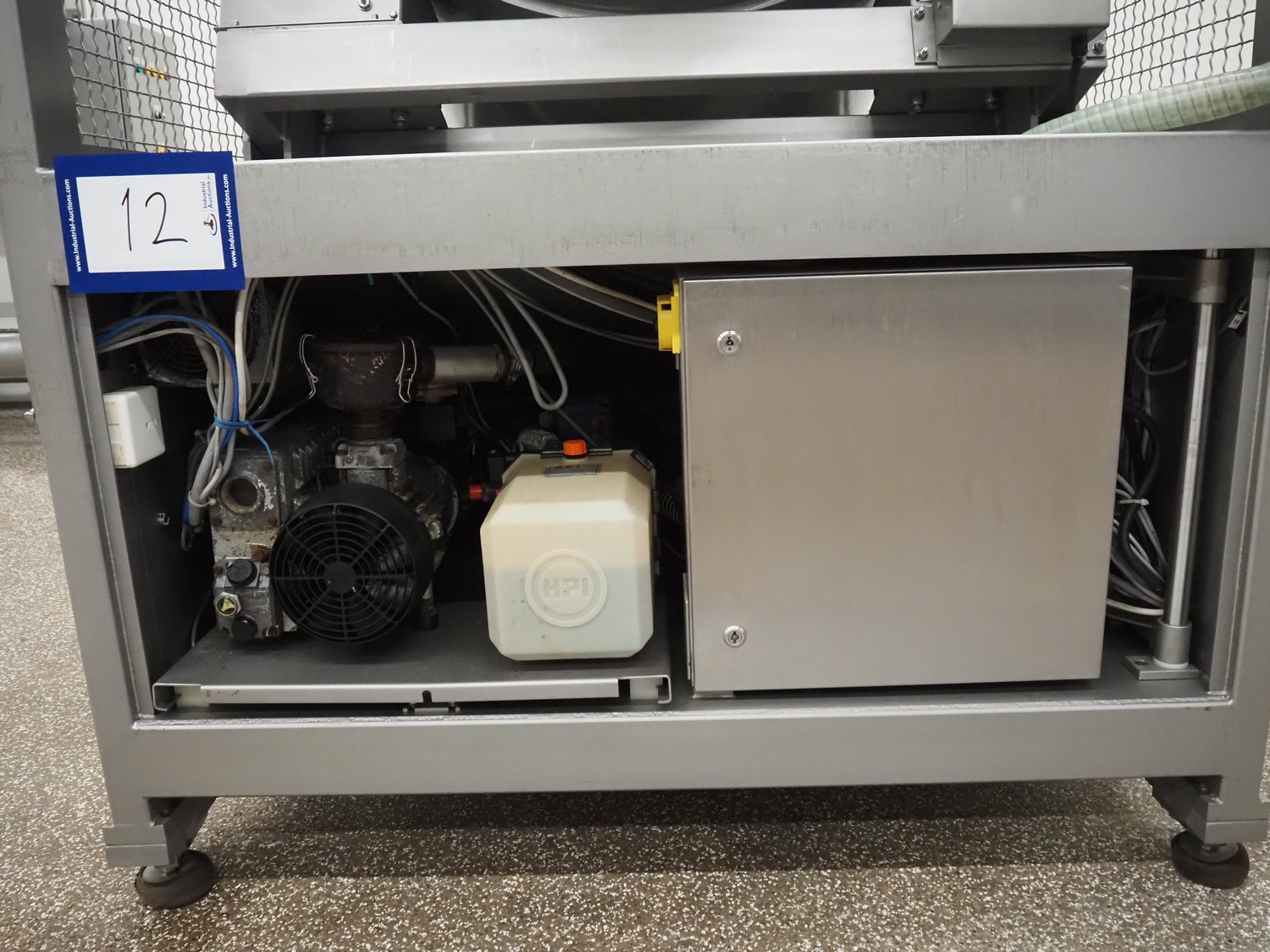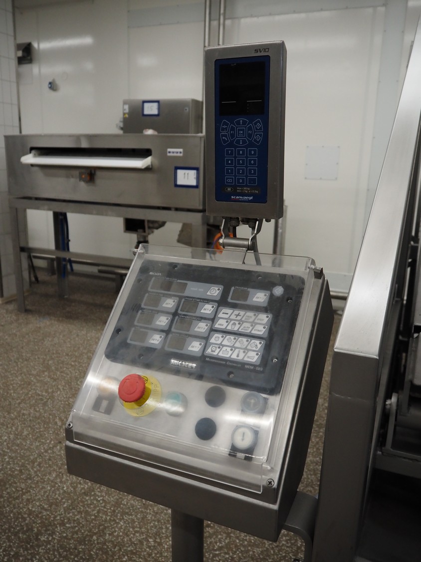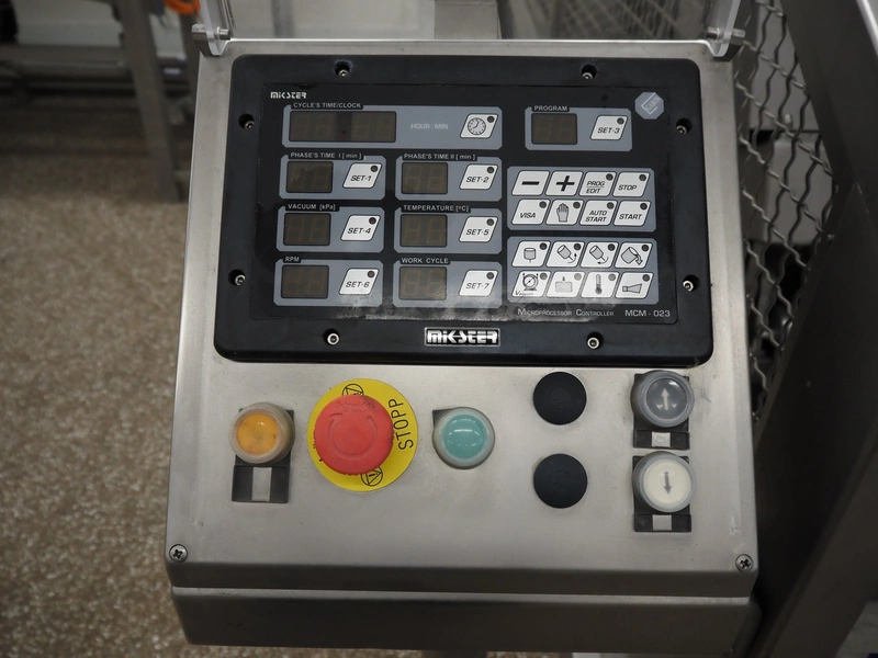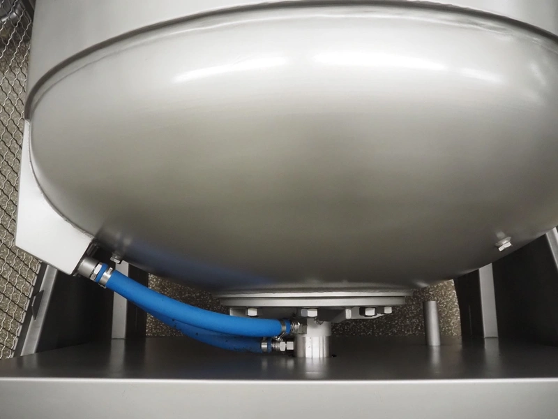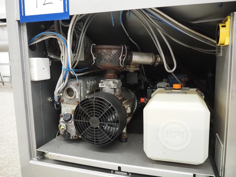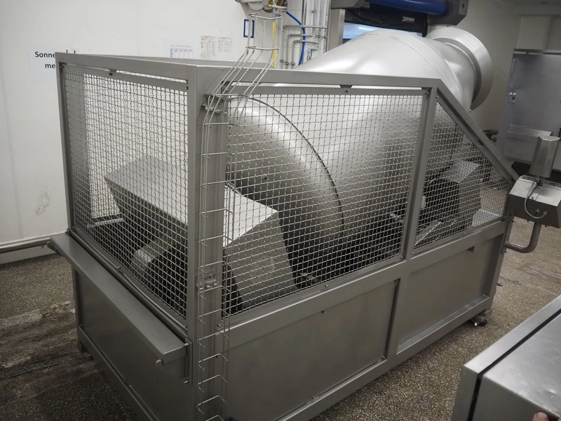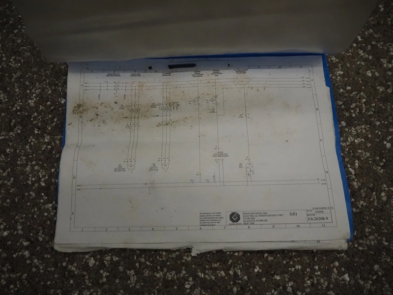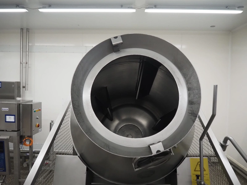 Garos vacuum tumbler with double jacket for cooling on weighing cells, type: MDF1600K, serial number: 26308026, year of construction: 2003, 3 x 380 V, 50 Hz, 5.2 kW, volume: 1600 liter, capacity: maximum 1100 kg, speed: 1.8 - 8.0 rates per minute, infeed height: 1650 mm, outfeed height: 880 mm, weight: 1650 kg, total dimensions: 3070 mm x 1900 mm x 2250 mm.