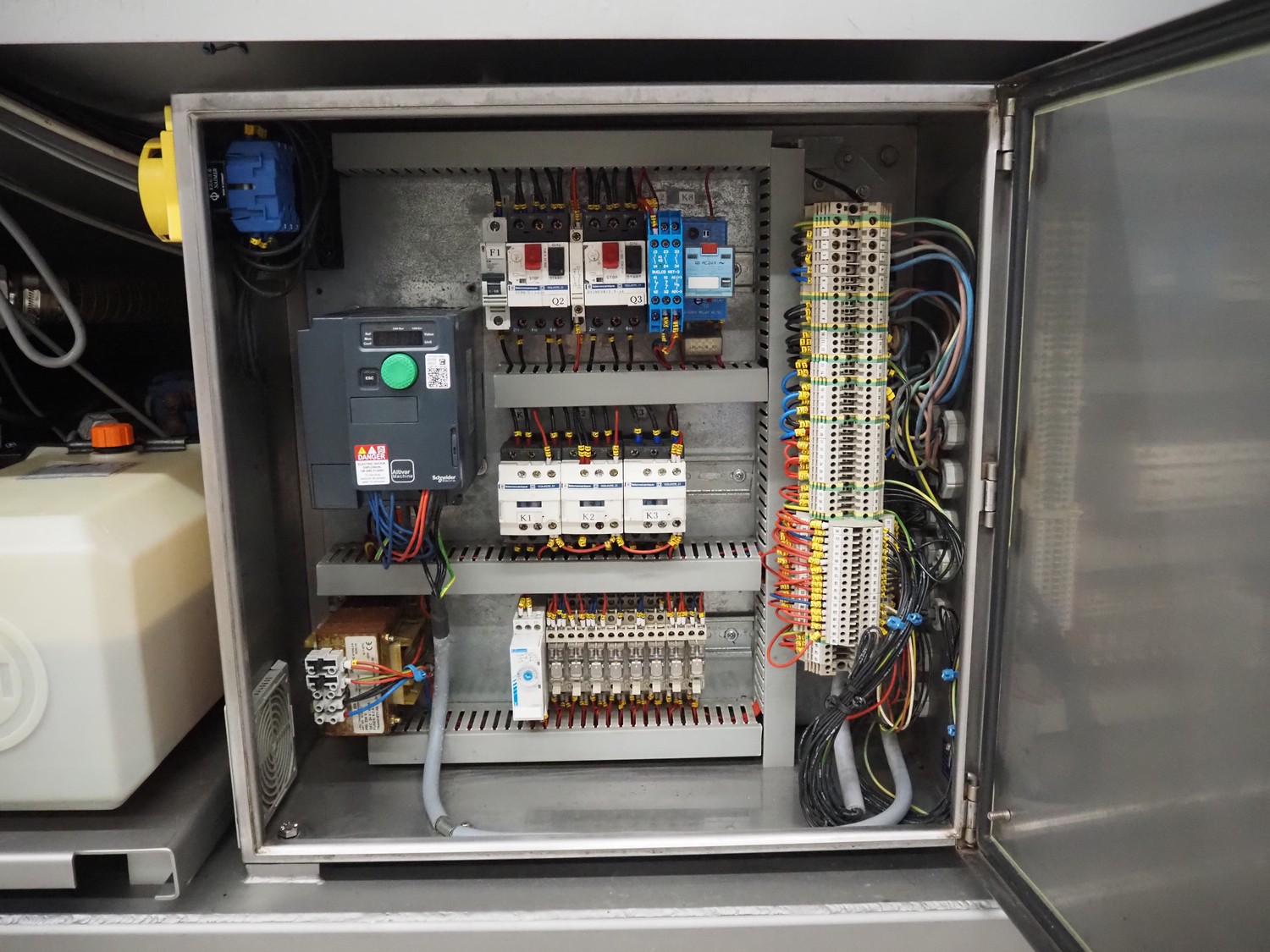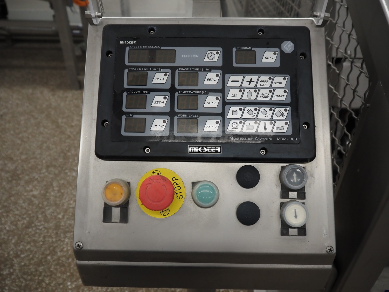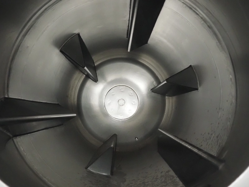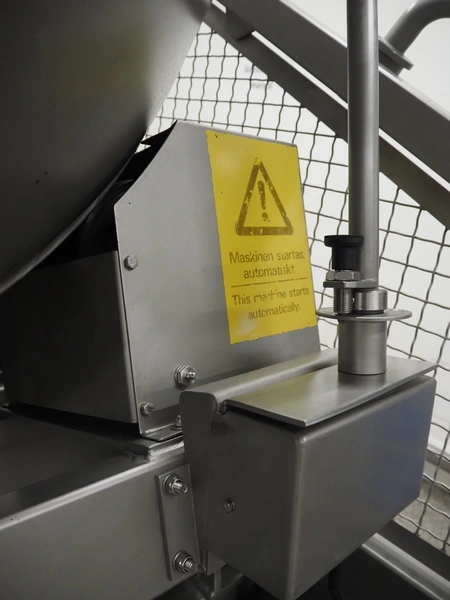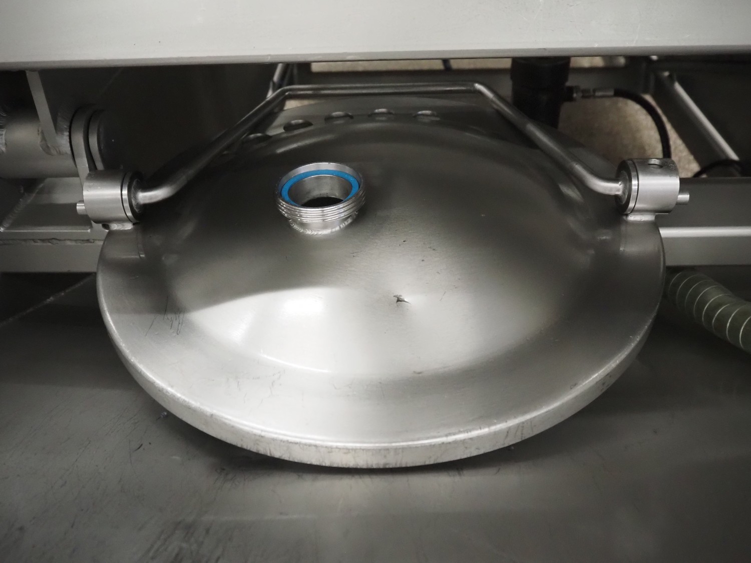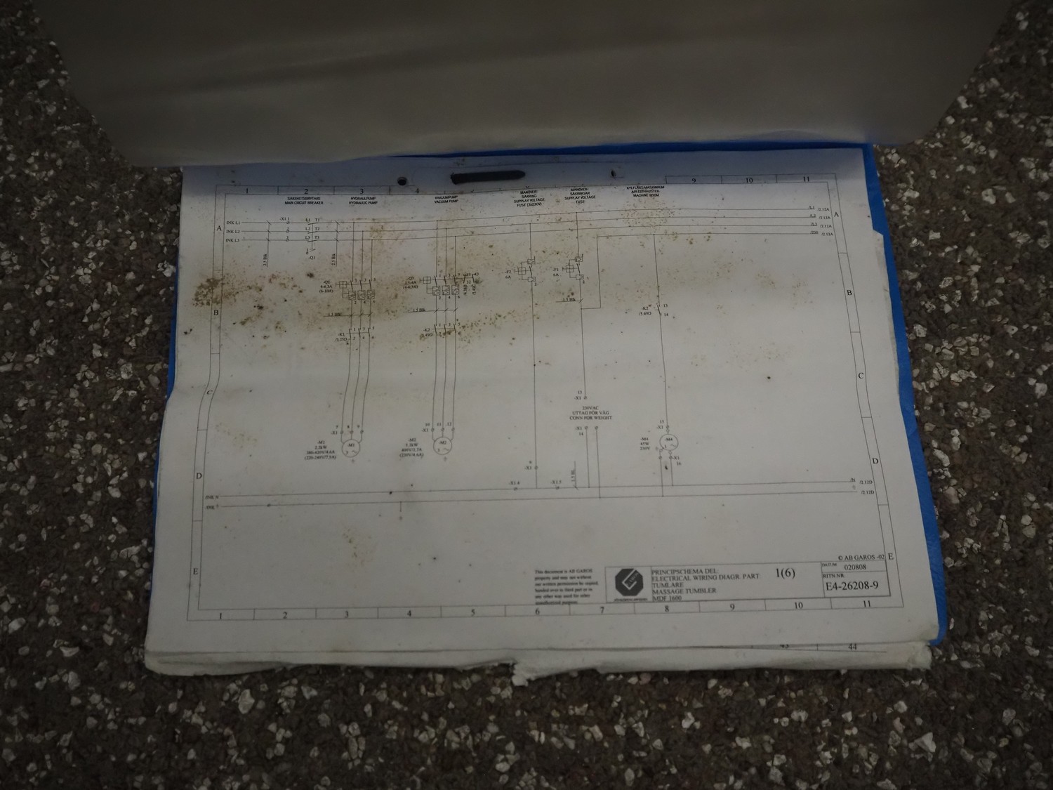 Garos vacuum tumbler with double jacket for cooling on weighing cells, type: MDF1600K, serial number: 26308026, year of construction: 2003, 3 x 380 V, 50 Hz, 5.2 kW, volume: 1600 liter, capacity: maximum 1100 kg, speed: 1.8 - 8.0 rates per minute, infeed height: 1650 mm, outfeed height: 880 mm, weight: 1650 kg, total dimensions: 3070 mm x 1900 mm x 2250 mm.