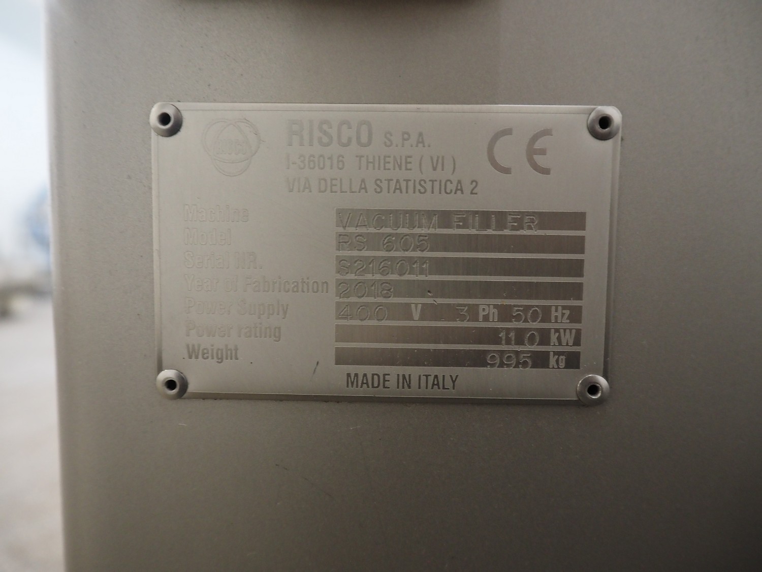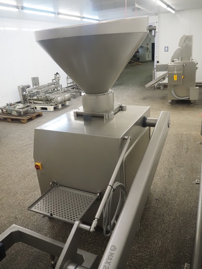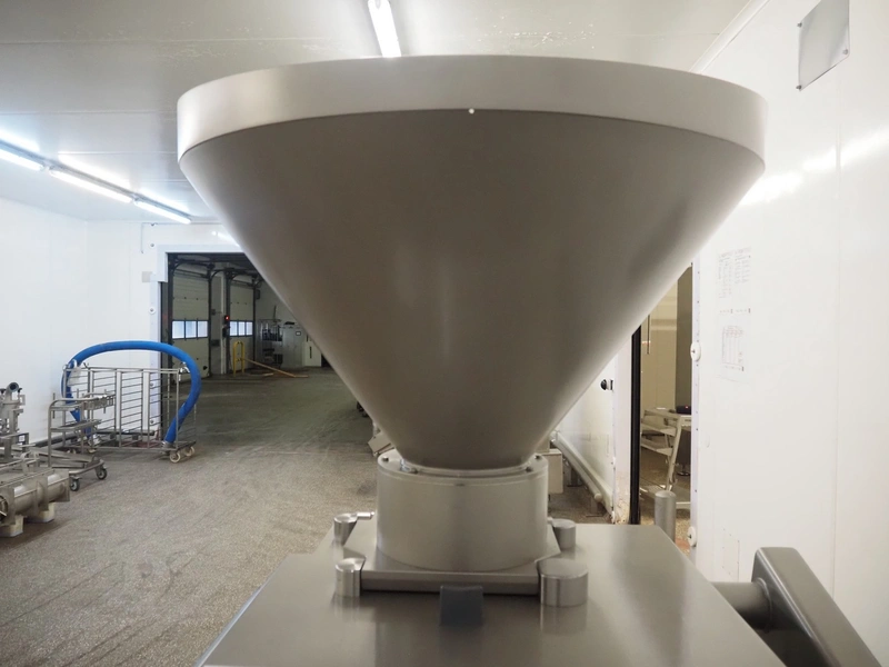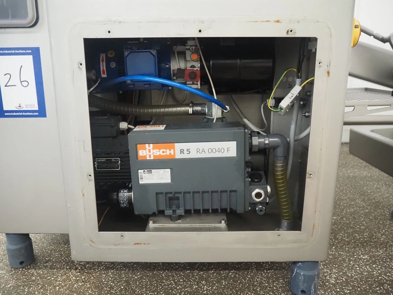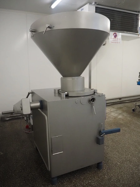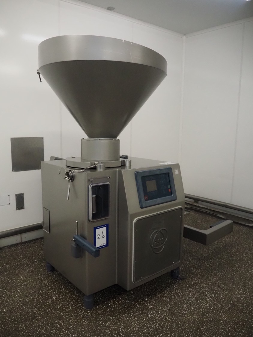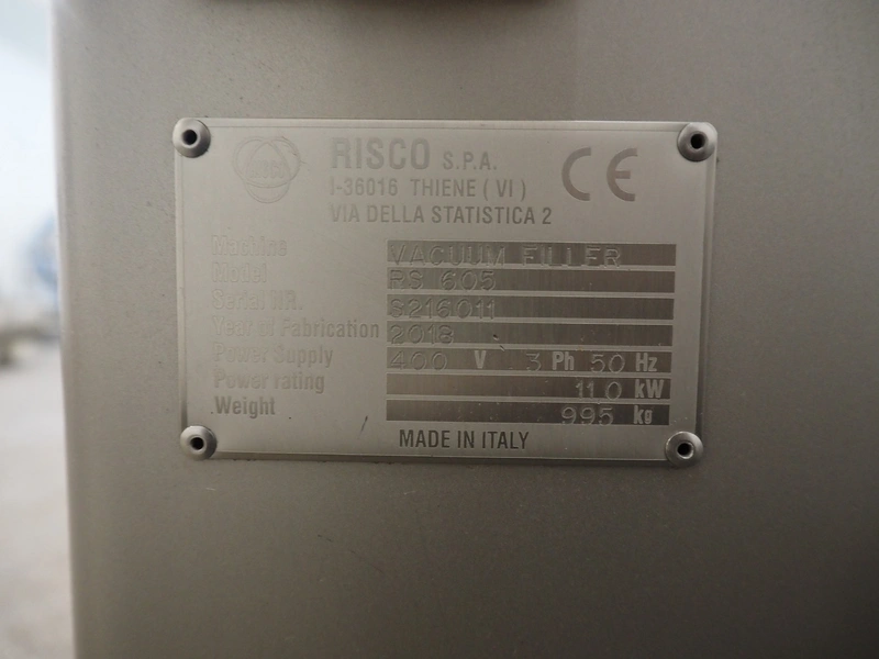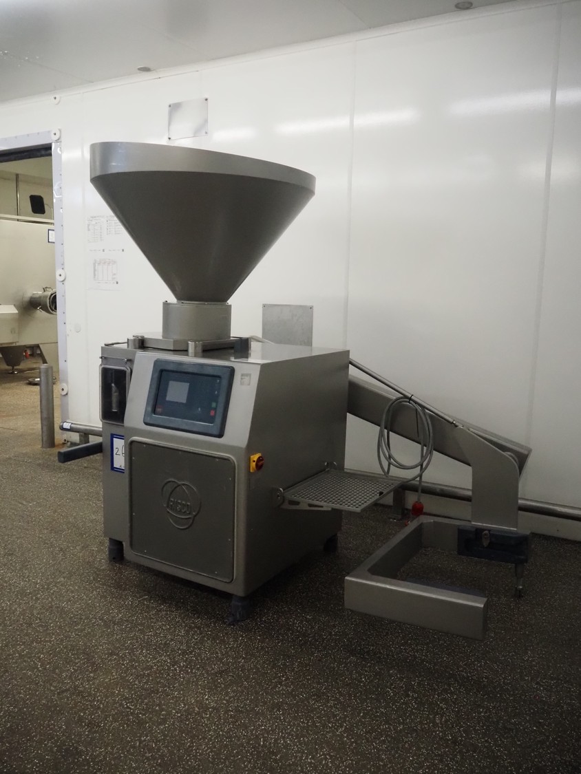 Risco vacuum filling machine with lifter for 200 liter meat bins, type: RS605, serial number: S216011, year of construction: 2018, 3 x 400 V, 50 Hz, 11 kW, filling and portioning, filling pressure: maximum: 40 bar, hopper: 350 liter, weight: 995 kg, built-in Busch vacuum pump, type: RA 0040 F 5Z3, capacity: 48 m³ per hour, dimensions: 1300 mm x 2050 mm x 2100 mm.