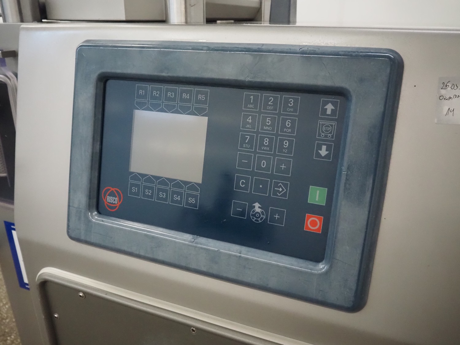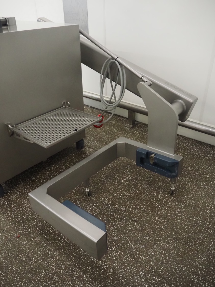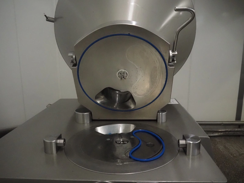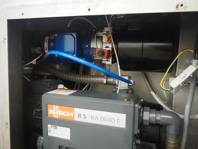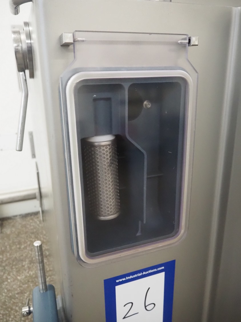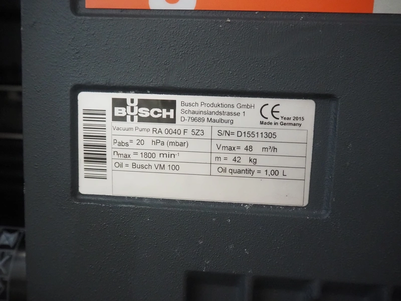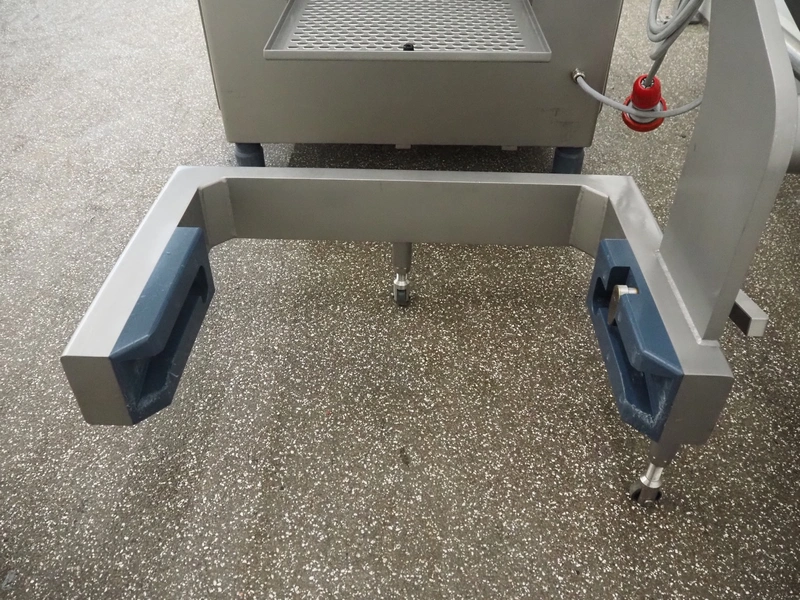 Risco vacuum filling machine with lifter for 200 liter meat bins, type: RS605, serial number: S216011, year of construction: 2018, 3 x 400 V, 50 Hz, 11 kW, filling and portioning, filling pressure: maximum: 40 bar, hopper: 350 liter, weight: 995 kg, built-in Busch vacuum pump, type: RA 0040 F 5Z3, capacity: 48 m³ per hour, dimensions: 1300 mm x 2050 mm x 2100 mm.