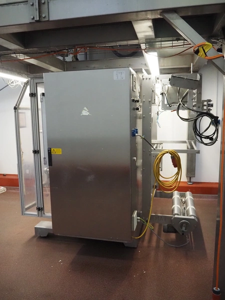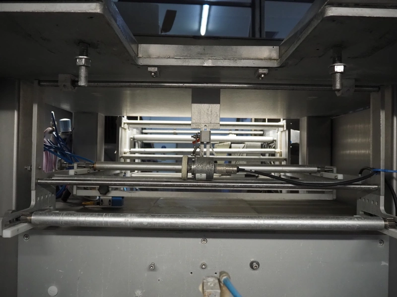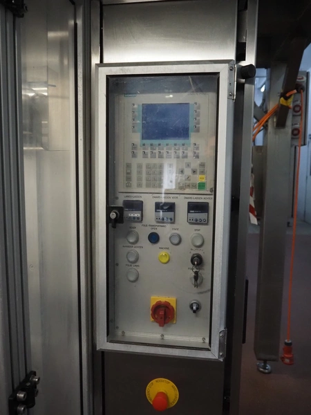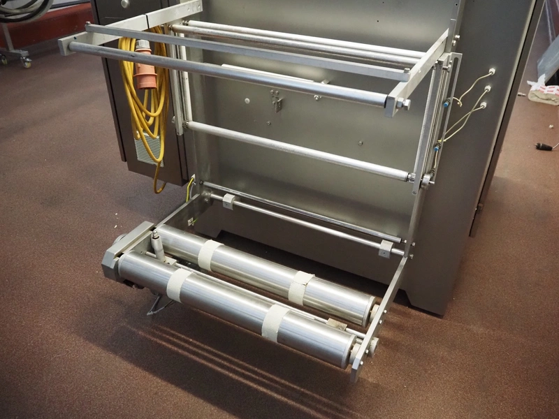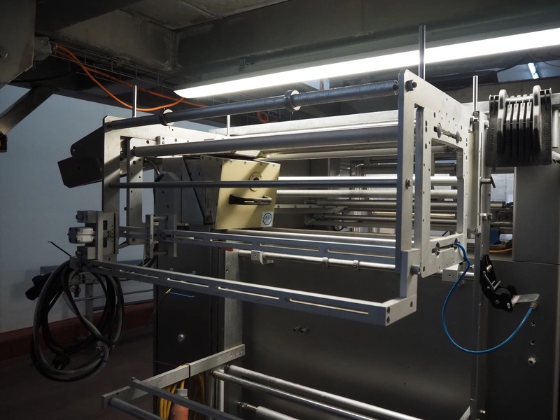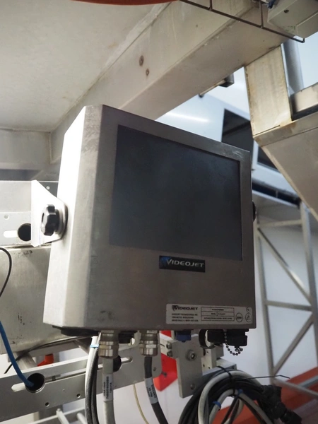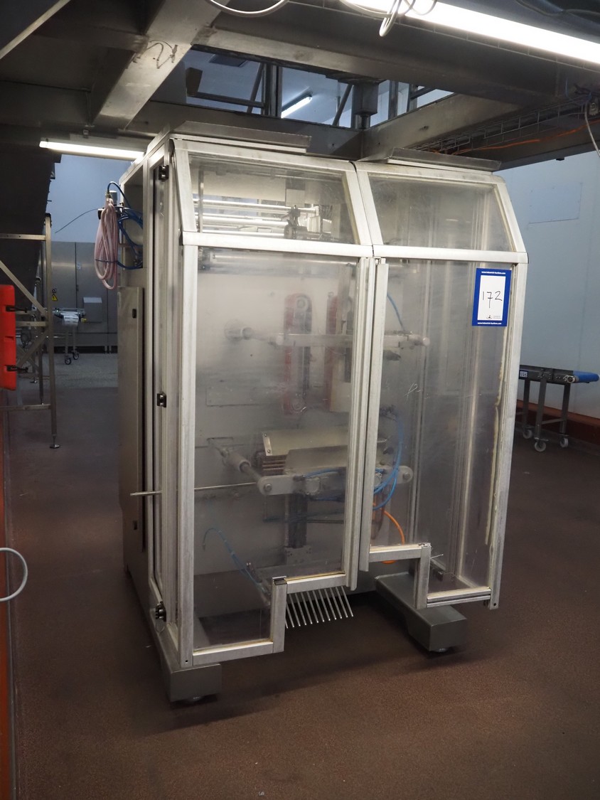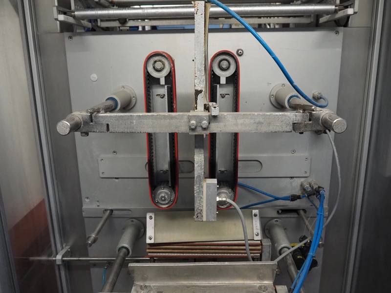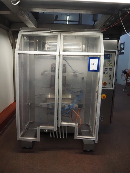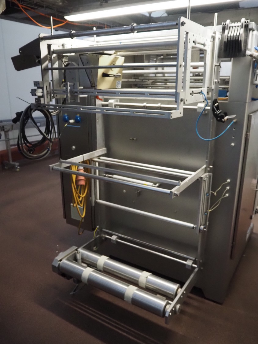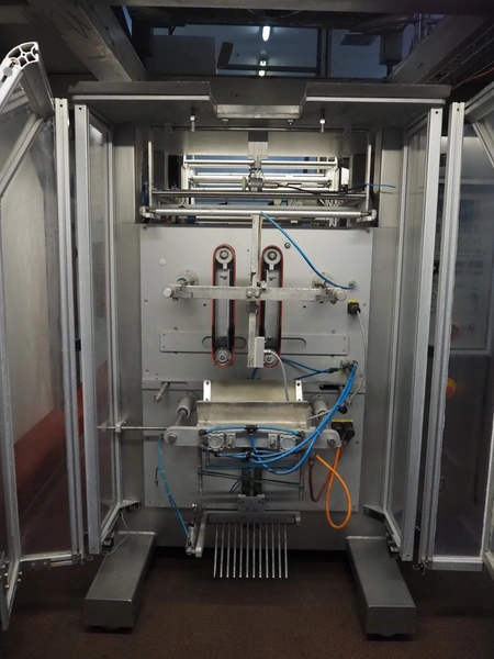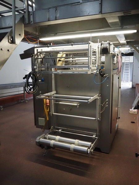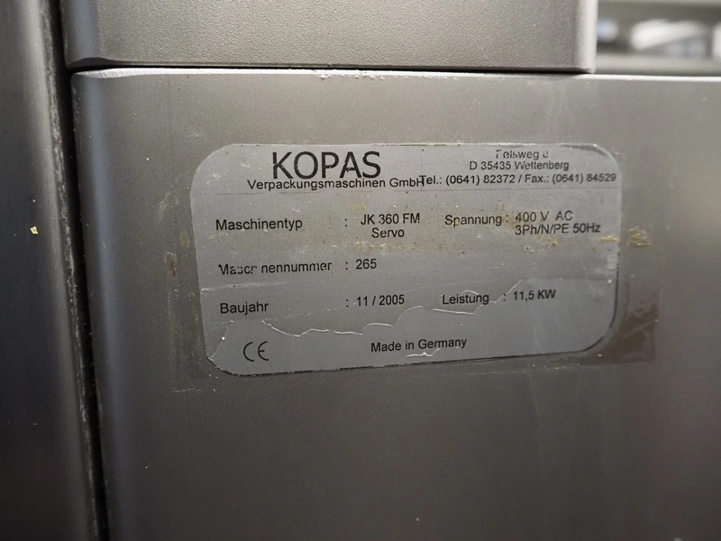 Kopas Verpackungsmaschinen GmbH vertical bag form-, fill-, and seal machine, type: JK 360 FM, machine number: 265, year of construction: 11/2005, 400 V, 3 Ph, 50 Hz, 11.5 kW, vertical seal length: 500 mm, horizontal seal length: 380 mm, film width: 780 mm, VideoJet barcode printer, model: 8.4 CLARITY, total dimensions: 2200 mm x 1700 mm x 1920 mm. Missing filling pipe.