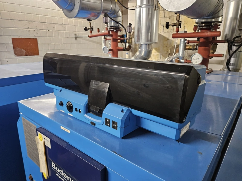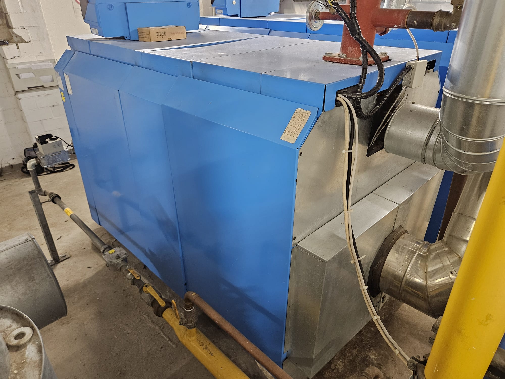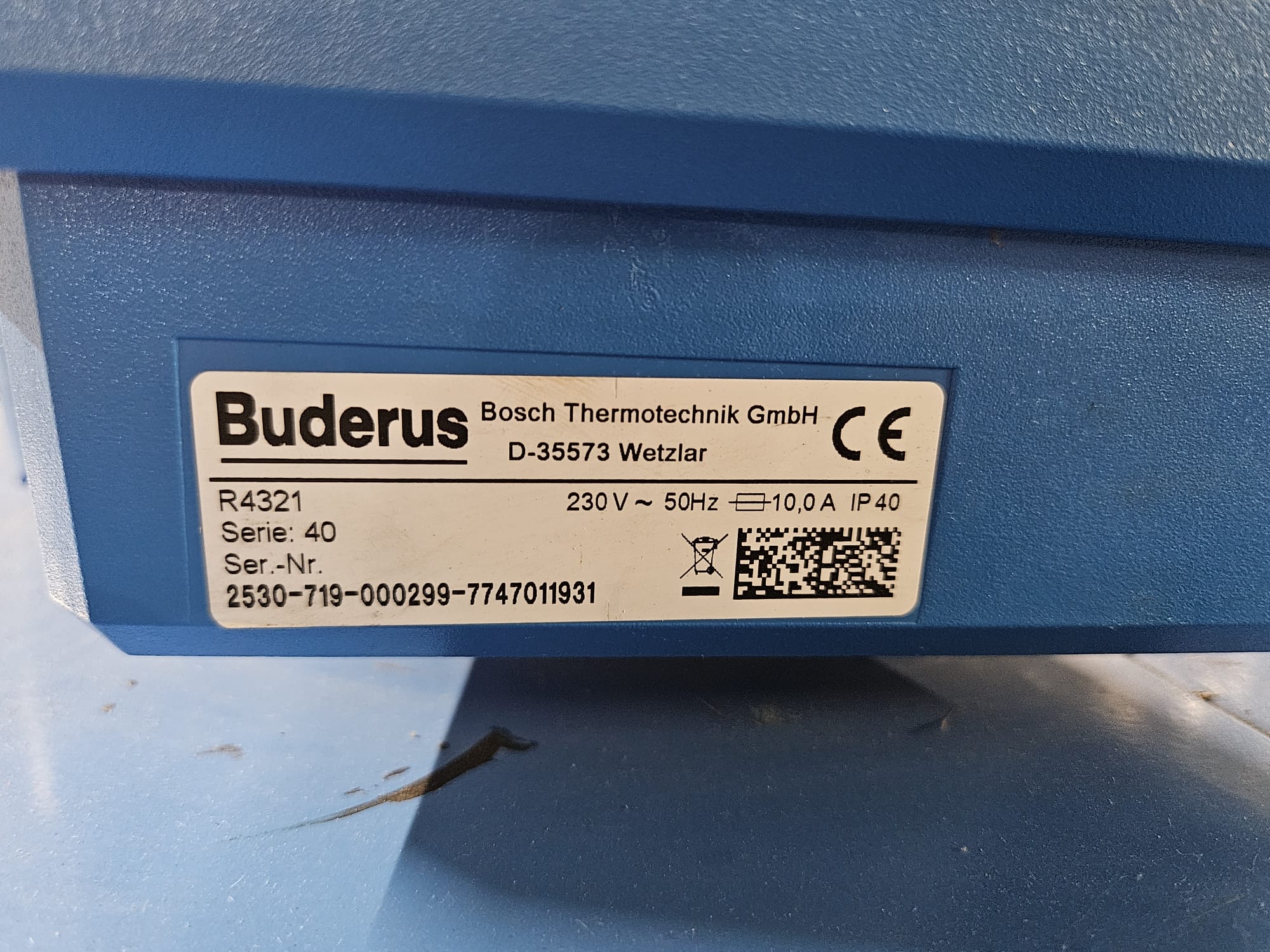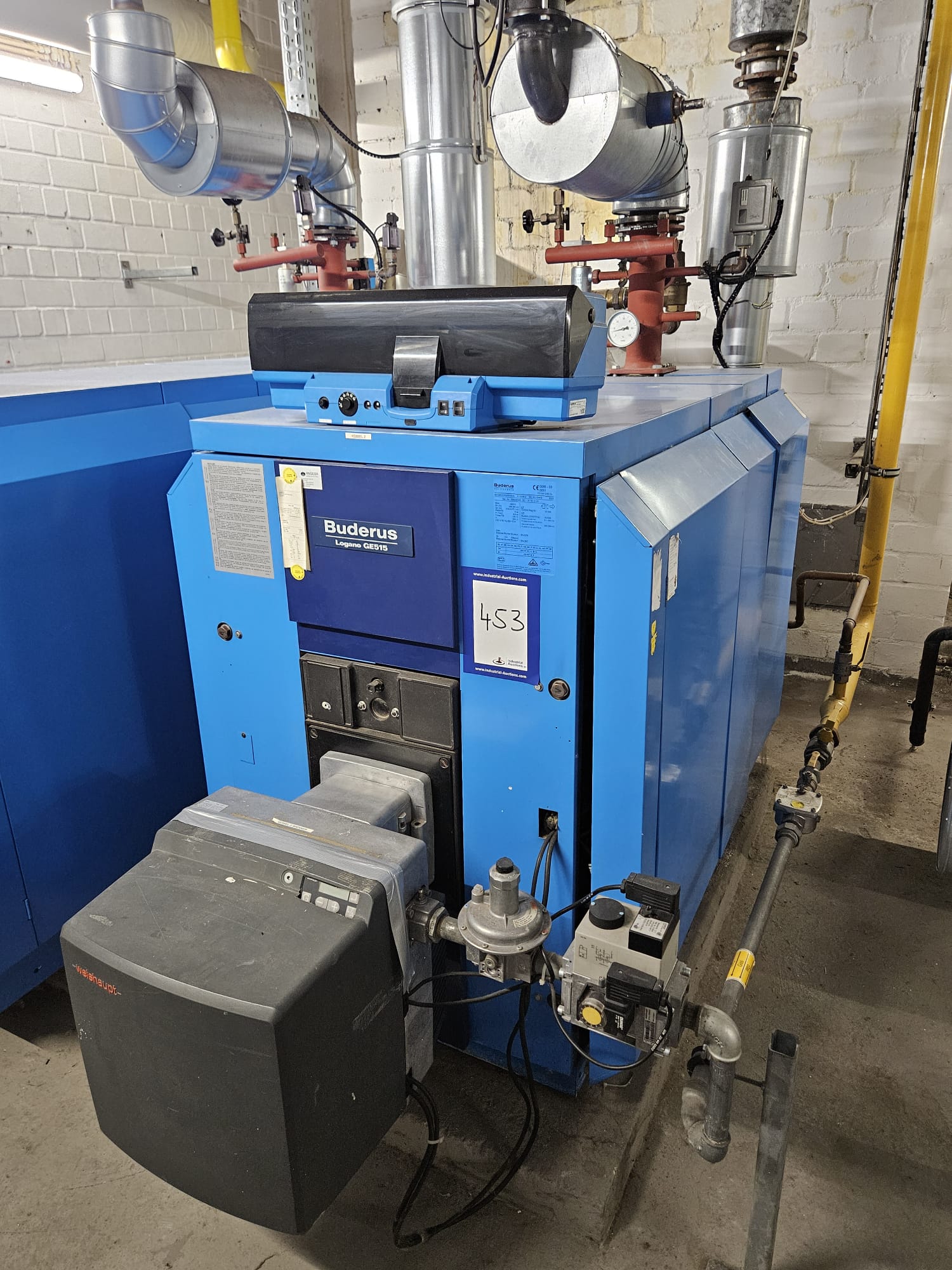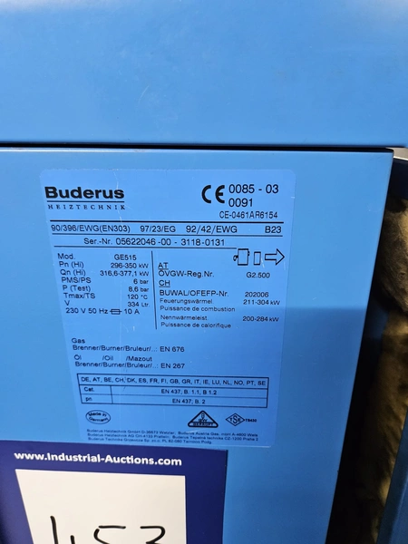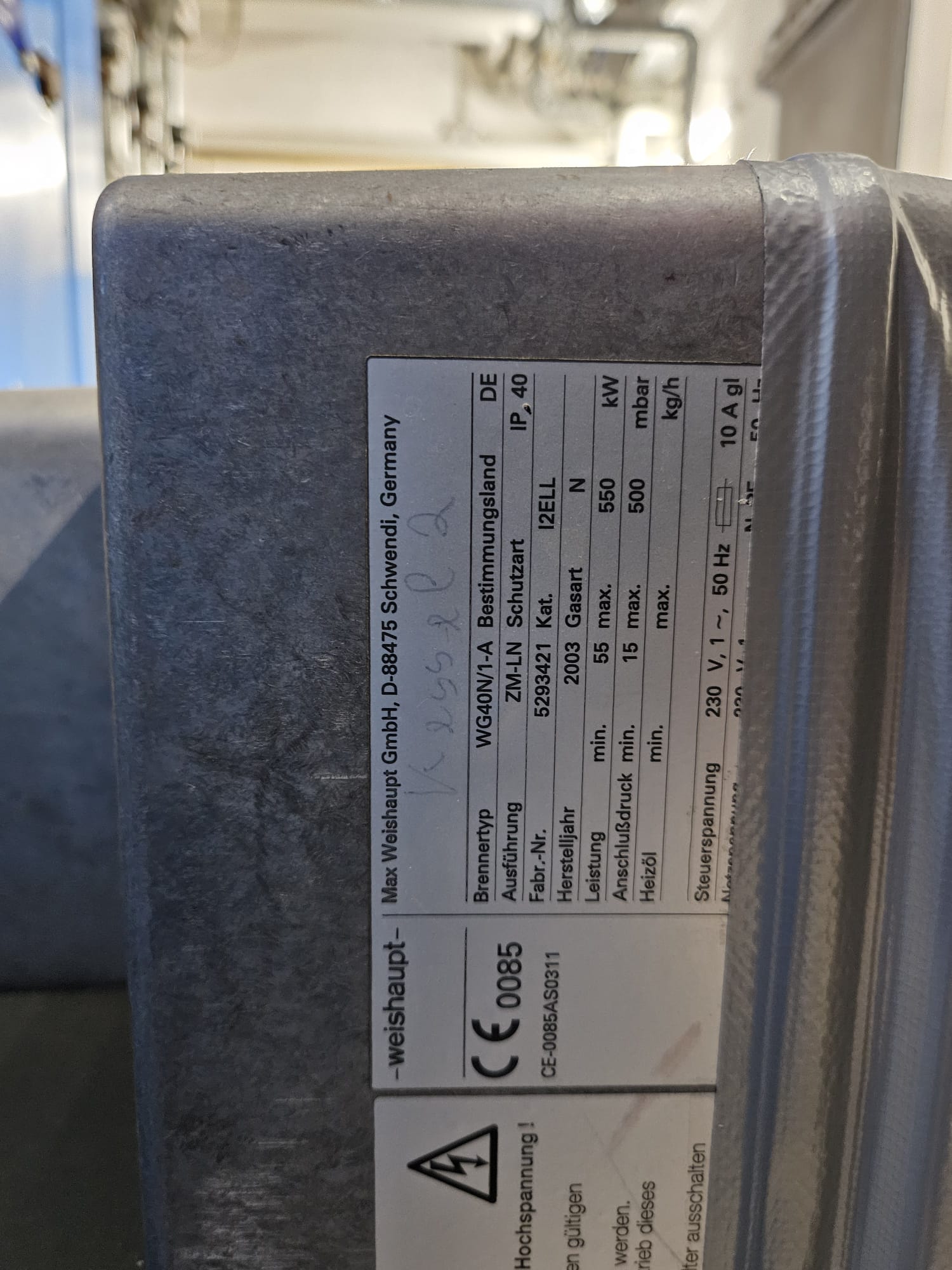 Buderus boiler with Weishaupt burner, type boiler: GE515, Pn (Hi): 296- 350 kW, Qn (Hi): 316.6 - 377.1 kW, volume: 334 liter, test pressure: 8.6 bar, Weishaupt burner, burner type: WG40N/1-A, serial number: 5293421, year of construction: 2003, minimum capacity: 55kW, maximum capacity: 550 kW, maximum: 500 mbar, 230 V / 400 V, 1-3 Ph, 50 Hz, total dimensions: 1000 mm x 2400 mm x 2000 mm. Including Wilo circulation pump.