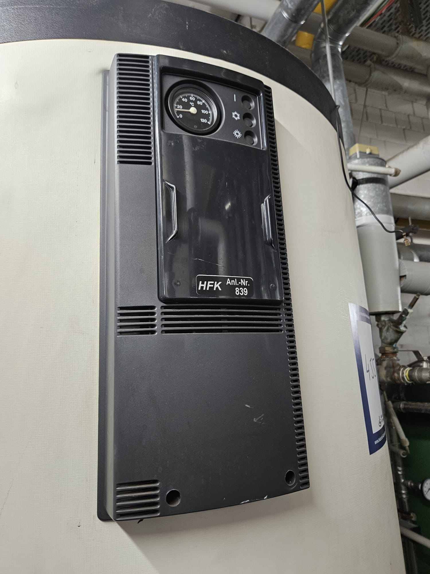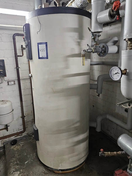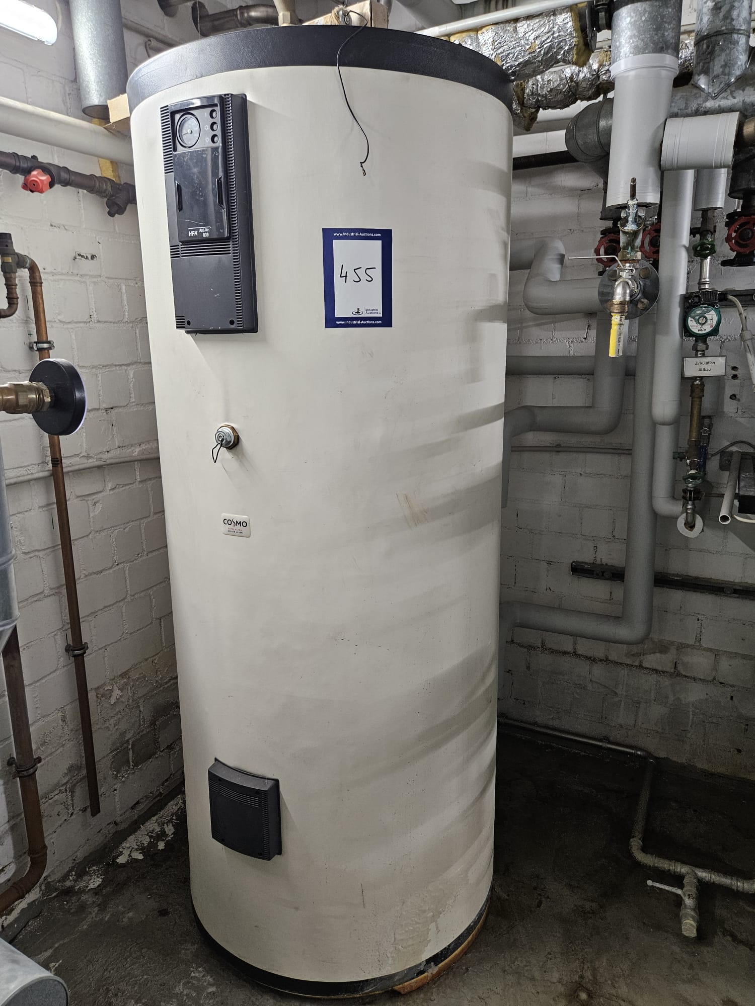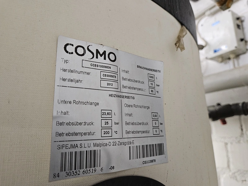 Cosmo boiler, type: CCES1000WEN, production number: CE0005879, year of construction: 2012, working pressure: 10 bar, working temperature: 90 degree Celsius, volume: 1000 liter, diameter: 950 mm, height: 2300 mm.
