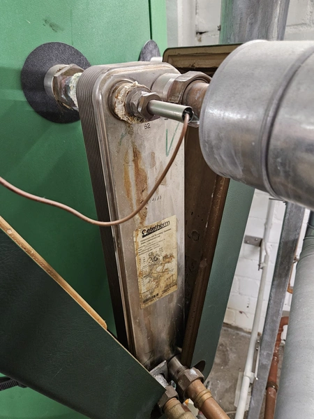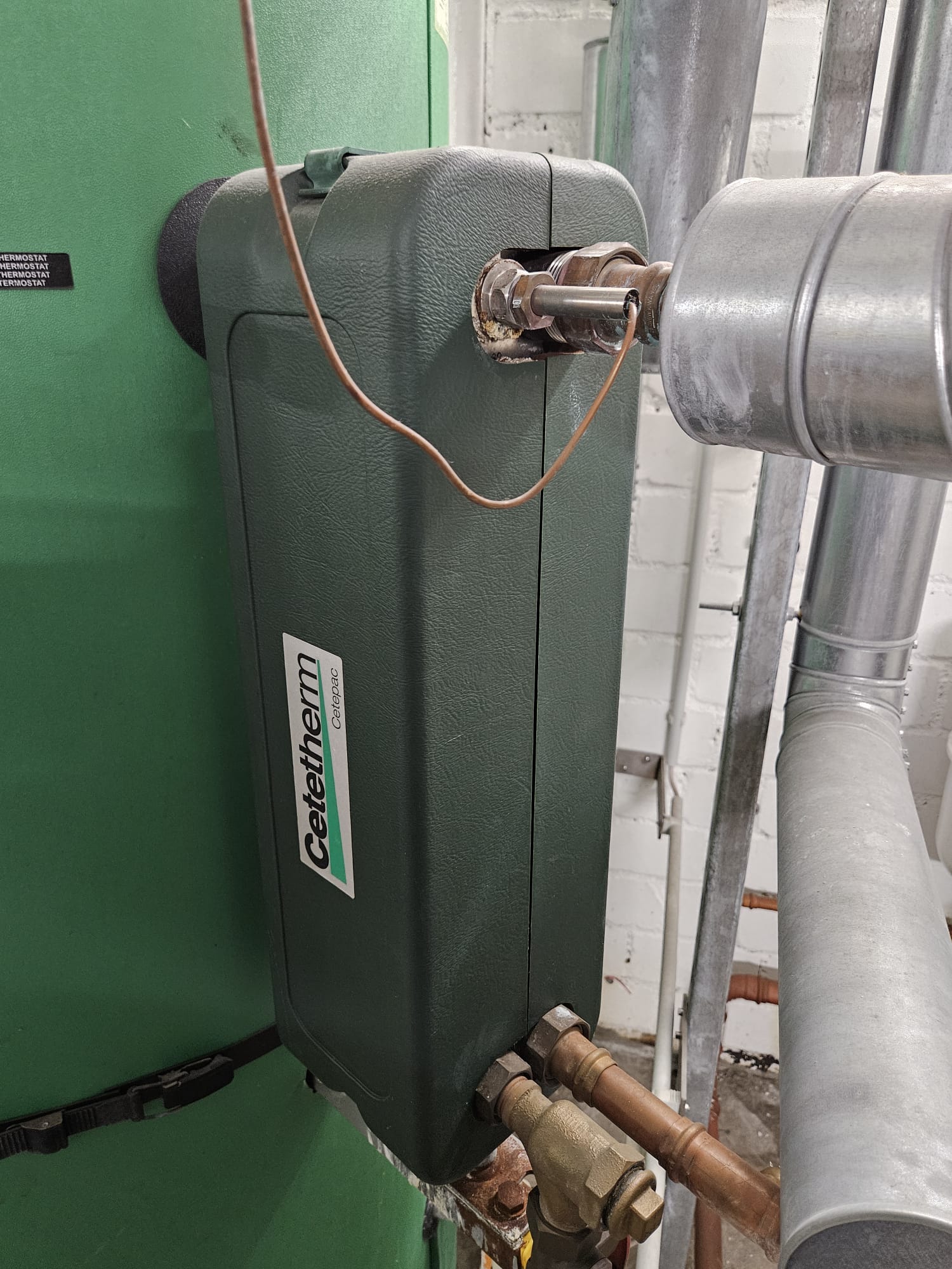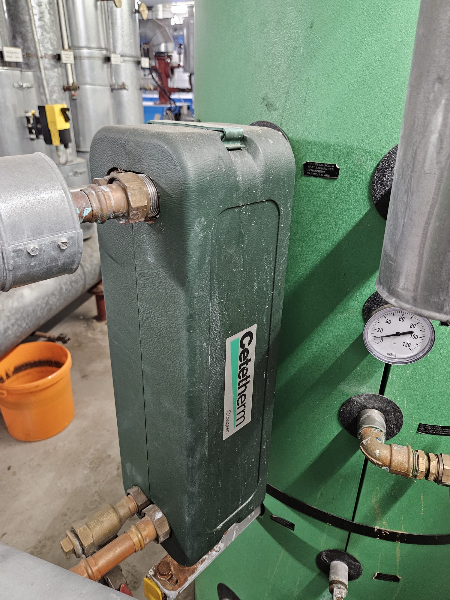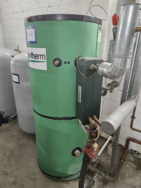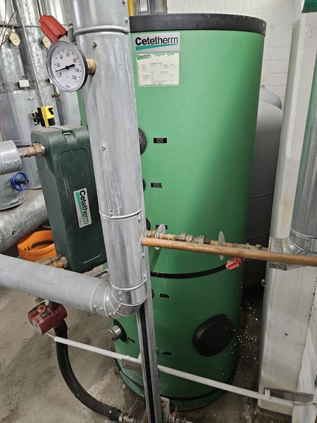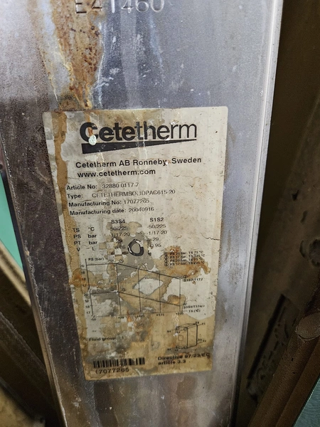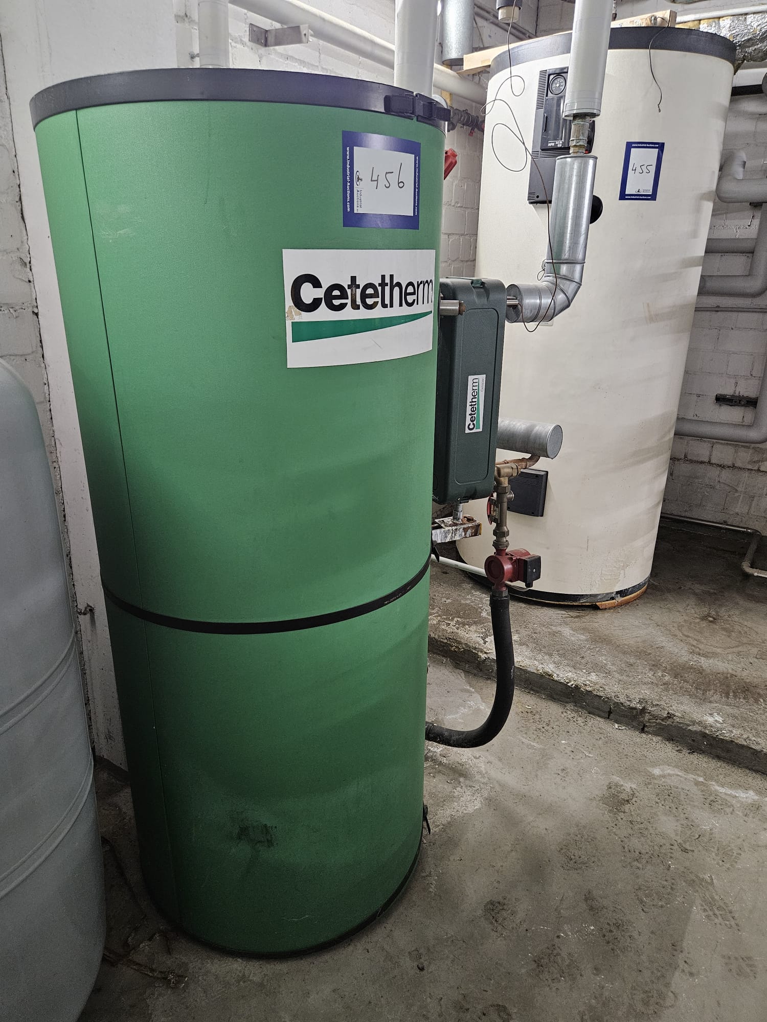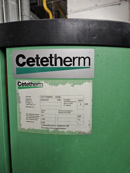 Cetetherm boiler with heat exchanger, type: CETENIRO 500E, manufacturing number: E50237 PS, year of construction: 2004 9 kW, maximum working pressure: 10 bar, maximum working temperature: 95 degree Celsius, volume: 500 liter, diameter: 800 mm, height: 1900 mm, Cetetherm heat exchanger, model: Cetethermsolidpac 615-20, number: 17077265, year of construction: 2004.