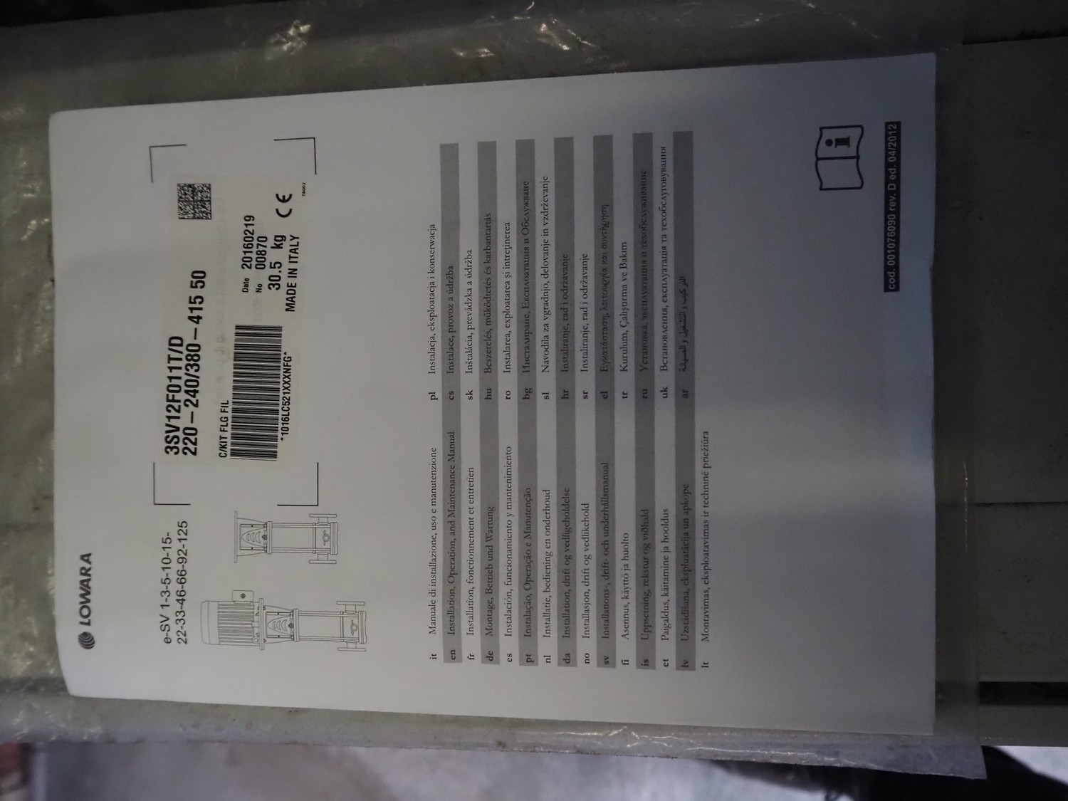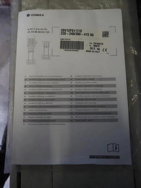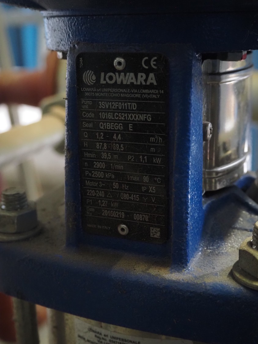 Lowara high pressure system with 2 Lowara circulation pumps, pump unit: (2x) 3SV12F011T/D, capacity: 1.2 / 4.4 m³ per hour, 2900 rates per minute, total dimensions: 1100 mm x 1000 mm x 950 mm.