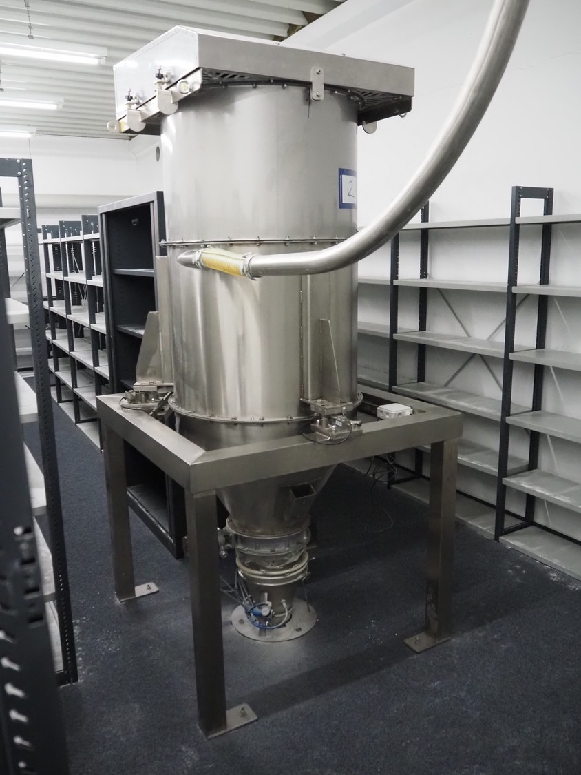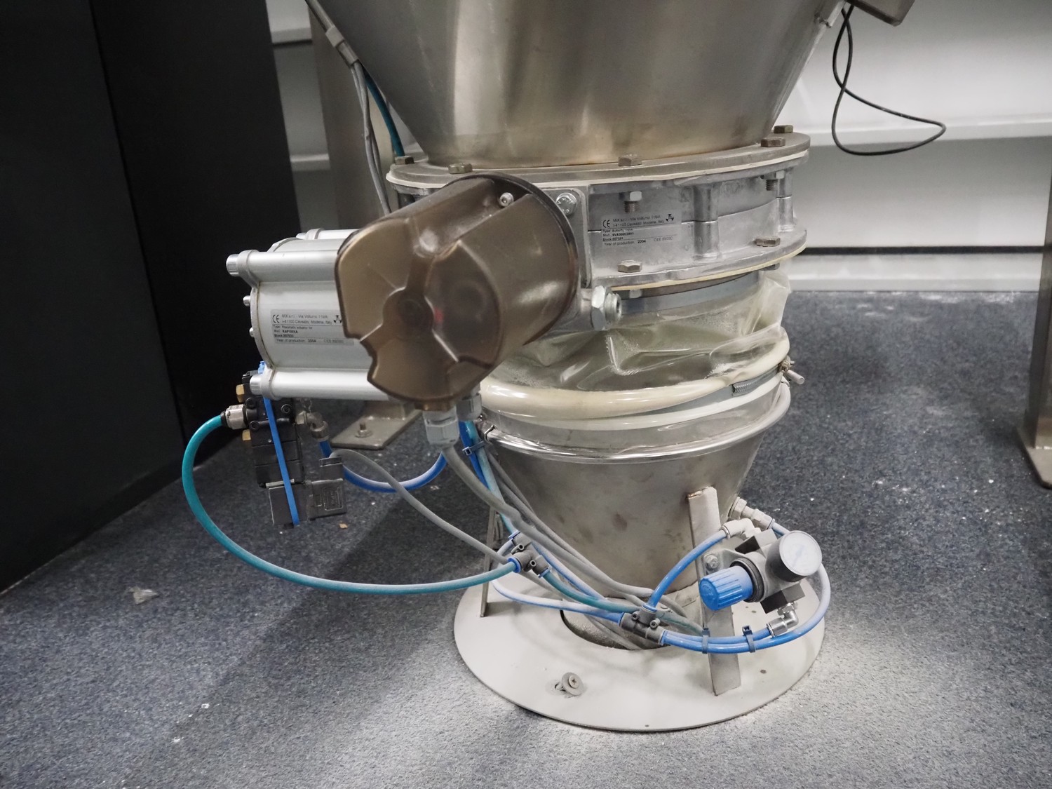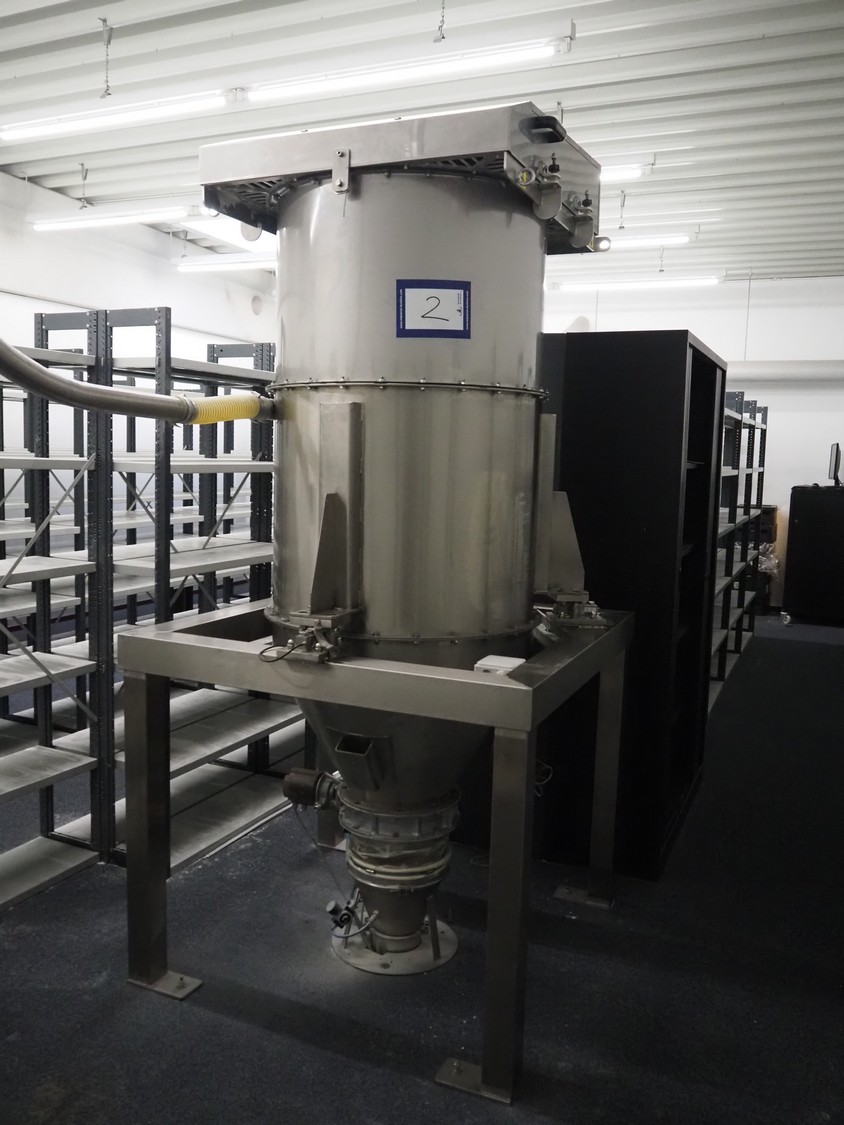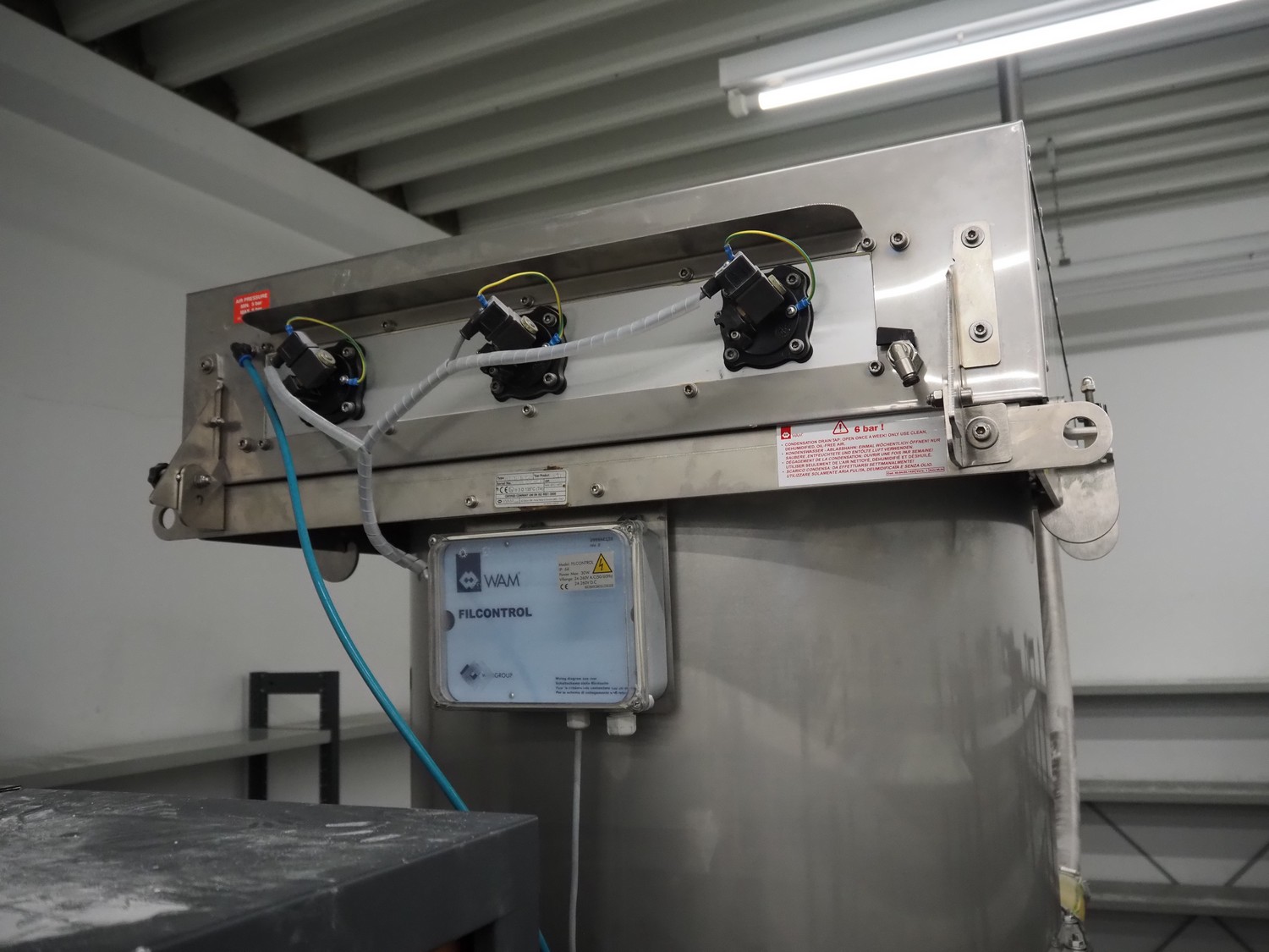 WAM S.p.a. infeed silo on weighing cells with s/s tubular screw conveyor and s/s control panel, type: FNXW3J13VC0471, serial number: T FN C 05602, year of construction: 2005, dimensions infeed silo: 1200 mm x 1200 mm x 2500 mm, length tubular screw conveyor: 5400 mm, control panel with Siemens Simatic HMI touch screen, dimensions control panel: 400 mm x 220 mm x 600 mm. Must be dismantled in parts to get it out of the factory.
