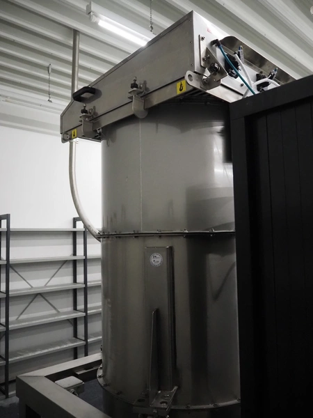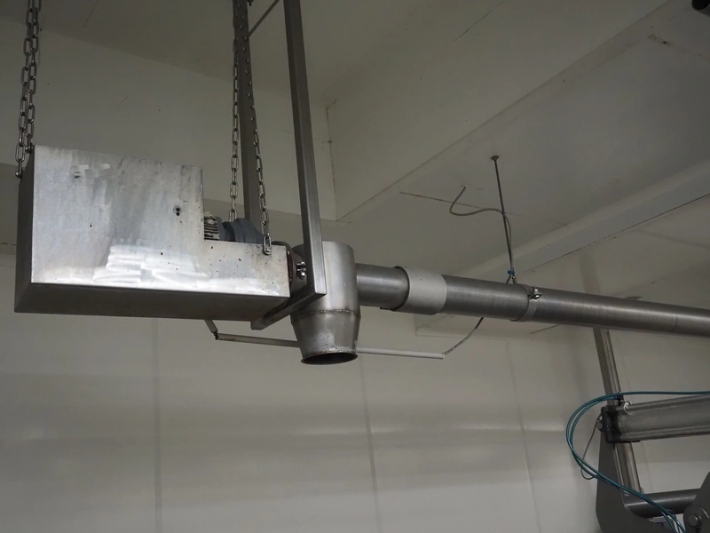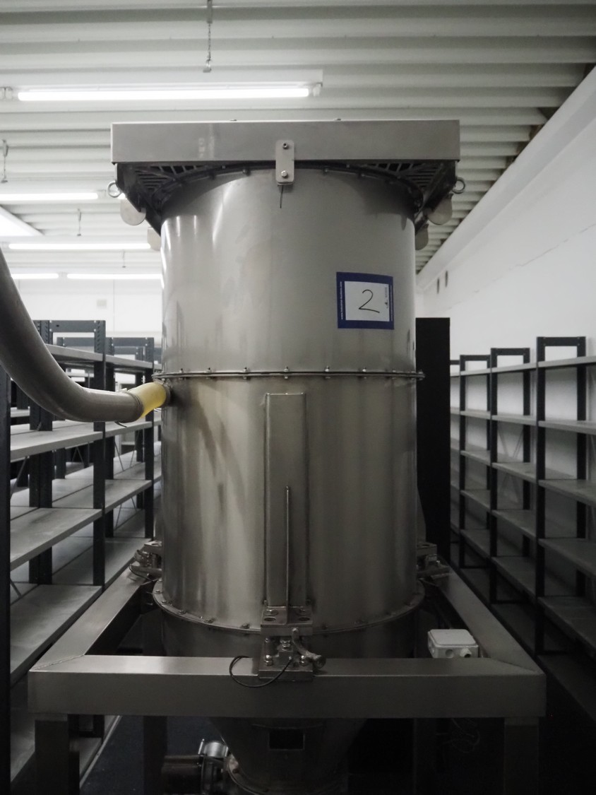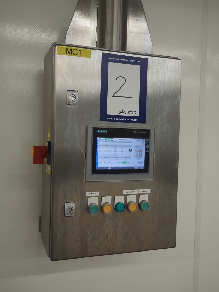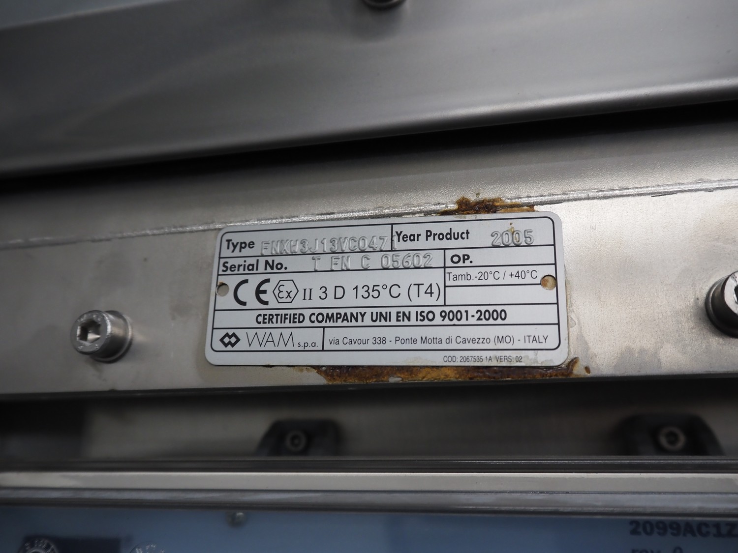 WAM S.p.a. infeed silo on weighing cells with s/s tubular screw conveyor and s/s control panel, type: FNXW3J13VC0471, serial number: T FN C 05602, year of construction: 2005, dimensions infeed silo: 1200 mm x 1200 mm x 2500 mm, length tubular screw conveyor: 5400 mm, control panel with Siemens Simatic HMI touch screen, dimensions control panel: 400 mm x 220 mm x 600 mm. Must be dismantled in parts to get it out of the factory.