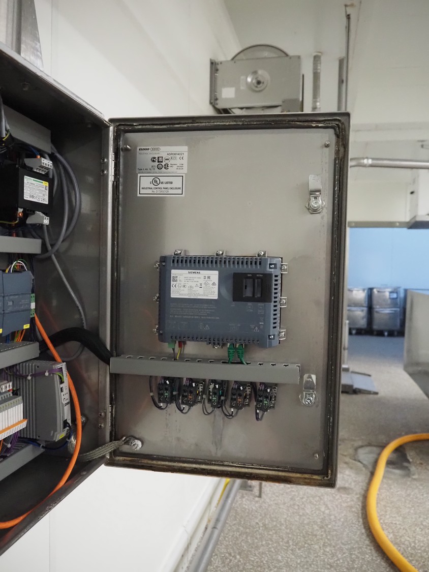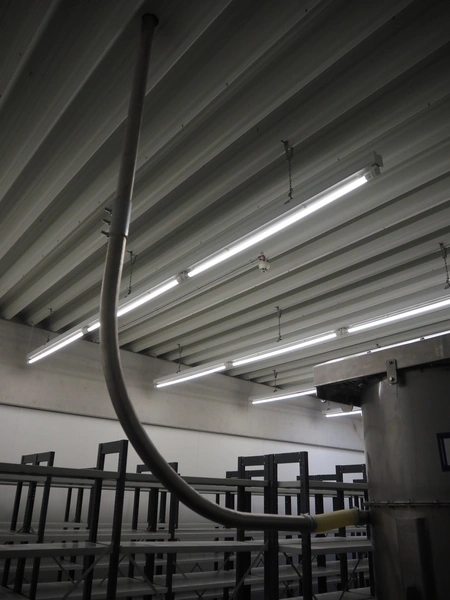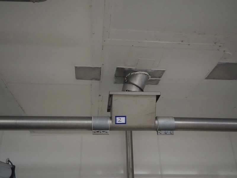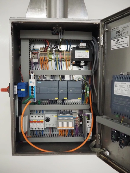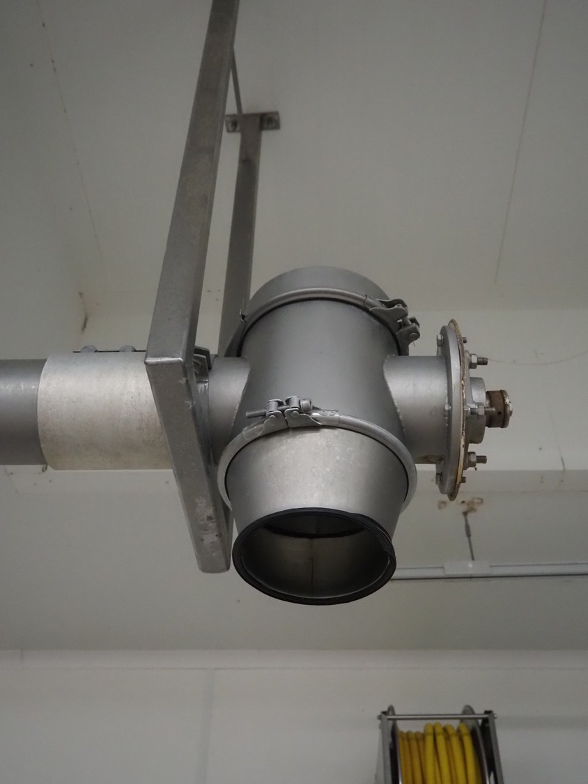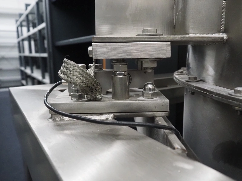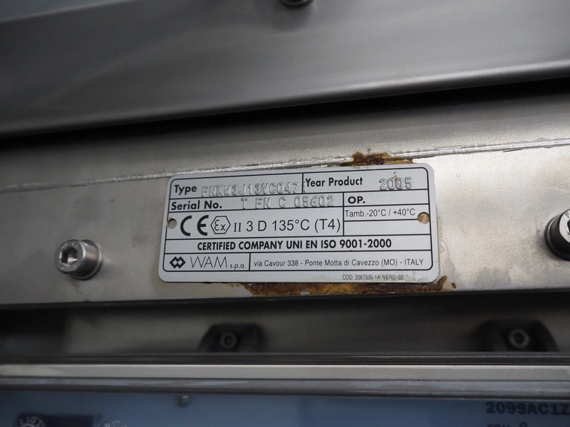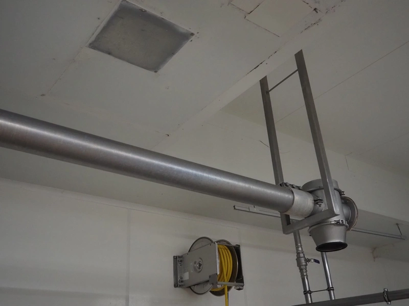 WAM S.p.a. infeed silo on weighing cells with s/s tubular screw conveyor and s/s control panel, type: FNXW3J13VC0471, serial number: T FN C 05602, year of construction: 2005, dimensions infeed silo: 1200 mm x 1200 mm x 2500 mm, length tubular screw conveyor: 5400 mm, control panel with Siemens Simatic HMI touch screen, dimensions control panel: 400 mm x 220 mm x 600 mm. Must be dismantled in parts to get it out of the factory.