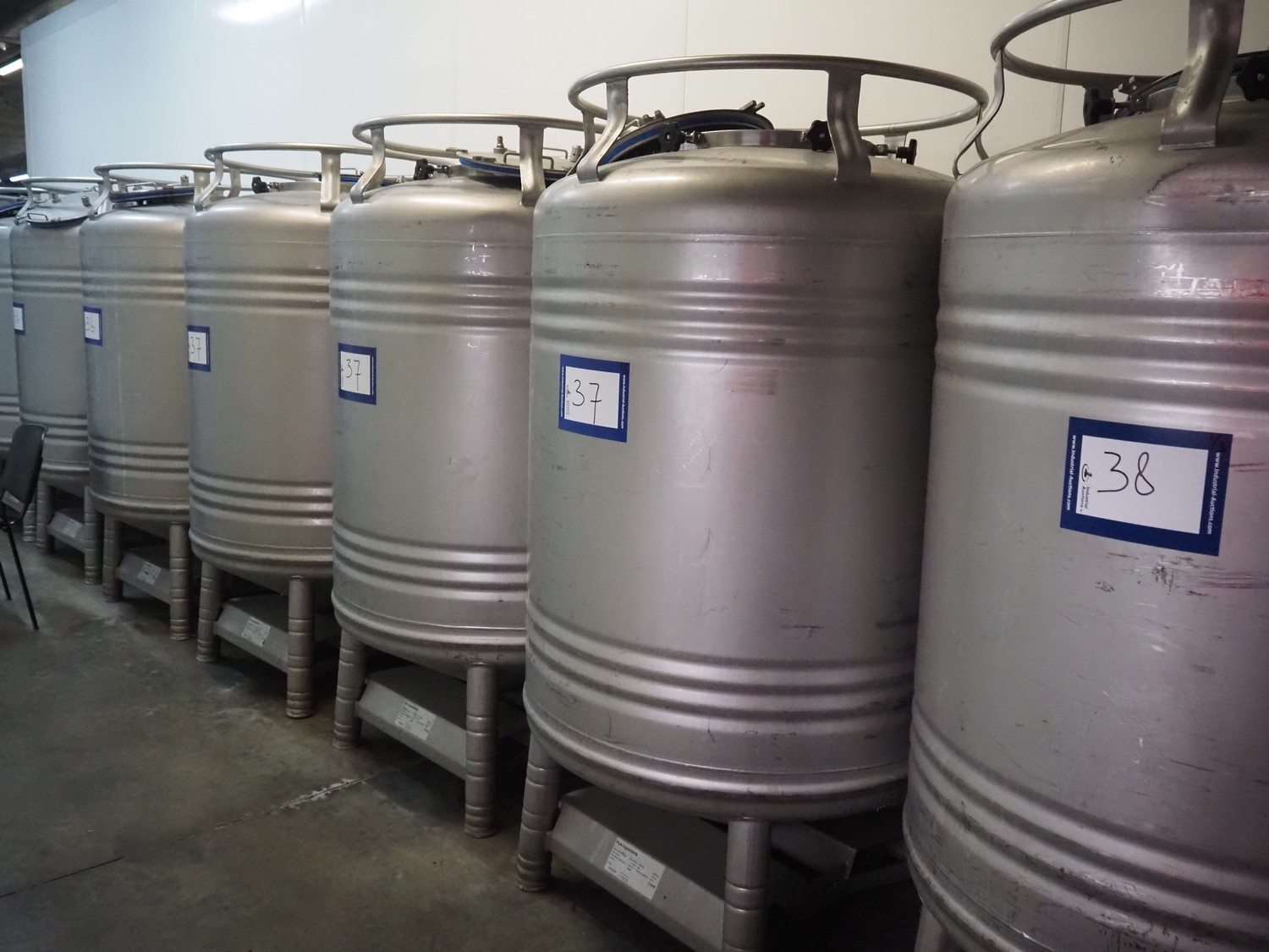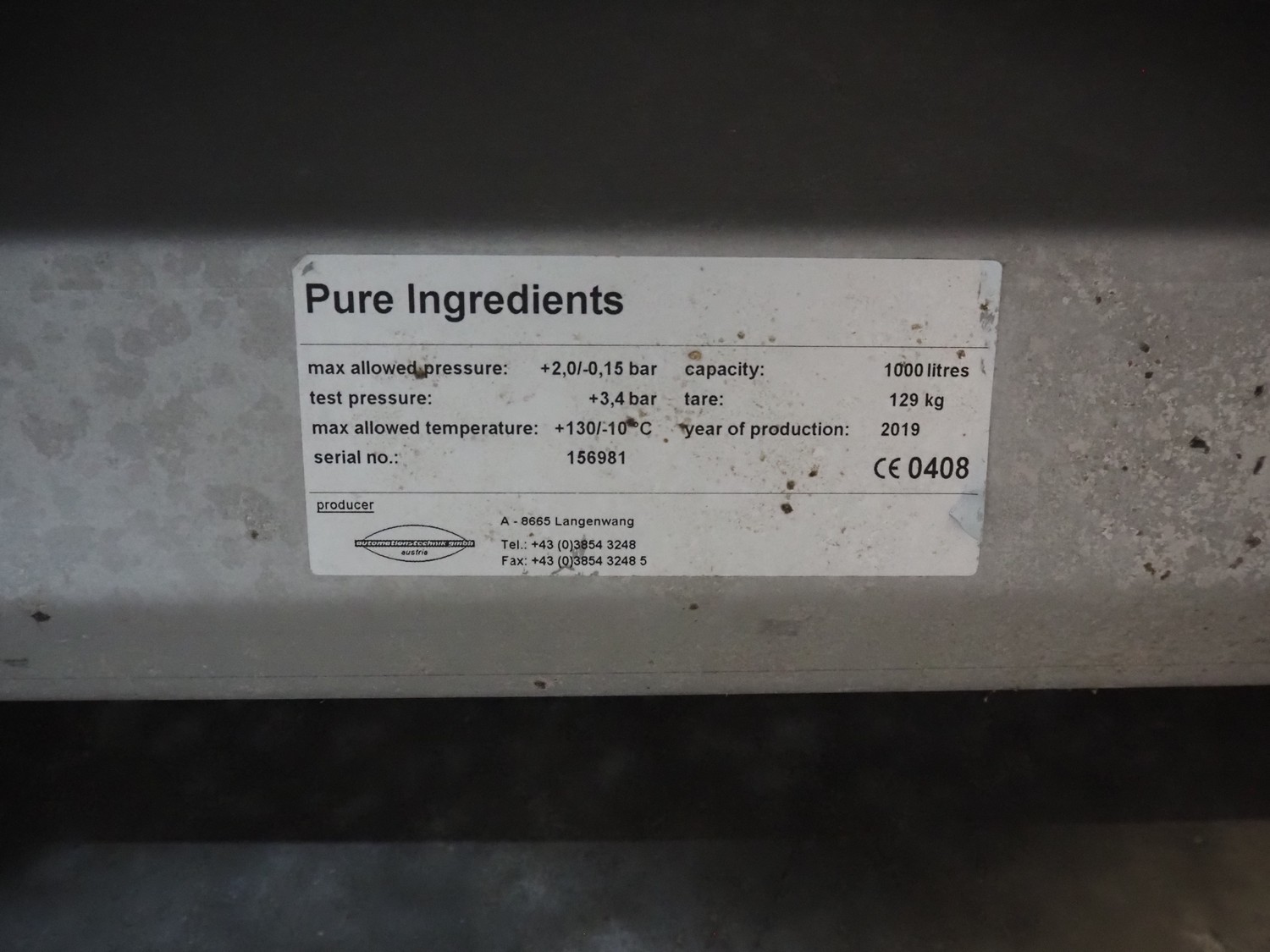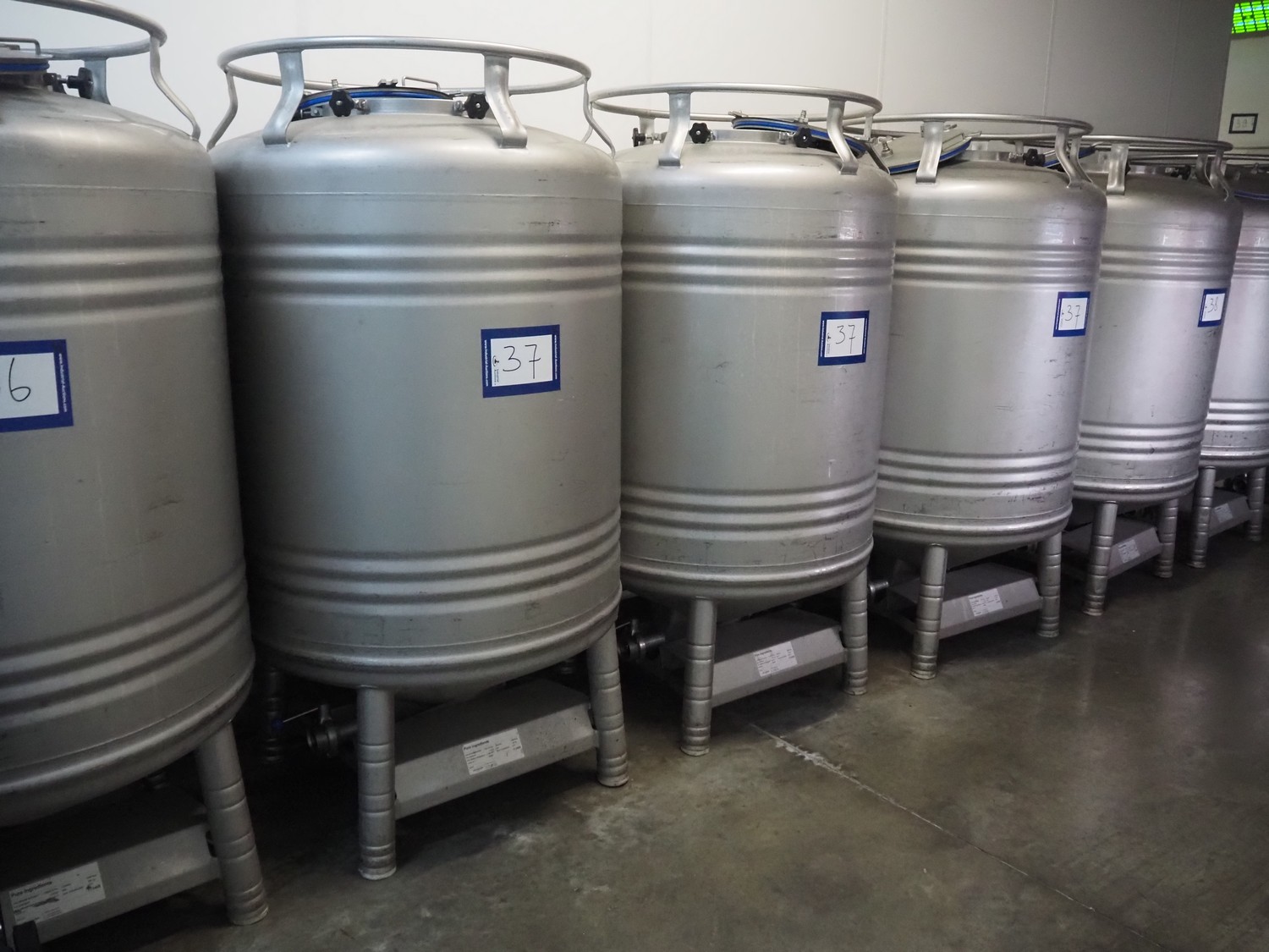 3 pcs. Automationstechnik GmbH s/s tanks, year of construction: 2019, maximum allowed pressure: + 2.0 bar / -0.15 bar, test pressure: +3.4 bar, maximum allowed pressure: +130 / -10˚C, capacity: (3x) 1000 liter, dimensions: (3x) 1000 mm x 1000 mm x 1850 mm.