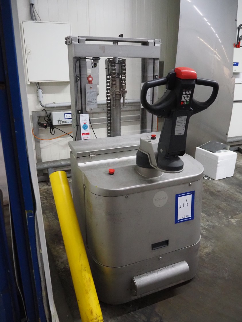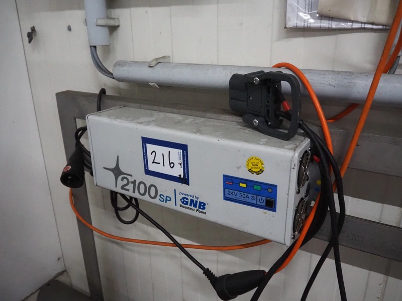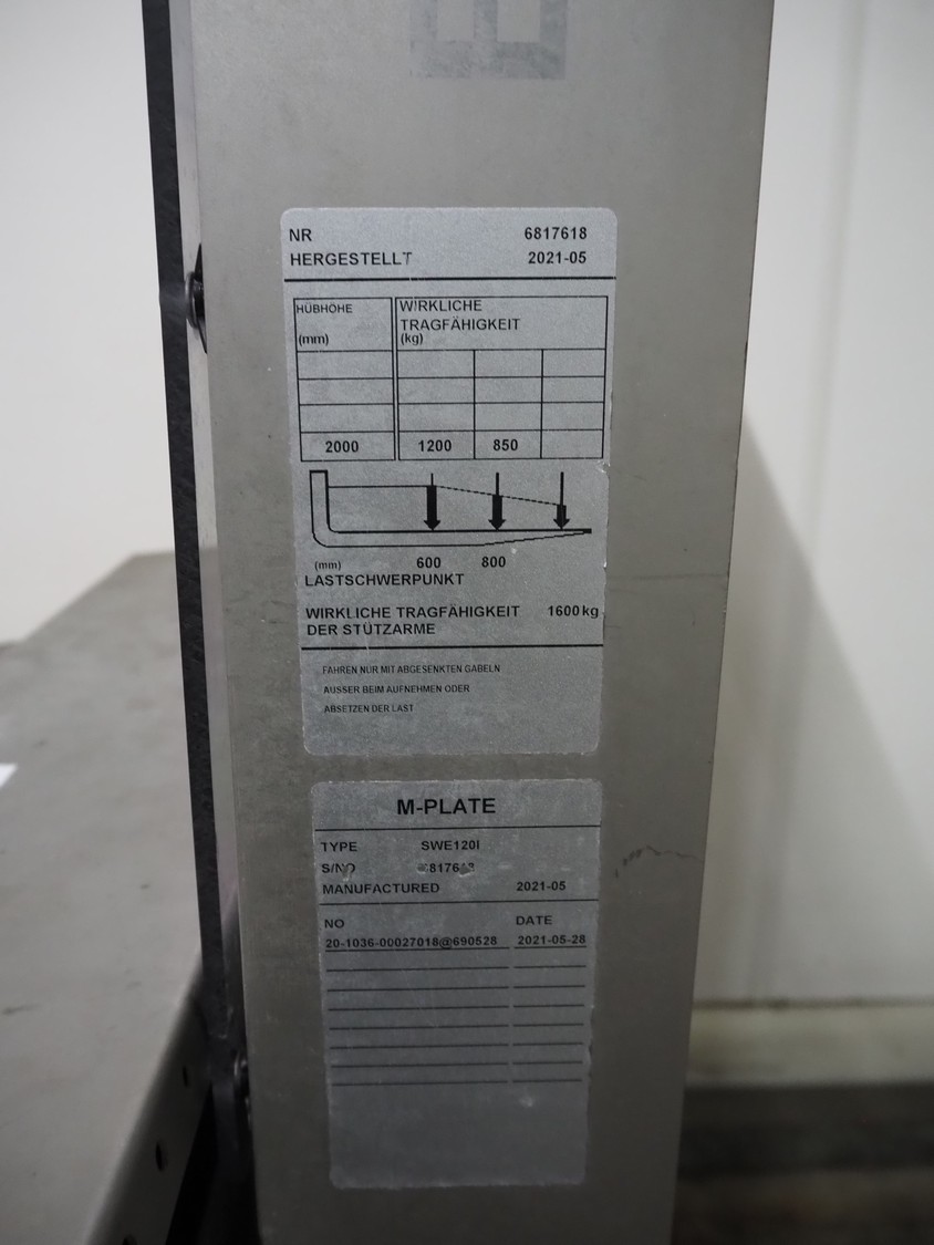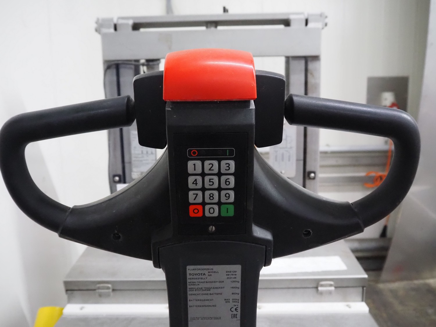 Toyota s/s electrical pallet lifter, model: SWE120i, number: 6917618, year of construction: 05-2021, capacity: 1600 kg, lifting height: 2000 mm, fork length: 1140 mm, total dimensions: 2100 mm x 800 mm x 1670 mm. Including GNB Industrial Power battery charger, type: 2100 SP, dimensions charger: 440 mm x 100 mm x 170 mm. Technical condition unknown.