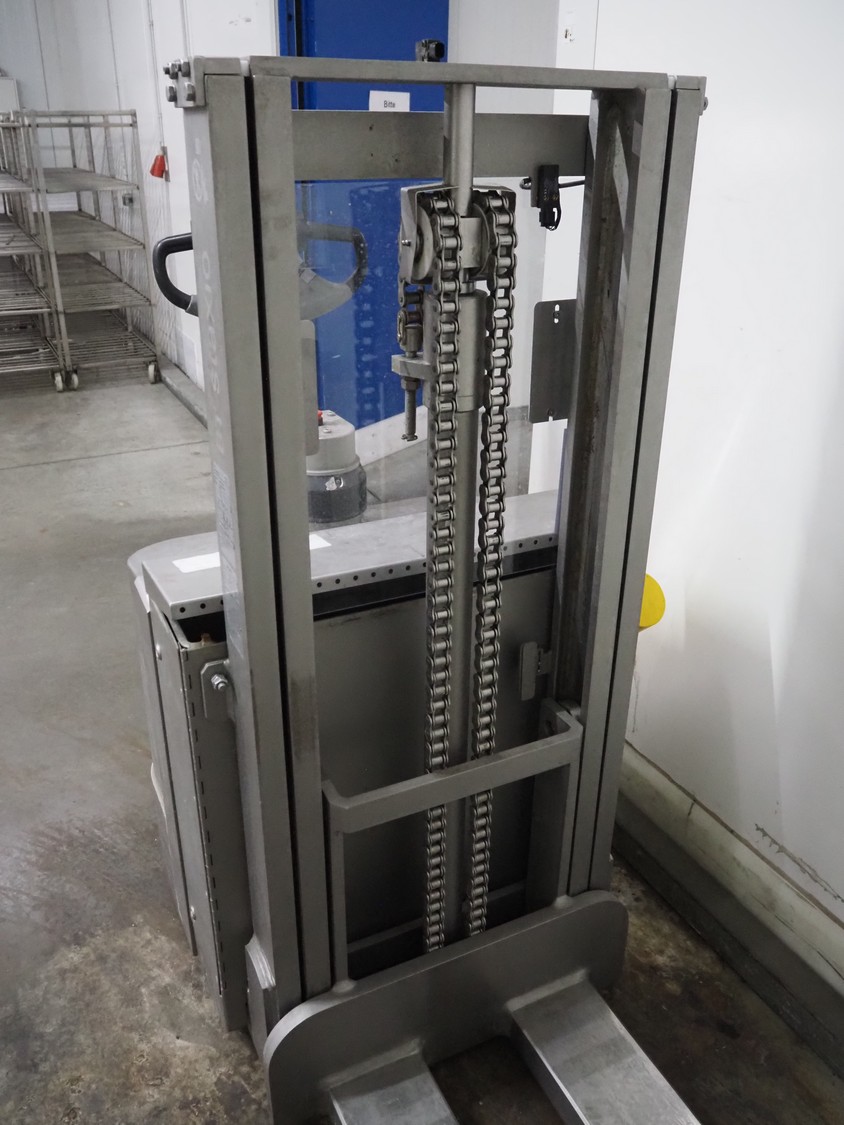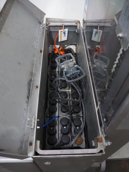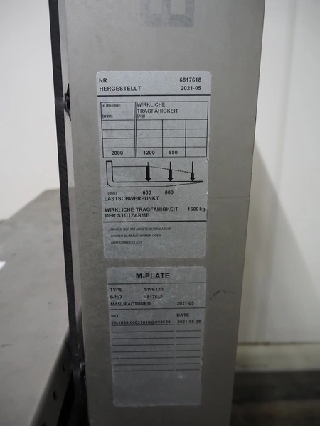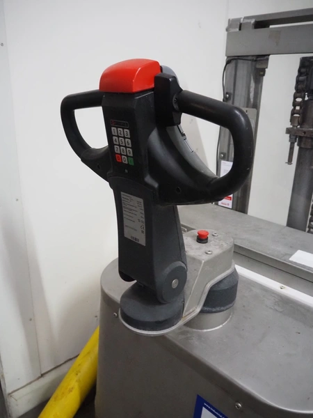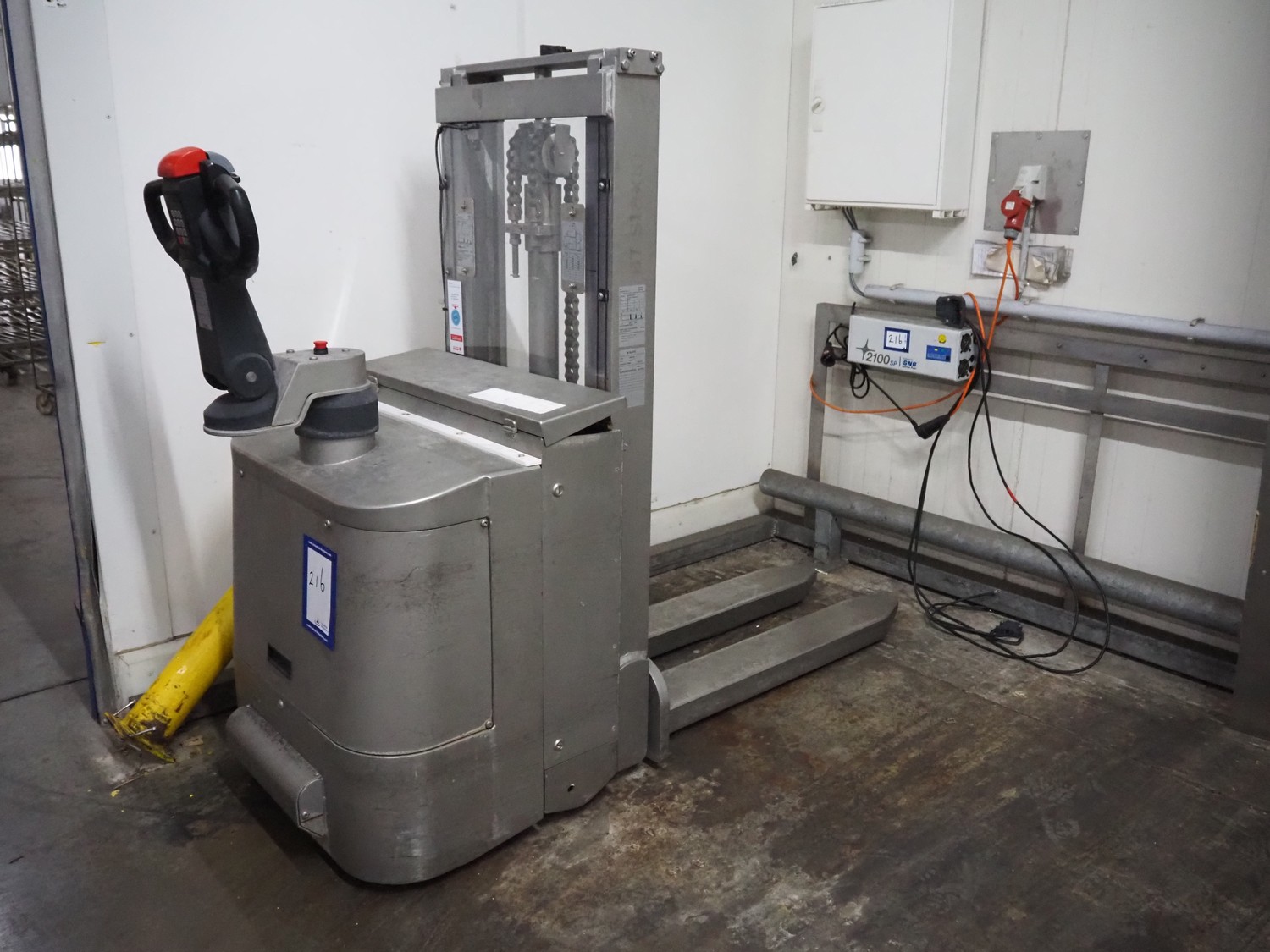 Toyota s/s electrical pallet lifter, model: SWE120i, number: 6917618, year of construction: 05-2021, capacity: 1600 kg, lifting height: 2000 mm, fork length: 1140 mm, total dimensions: 2100 mm x 800 mm x 1670 mm. Including GNB Industrial Power battery charger, type: 2100 SP, dimensions charger: 440 mm x 100 mm x 170 mm. Technical condition unknown.