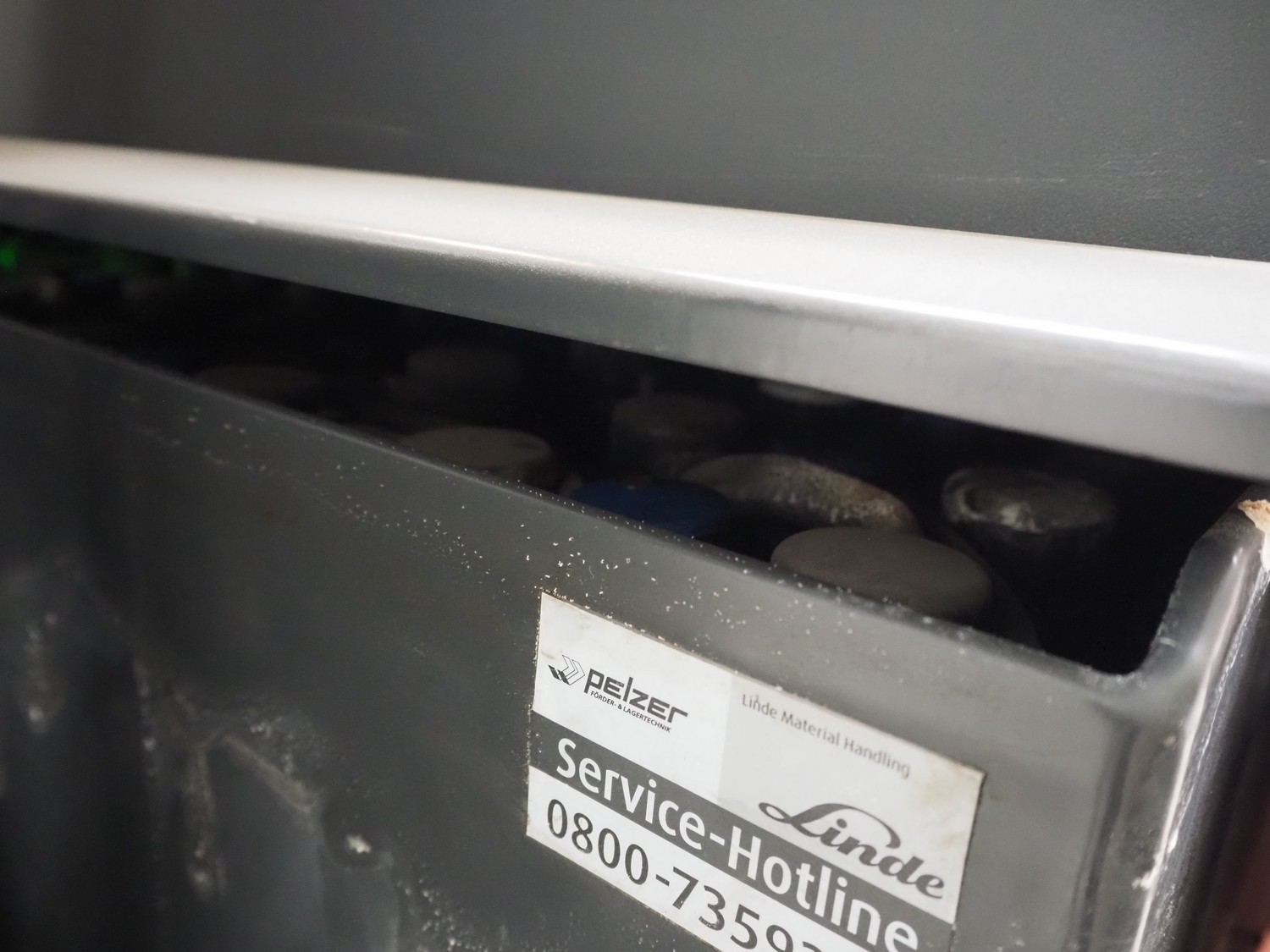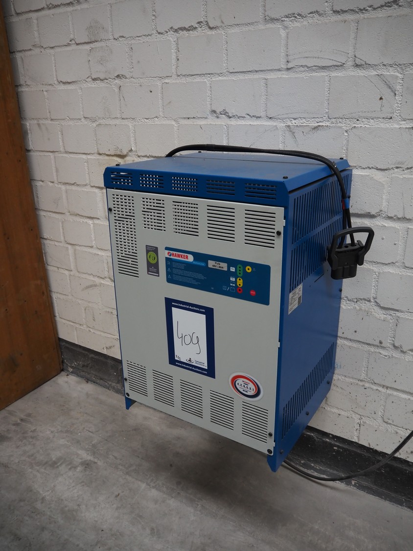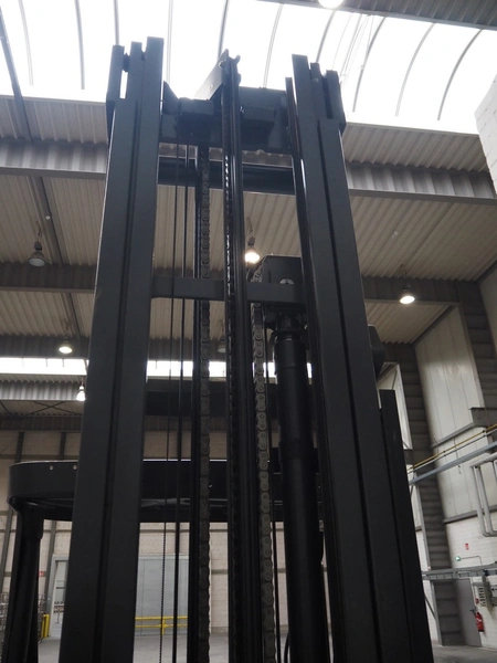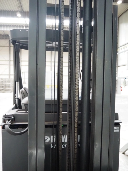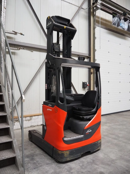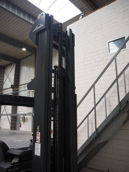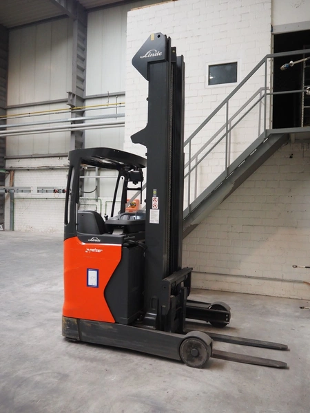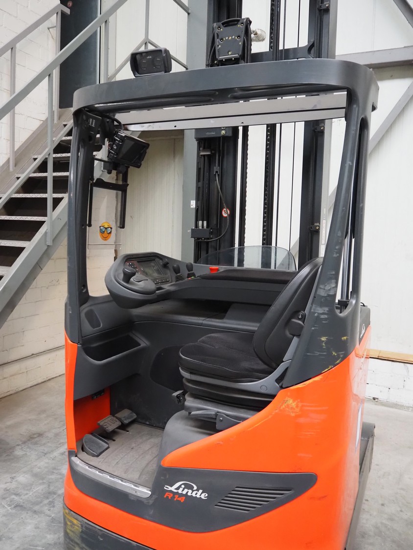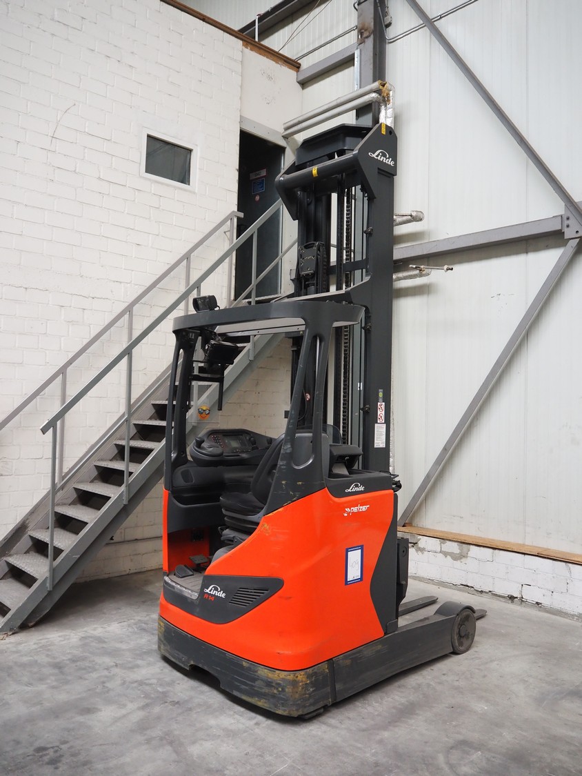 Linde Material Handling reach truck, model: R14 1120, fork length: 1200 mm, maximum lifting height: 8600 mm, total dimensions: 1400 mm x 2500 mm x 3350 mm. Including Hawker battery charger, model: Motionline puls, serial number: 0500429-0010-001, year of construction: 01.2018, 400 V, 3 Ph, 50 Hz, 8.87 A, 6.07 kVA, weight: 56 kg, dimensions: 500 mm x 440 mm x 740 mm.