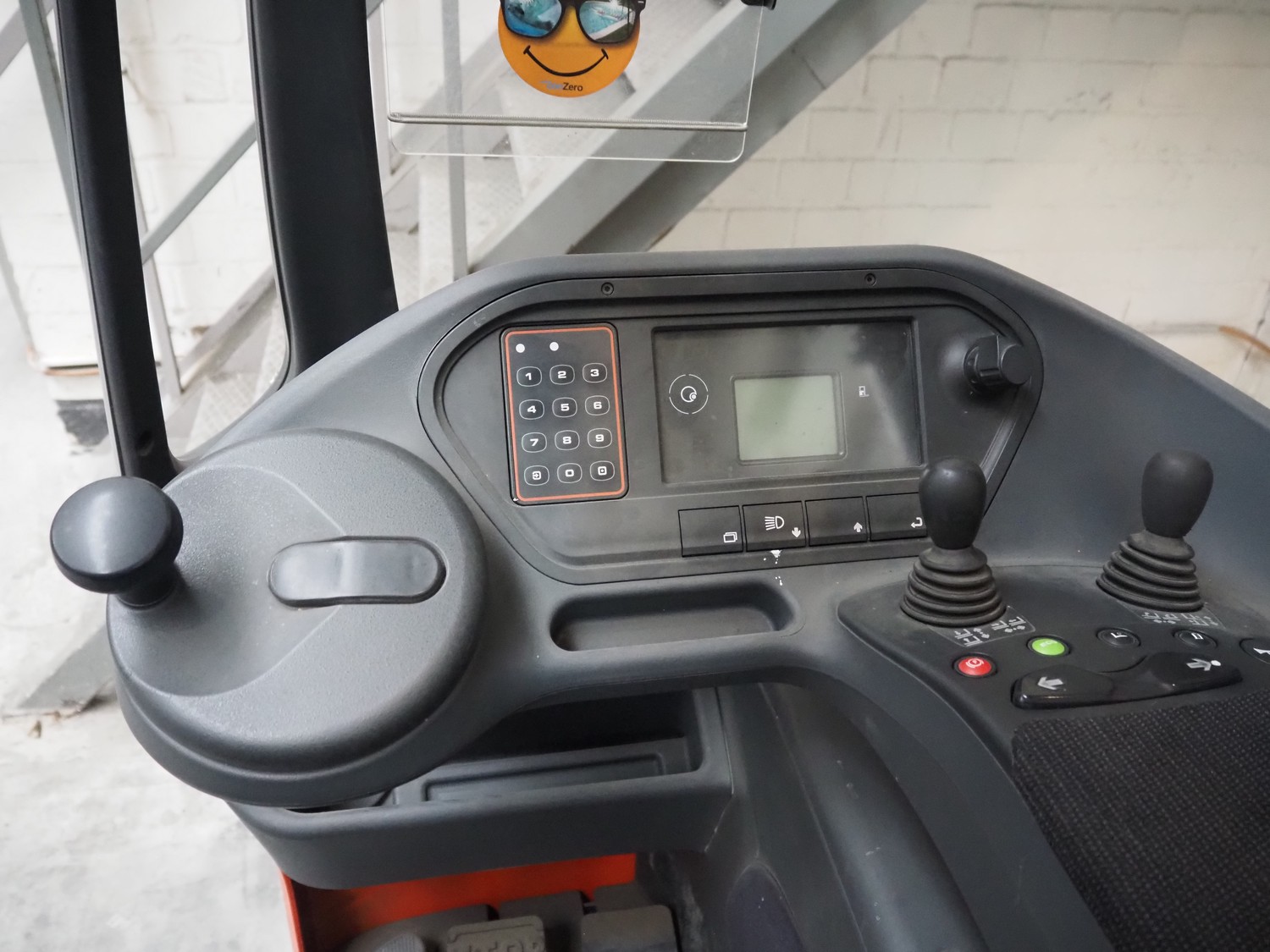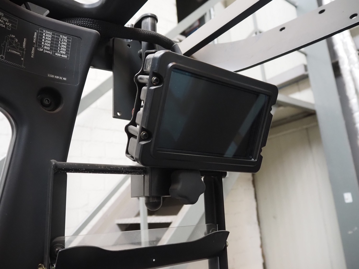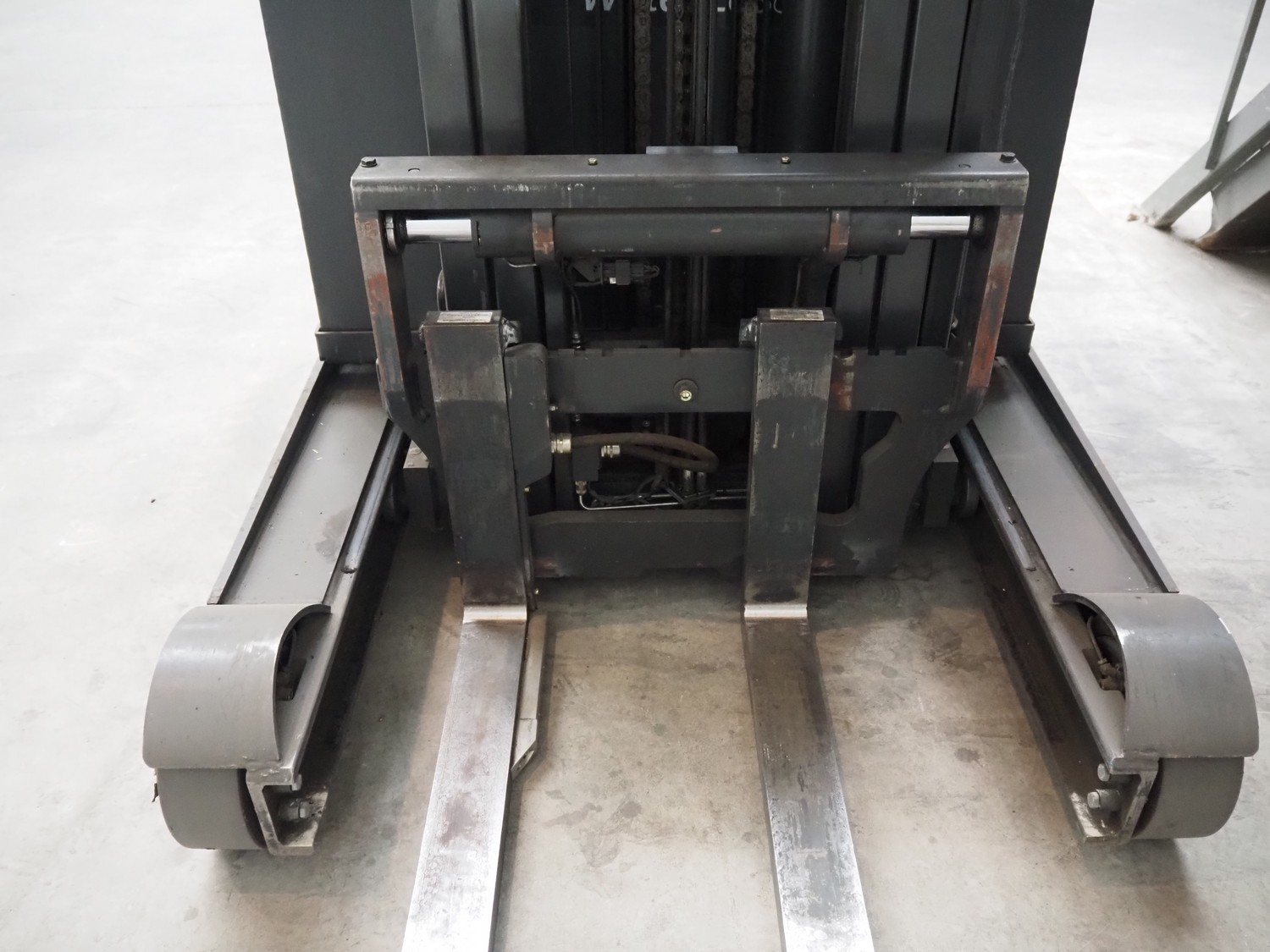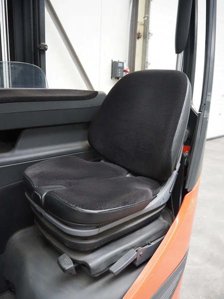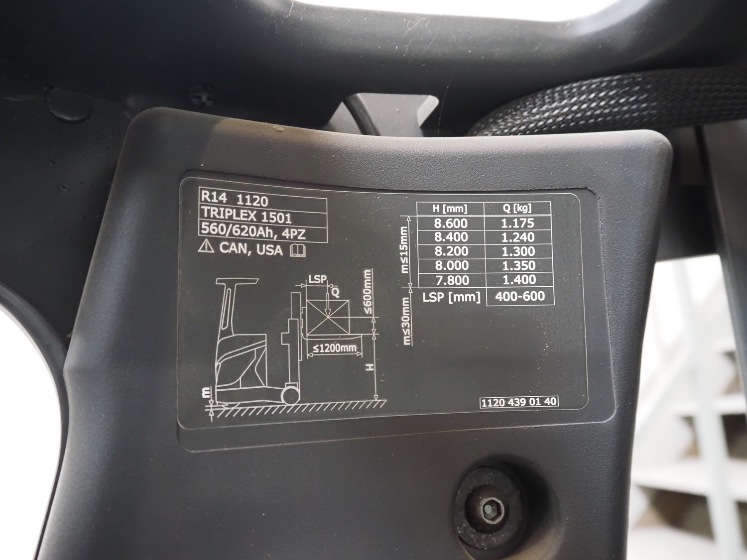 Linde Material Handling reach truck, model: R14 1120, fork length: 1200 mm, maximum lifting height: 8600 mm, total dimensions: 1400 mm x 2500 mm x 3350 mm. Including Hawker battery charger, model: Motionline puls, serial number: 0500429-0010-001, year of construction: 01.2018, 400 V, 3 Ph, 50 Hz, 8.87 A, 6.07 kVA, weight: 56 kg, dimensions: 500 mm x 440 mm x 740 mm.
