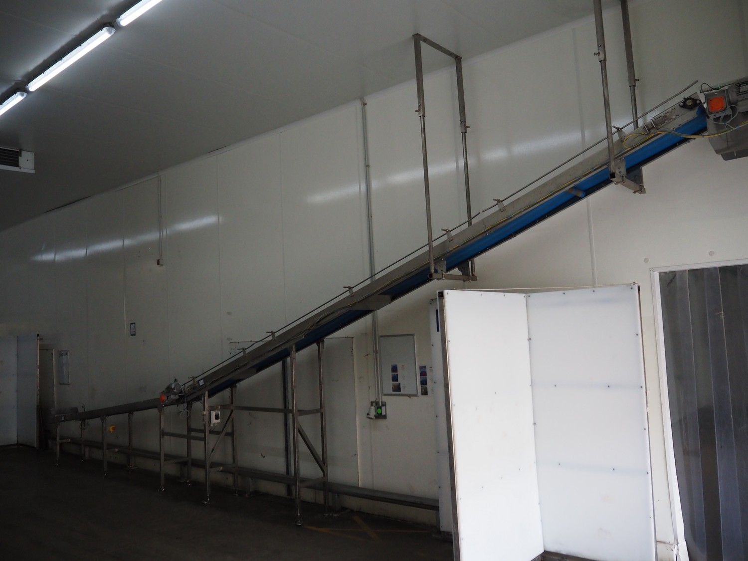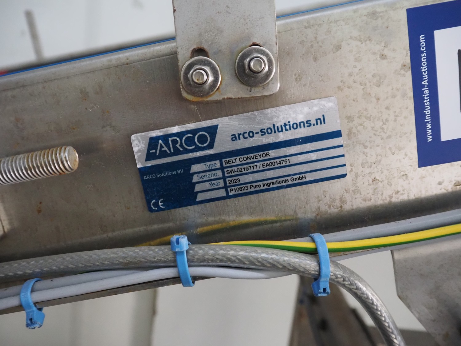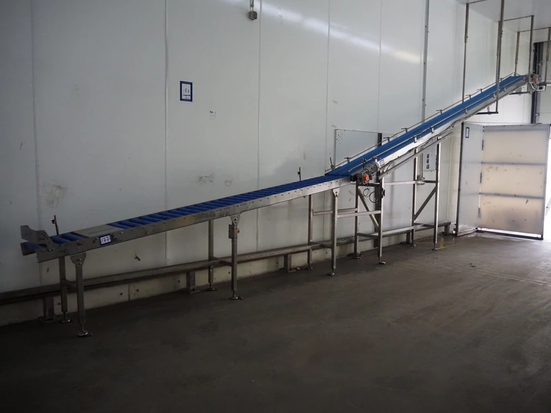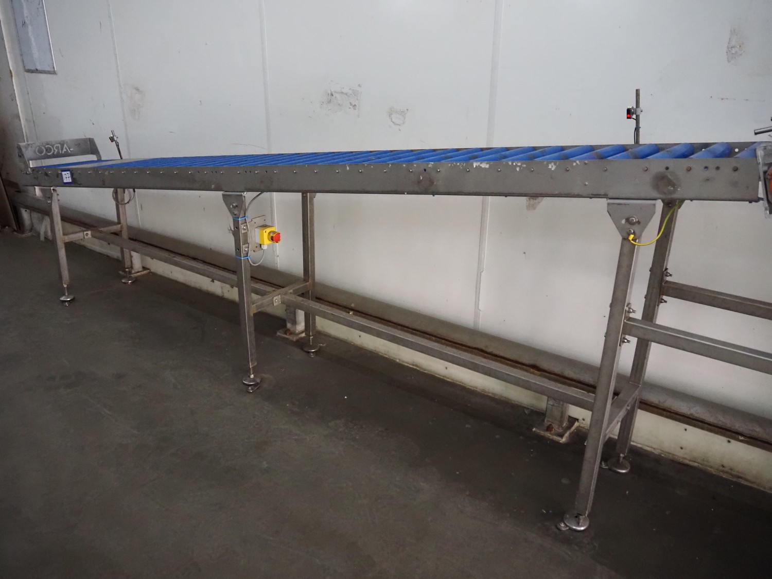 ARCO Solutions BV de-elevating belt with roller conveyor, s/s frames, type de-elevating belt: BELT CONVEYOR, serial number: SW-0219717 / EA0014751, year of construction: 2023, plastic belt, belt width: 400 mm, total dimensions de-elevating belt: 6000 mm x 750 mm x 3300 mm, plastic rollers, roller width: 410 mm, total dimensions roller conveyor: 3600 mm x 500 mm x 1250 mm.